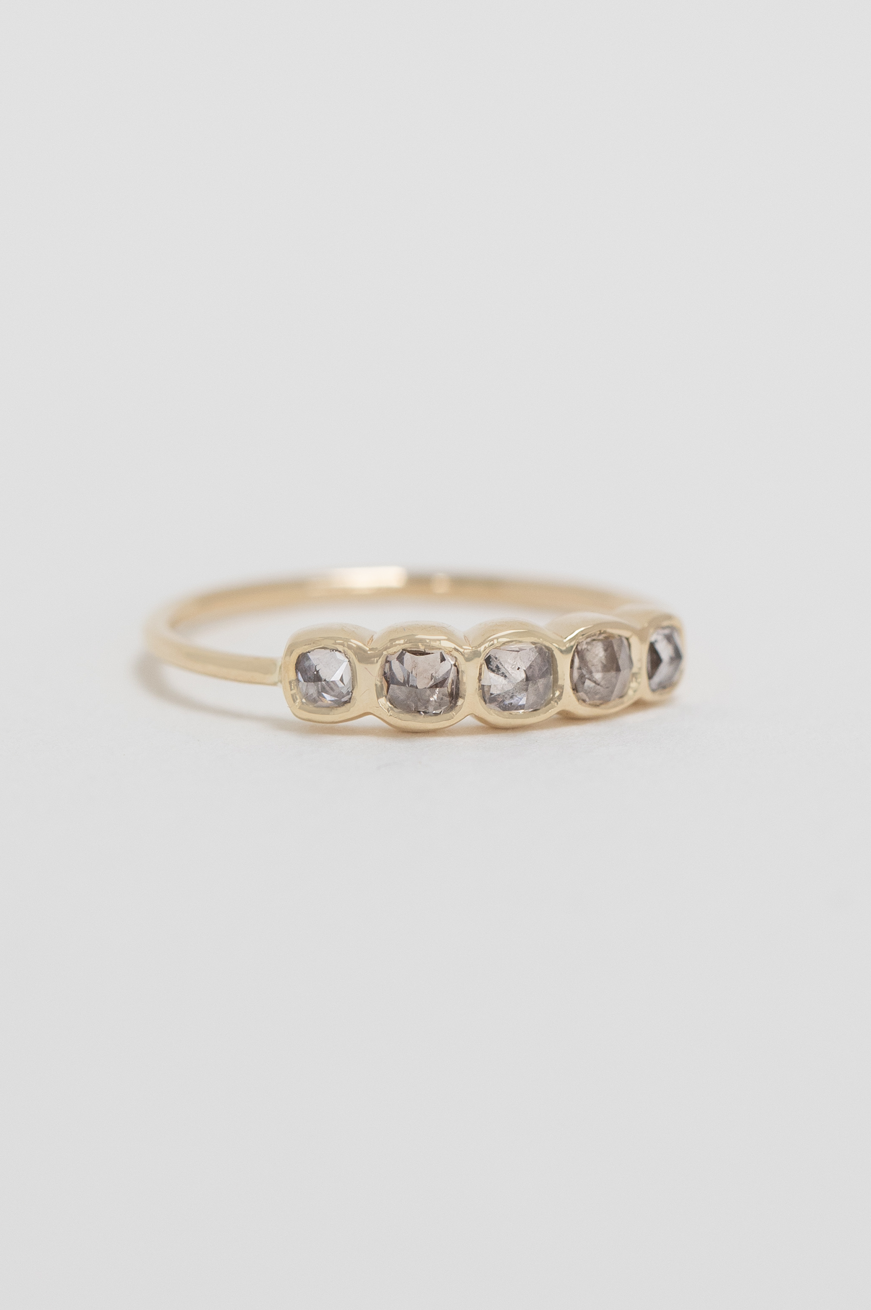 Celine Daoust 14k light yellow gold multi rose cut ring with five pinkish grey diamonds. The stones come in a gradient of light grey and light pink.