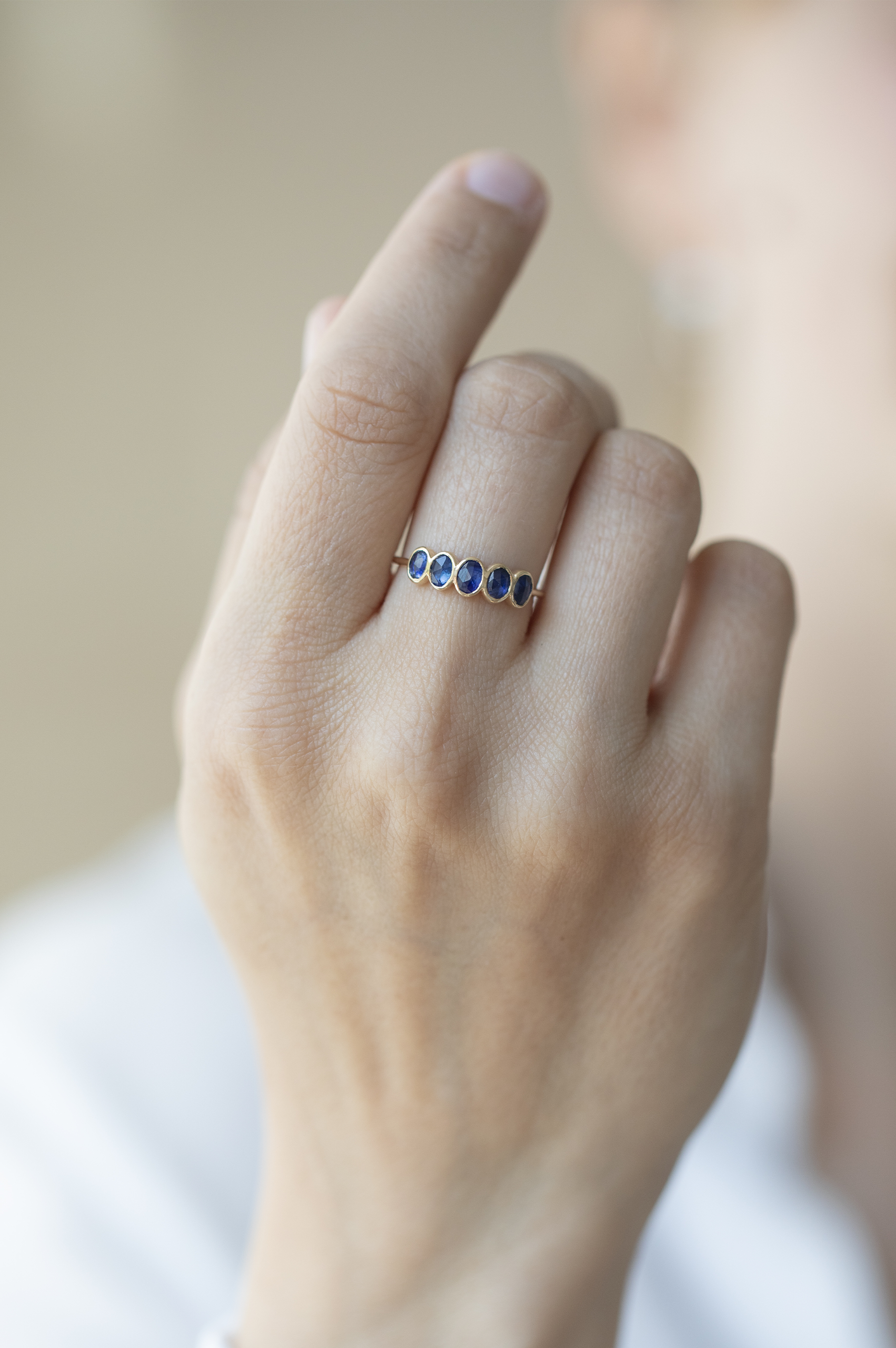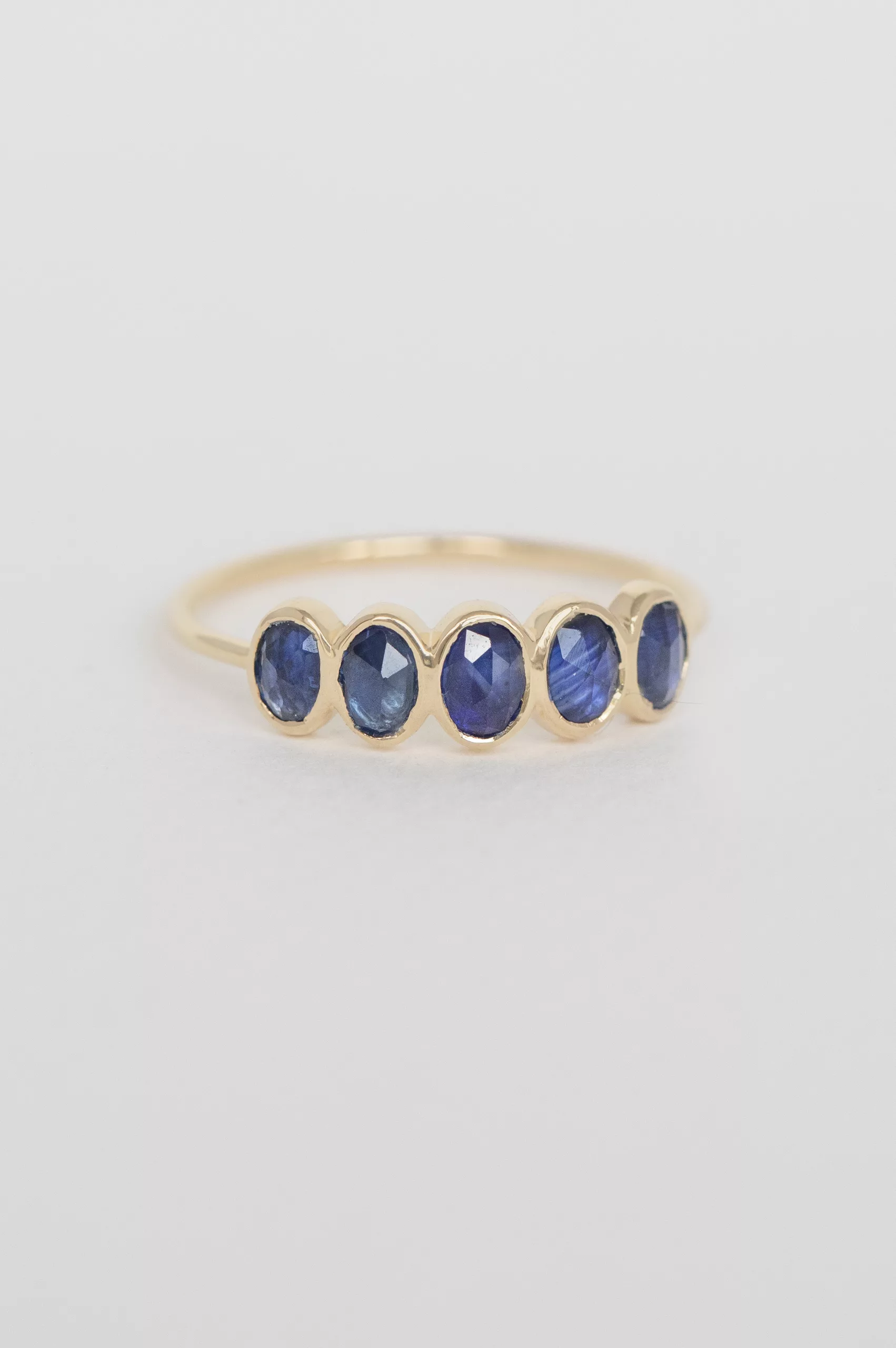 Céline Daoust 14k light yellow gold multi ring with five sapphires. The stones come in a gradient of dark blue.