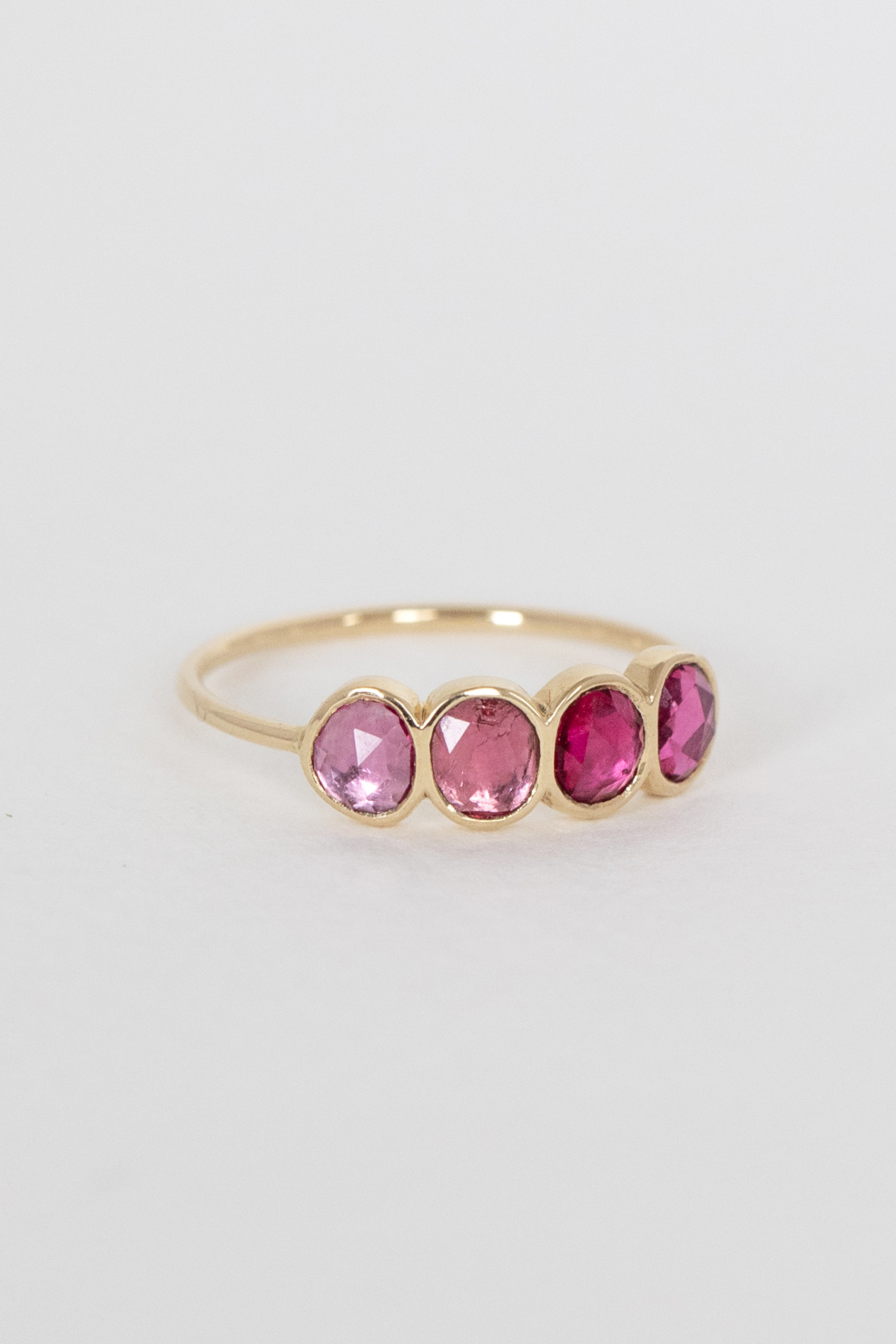 Celine daoust 14k light yellow gold multi ring with four spinels. The stones come in a gradient of vivid pink.