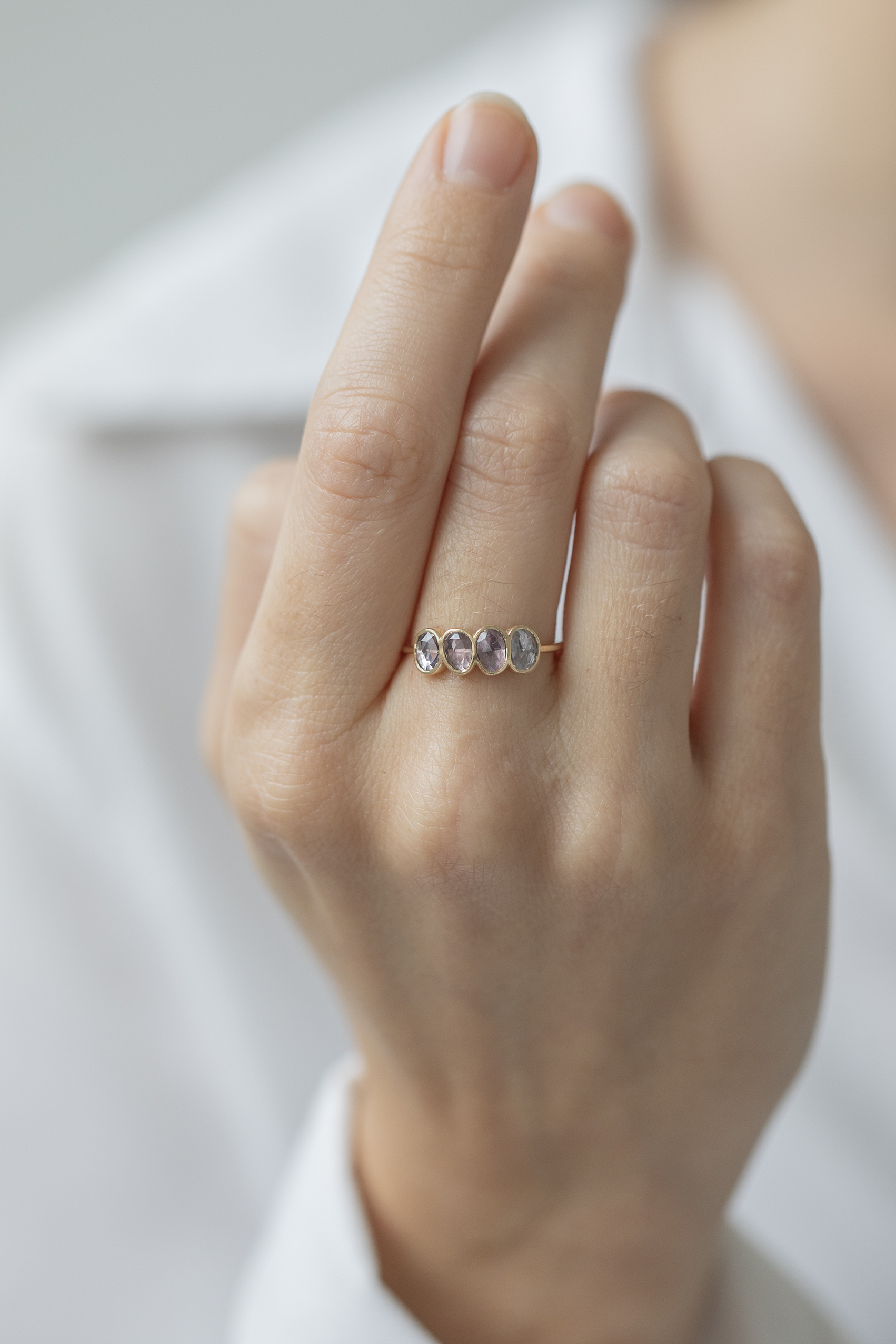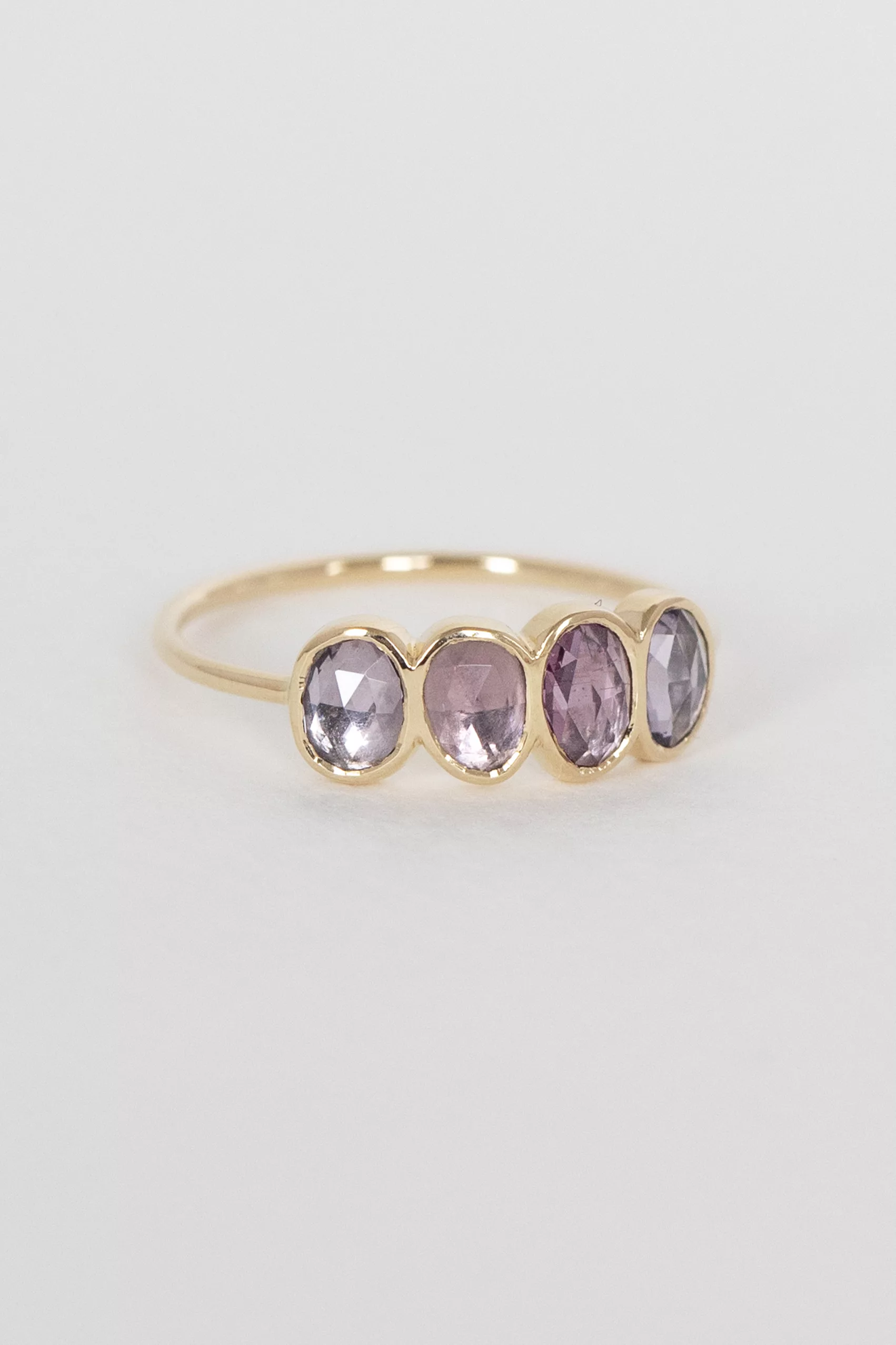 Celine daoust 14k light yellow gold multi ring with four spinels. The stones come in a gradient of pink and purple.