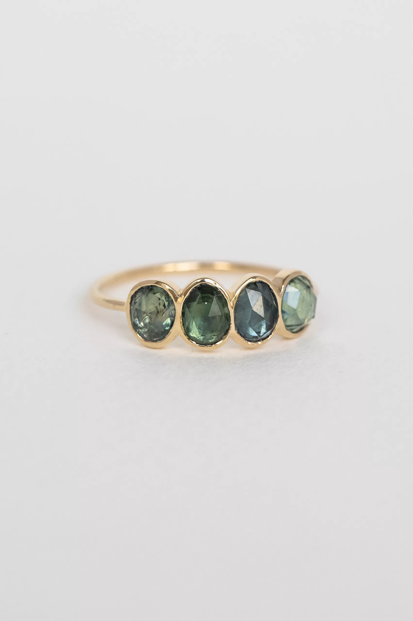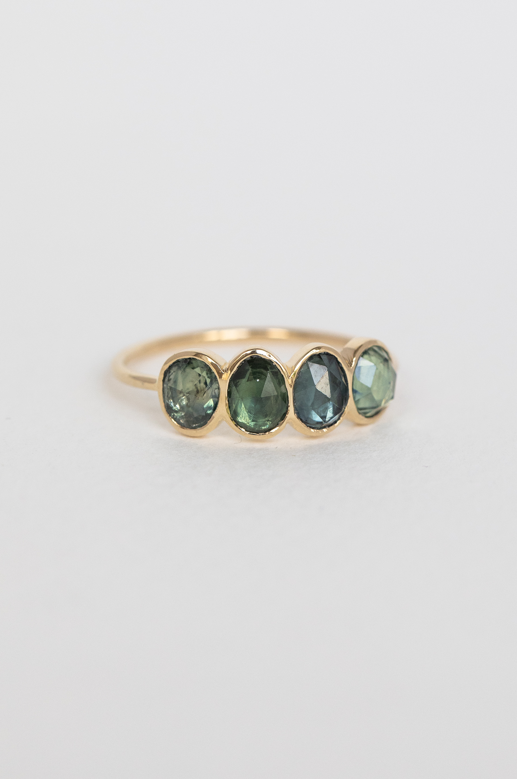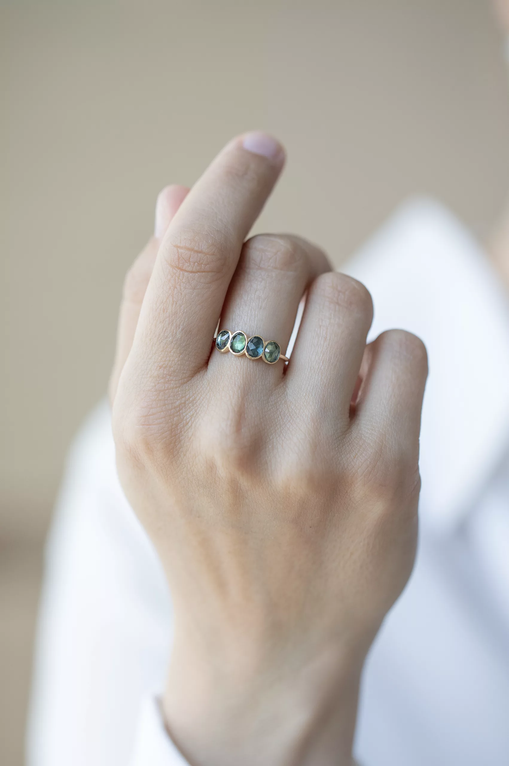 Céline Daoust 14k light yellow gold ring with four turquoise tourmalines. The stones come in a gradient of dark blue and green.