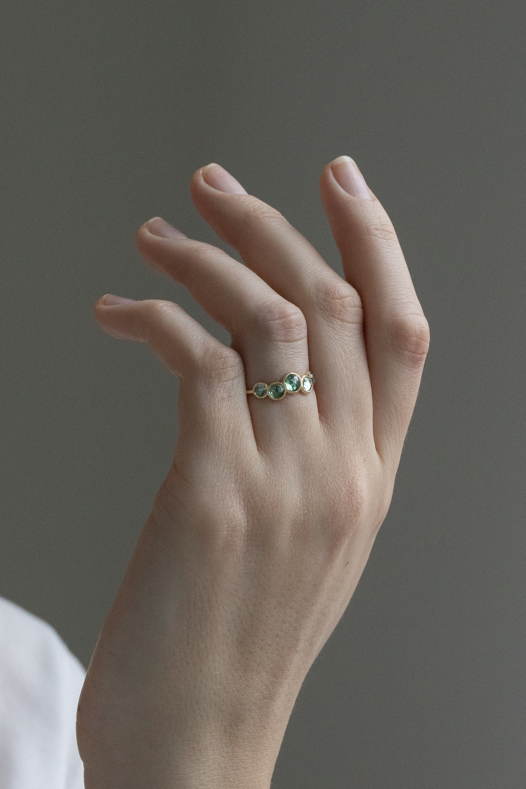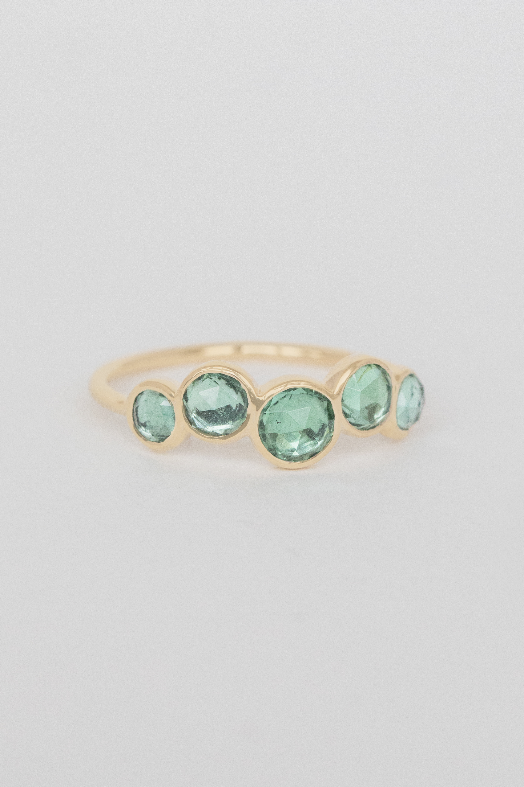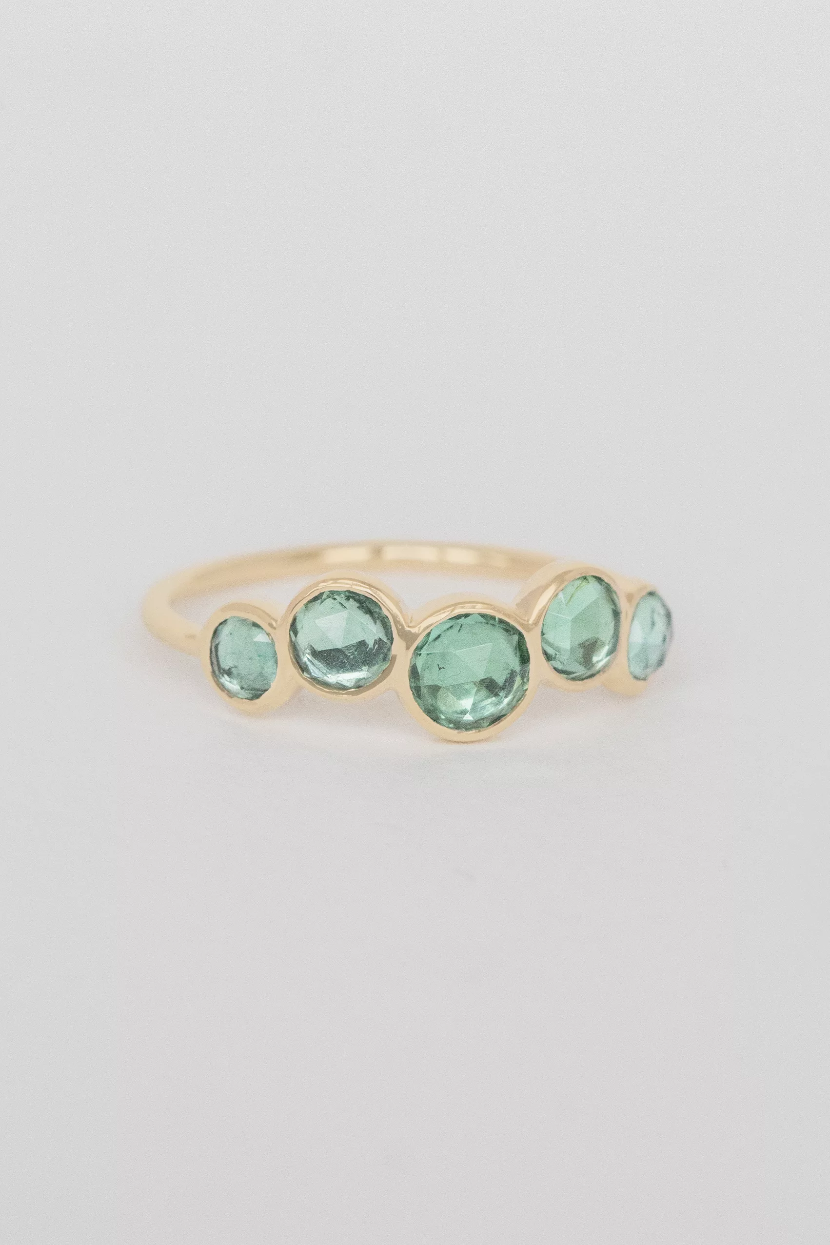 Céline Daoust 14k light yellow gold ring with five green tourmalines. The stones come in a gradient of dark and light turquoise.