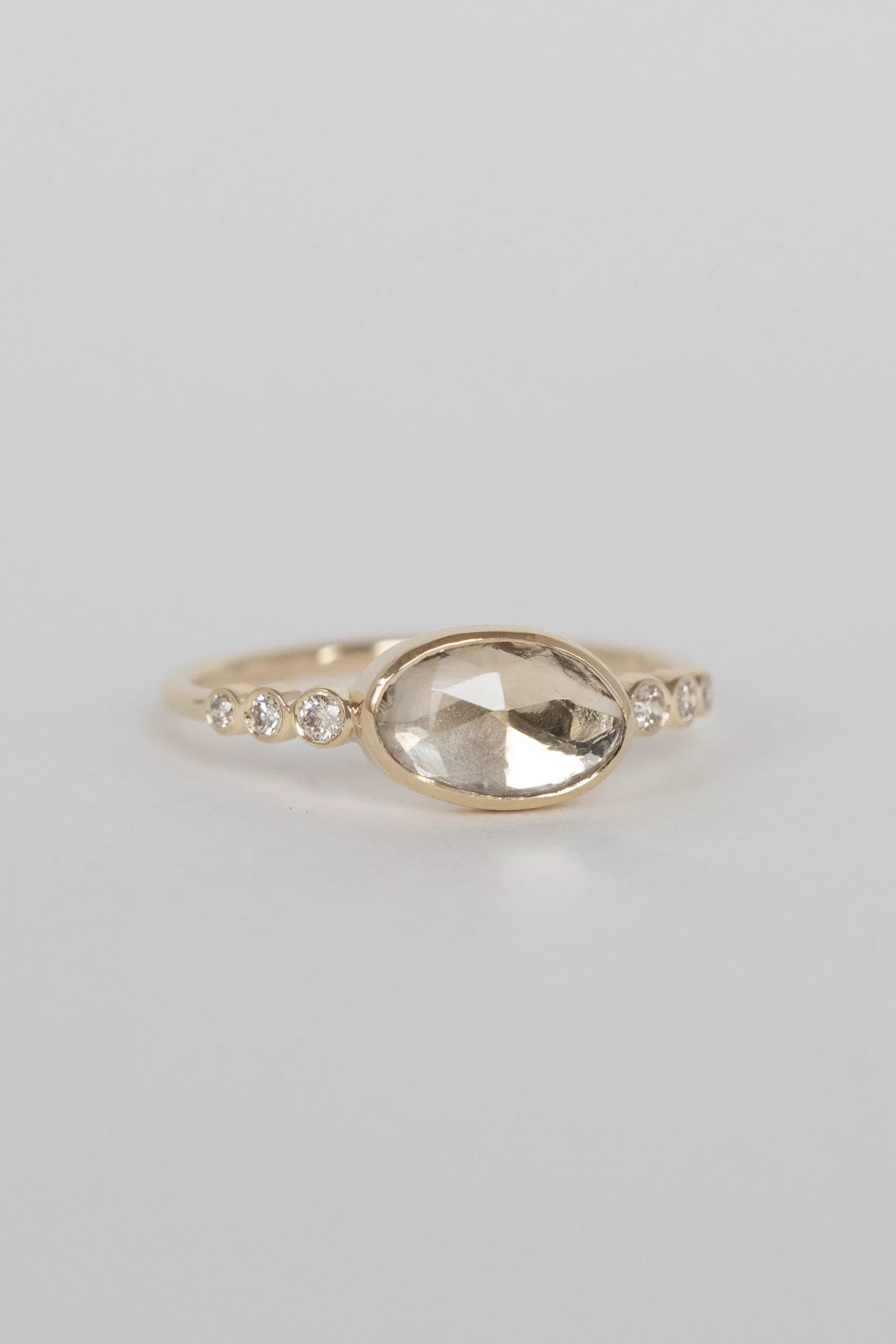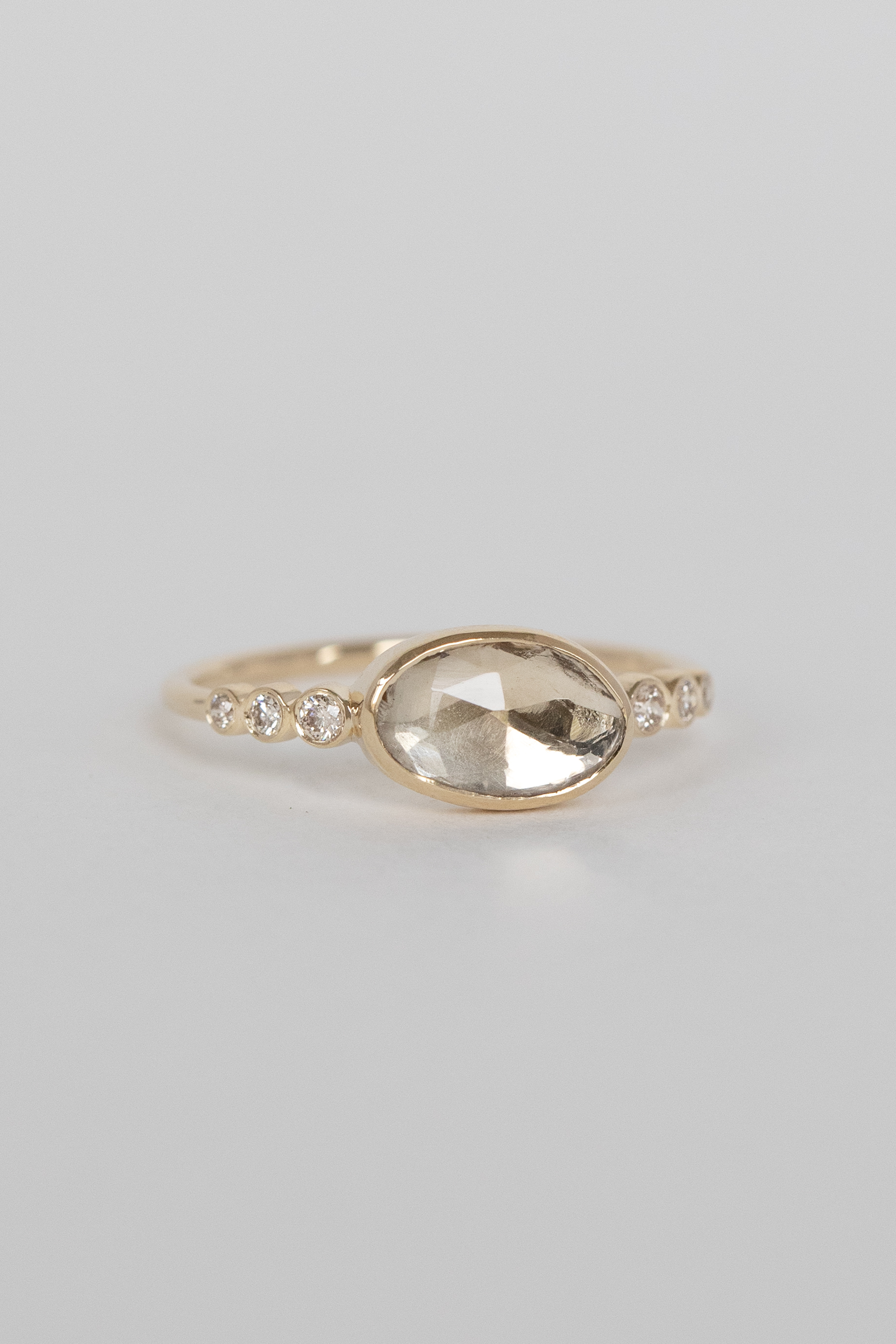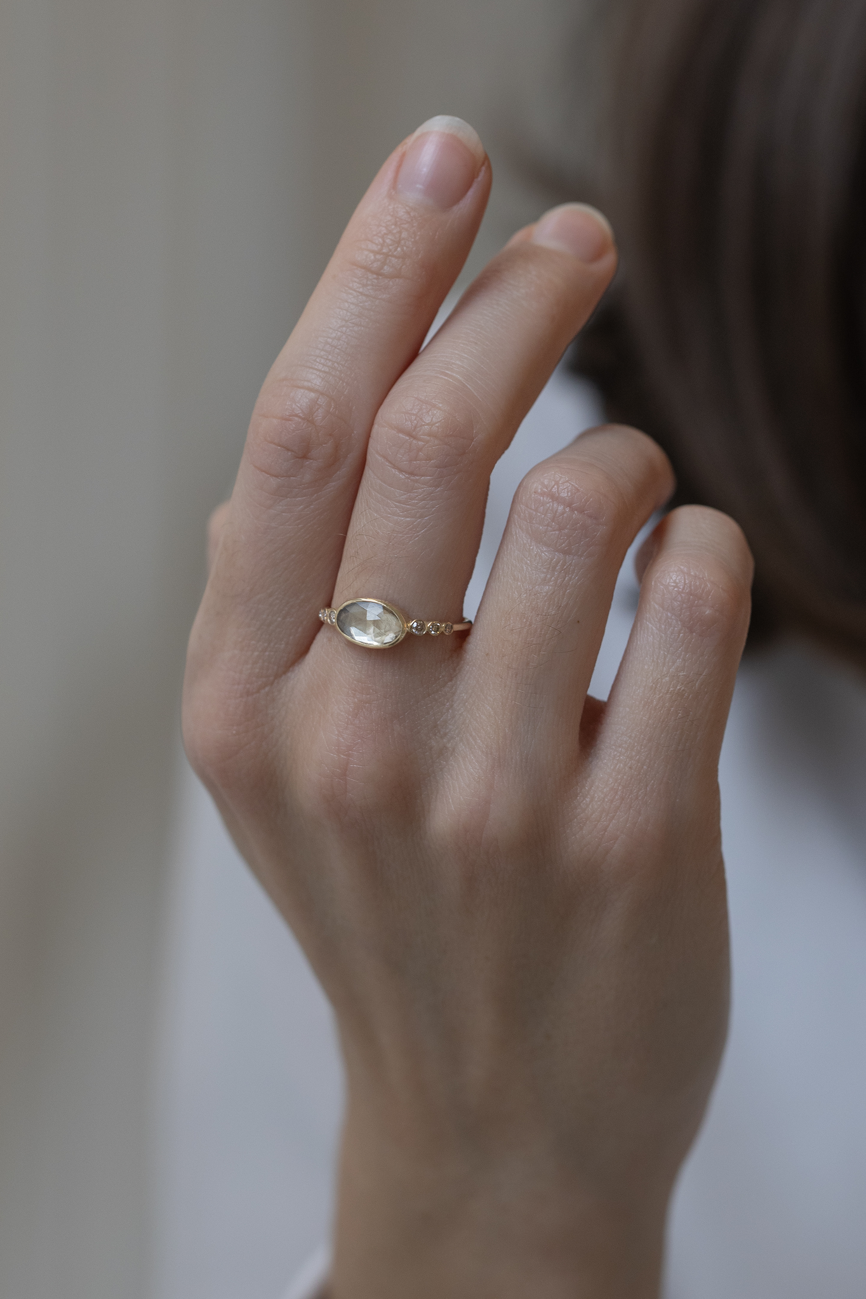 Celine Daoust 14k light yellow gold with one central green tourmaline and six diamonds. The stone comes in a gradient of ocre and yellow.