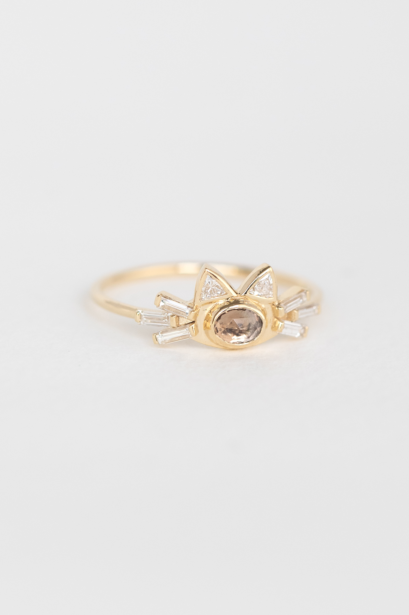 Céline Daoust 14k light yellow gold ring with one pink tourmaline, two trillian diamonds and baguettes diamonds. The stone comes in a gradient of old pink.