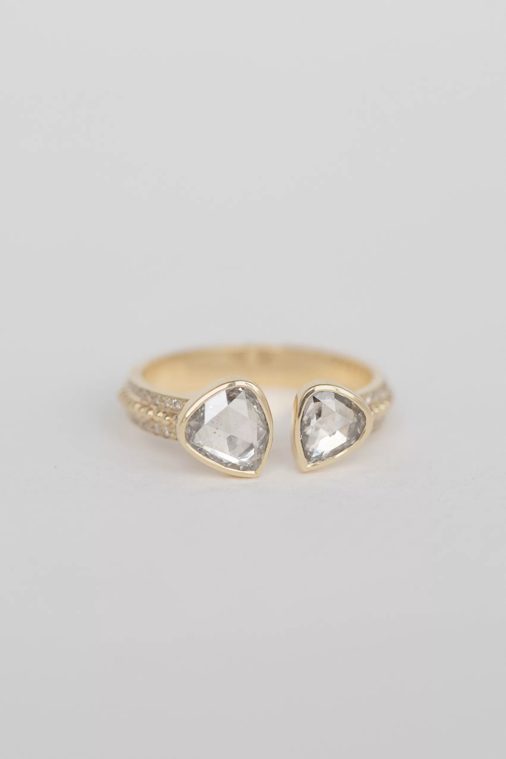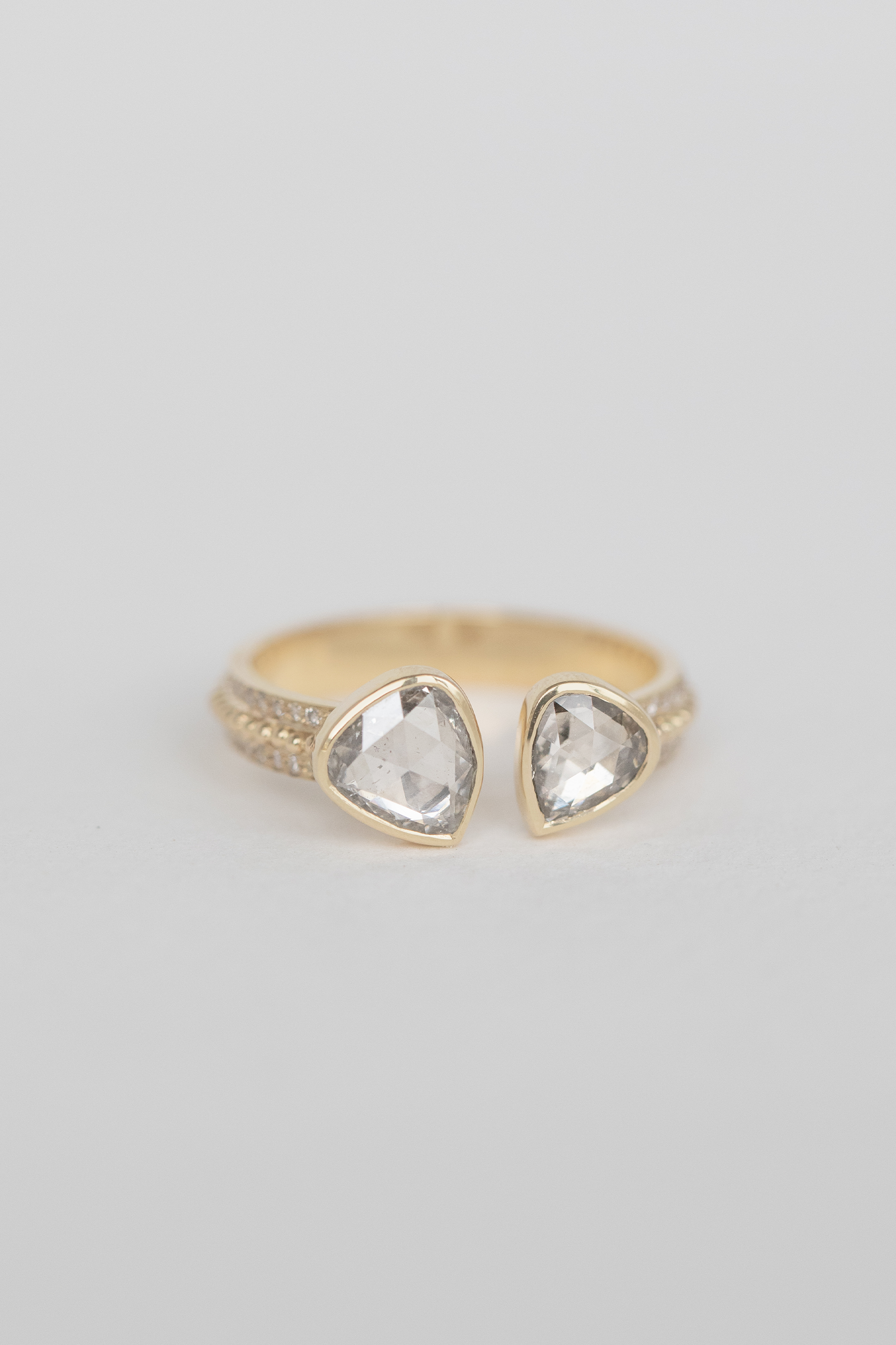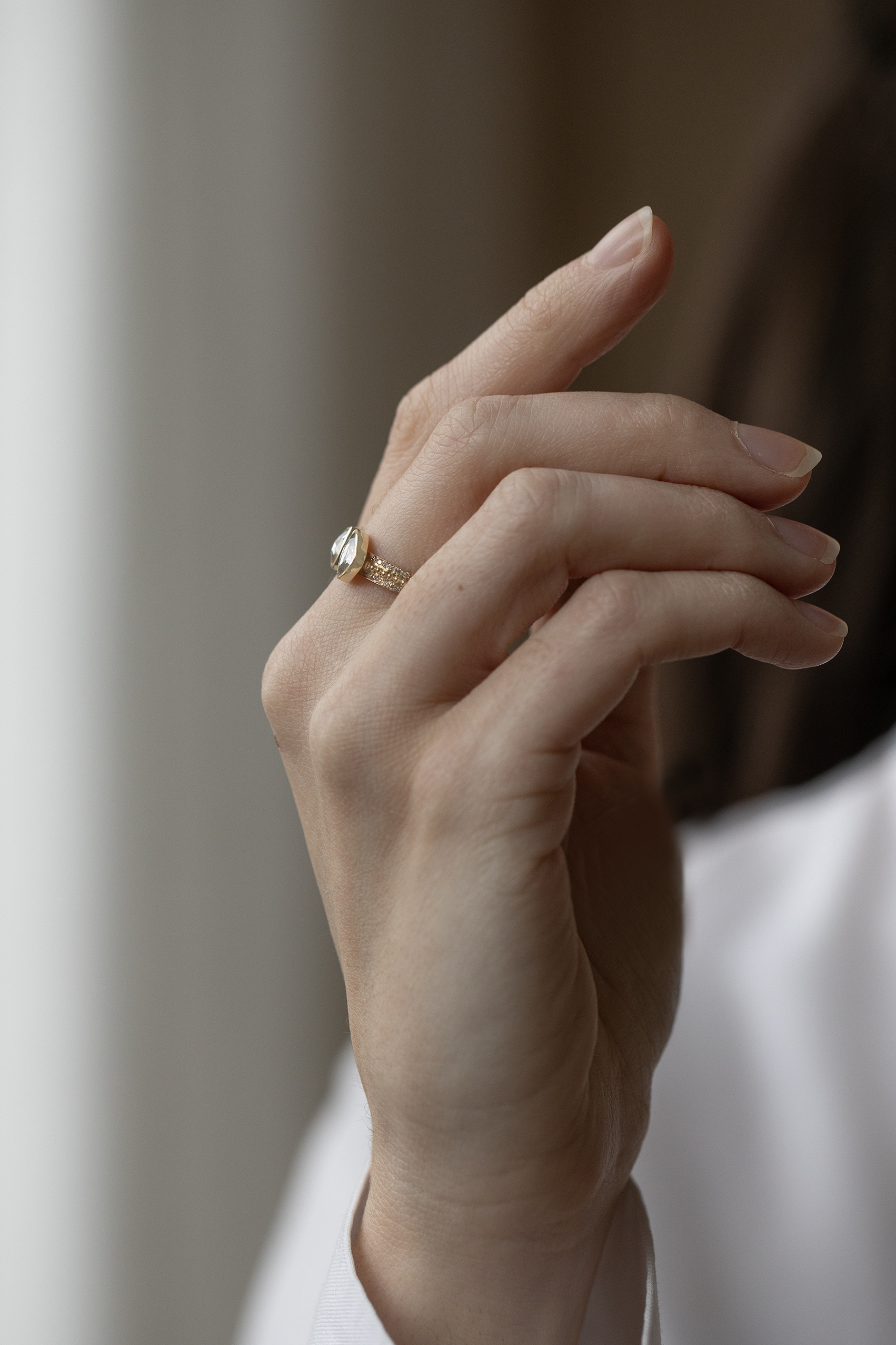 Celine daoust 14k light yellow gold ring with two grey diamonds, diamonds and gold balls on the ring band. The stone comes in a gradient of light and dark grey tones.