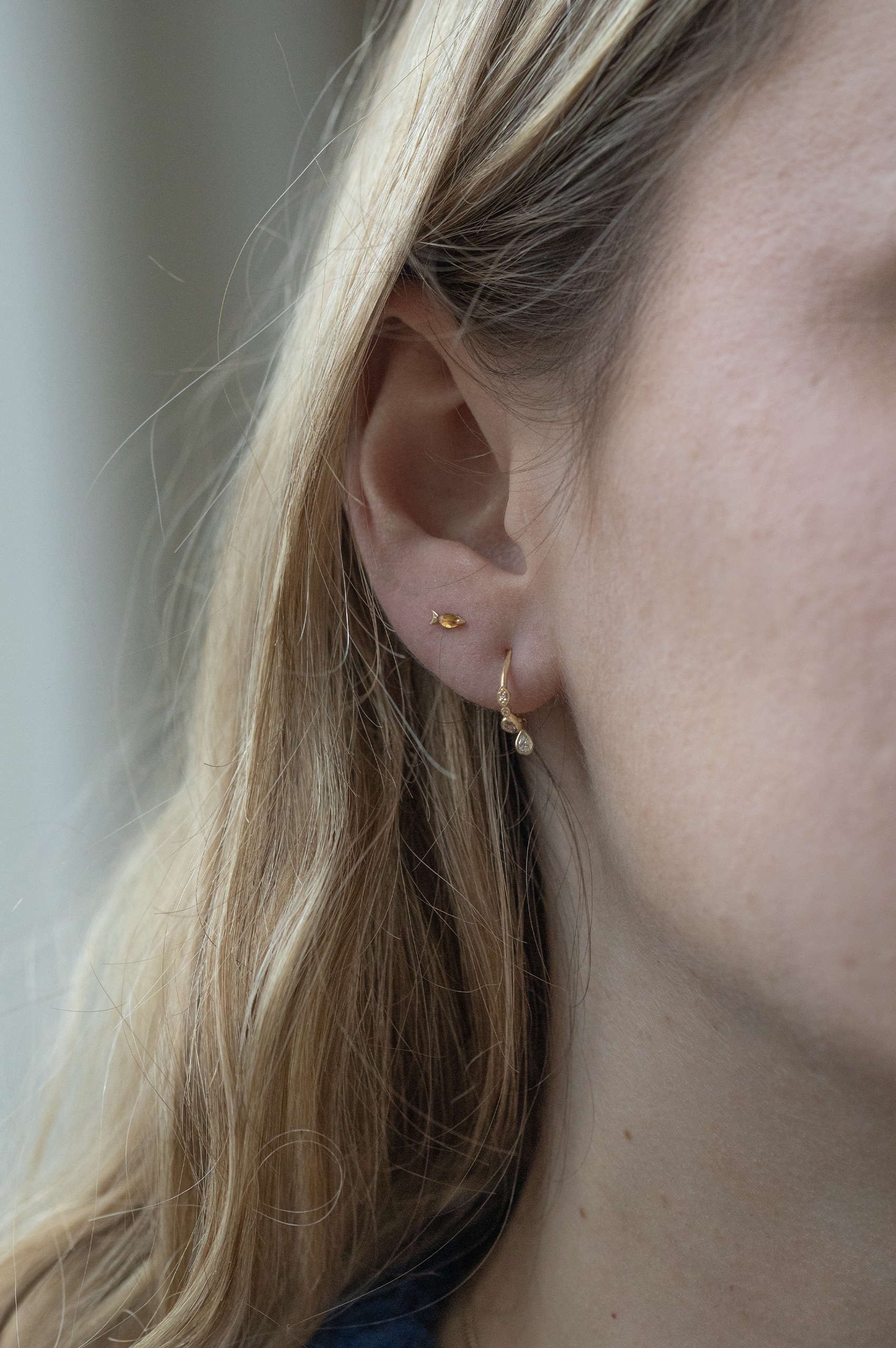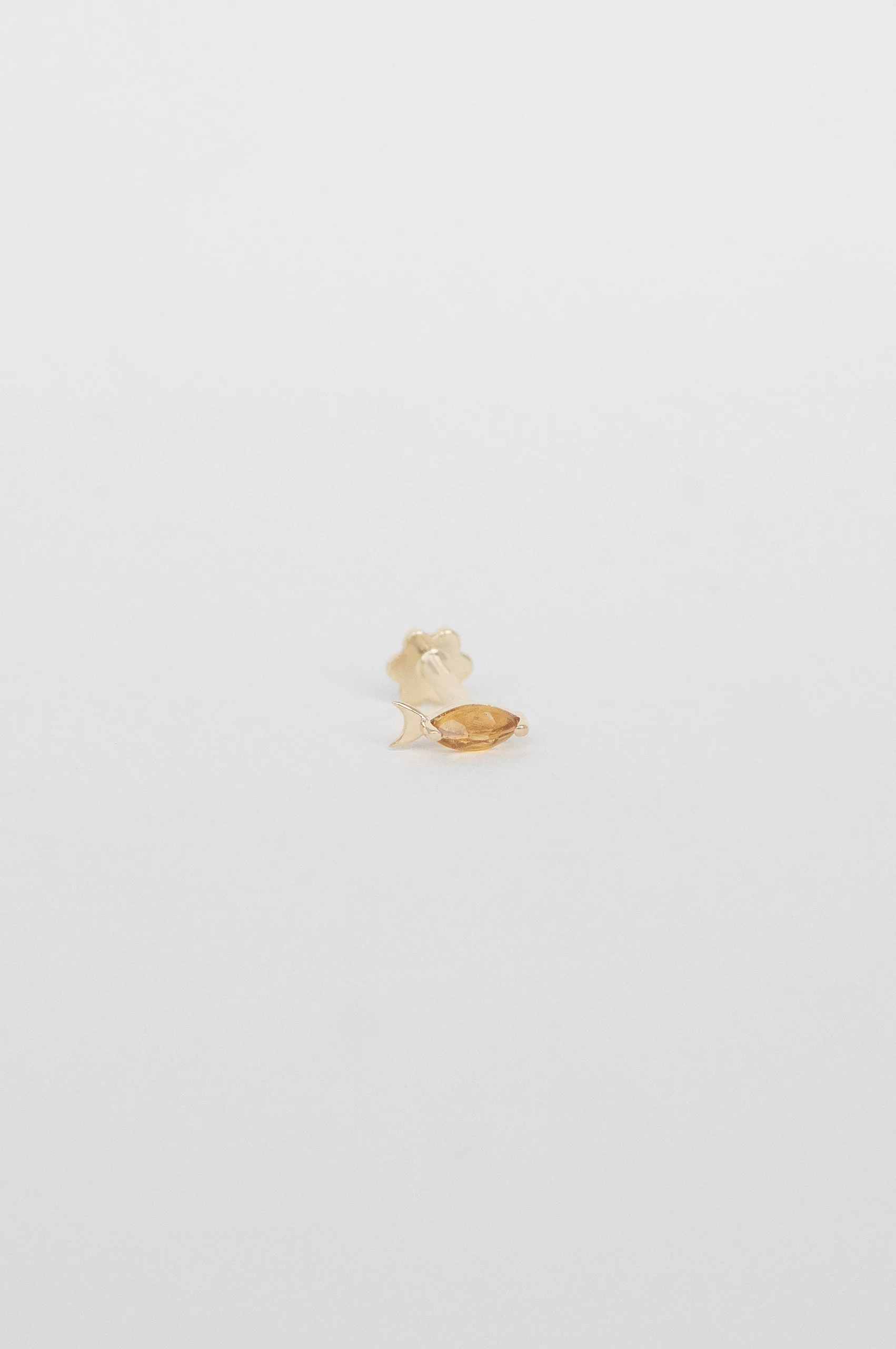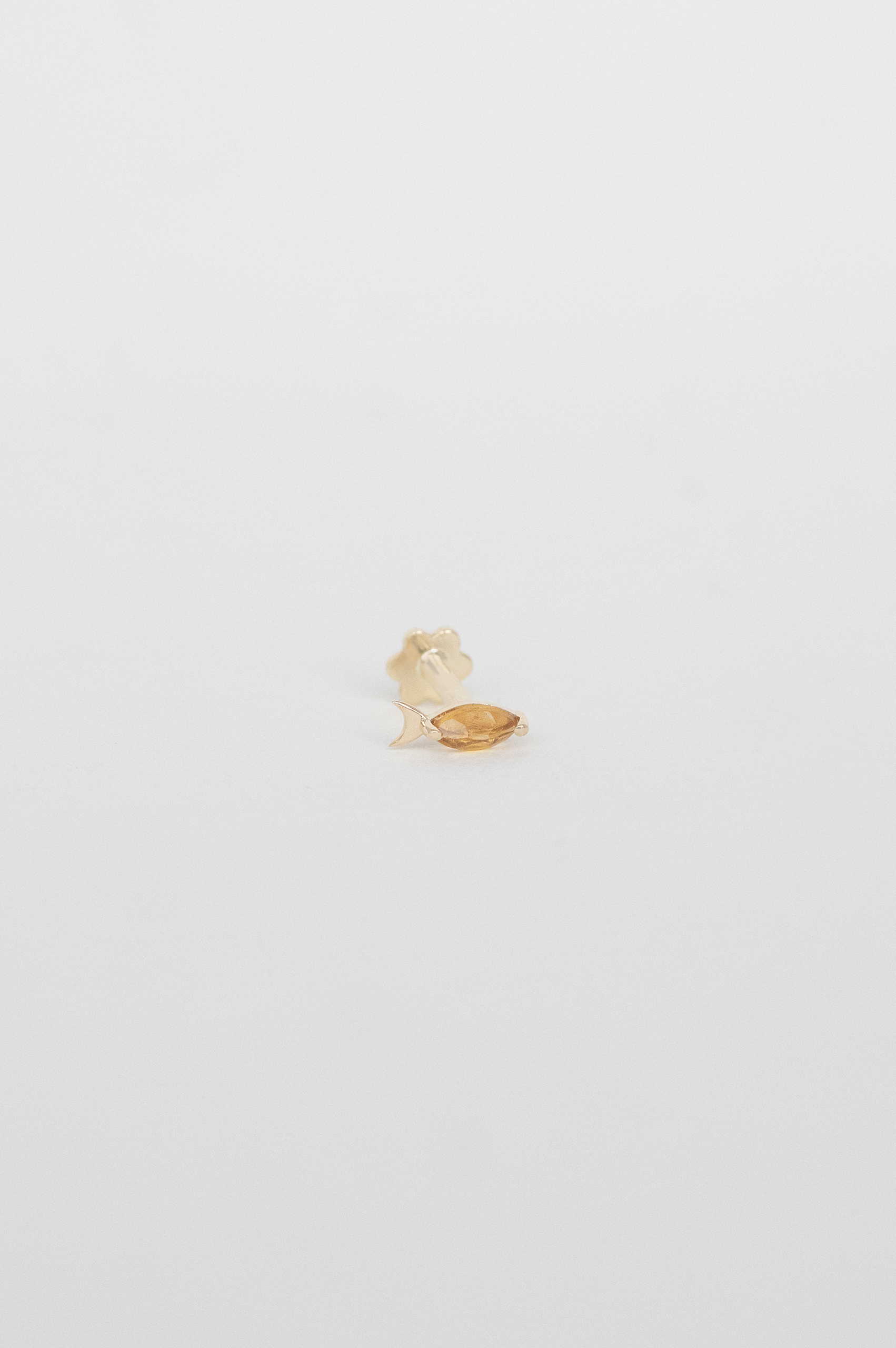 Céline Daoust 14k light yellow gold fish piercing with a one of a kind orange tourmaline stone. The stone comes in a gradient of light orange.