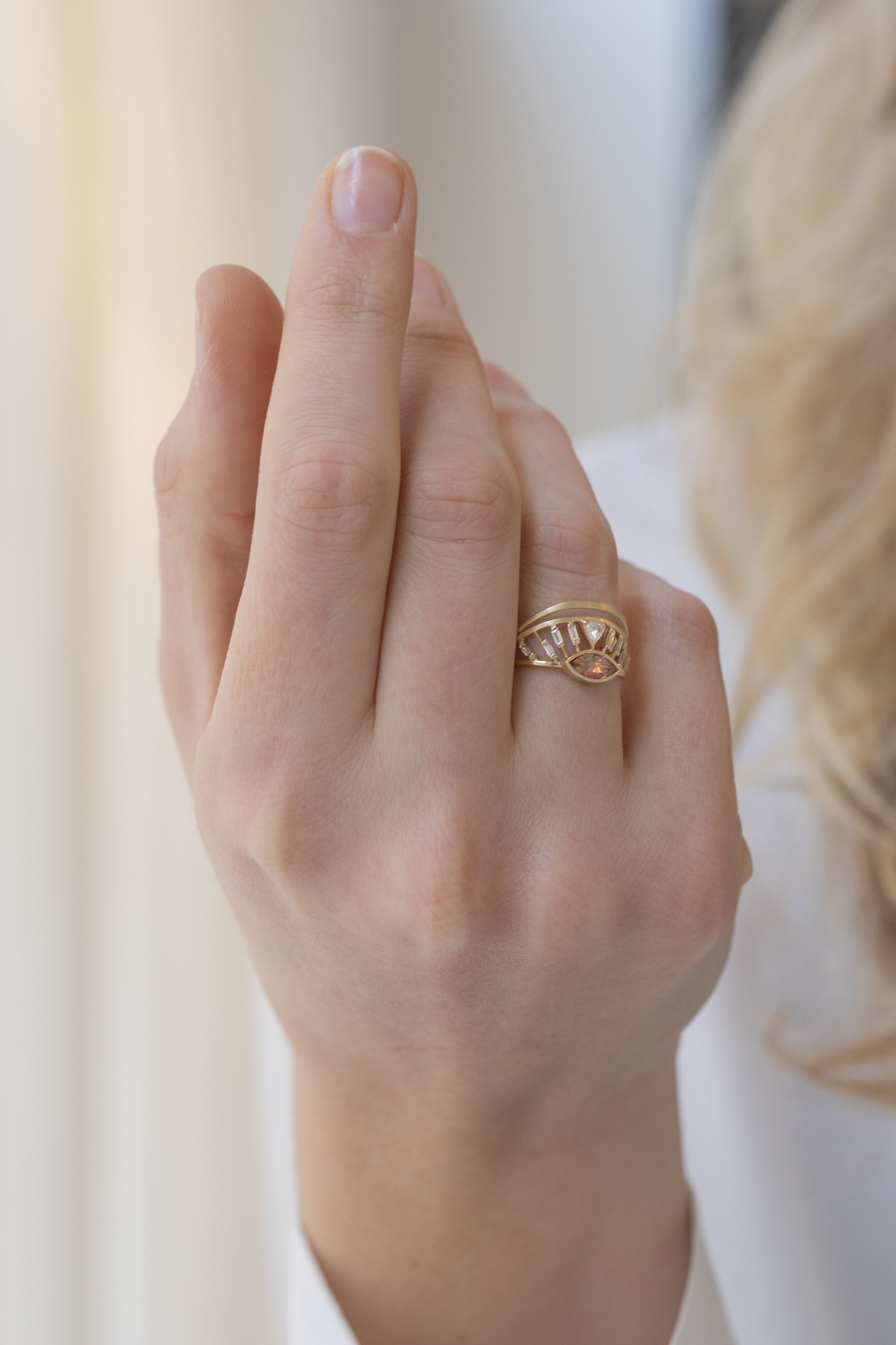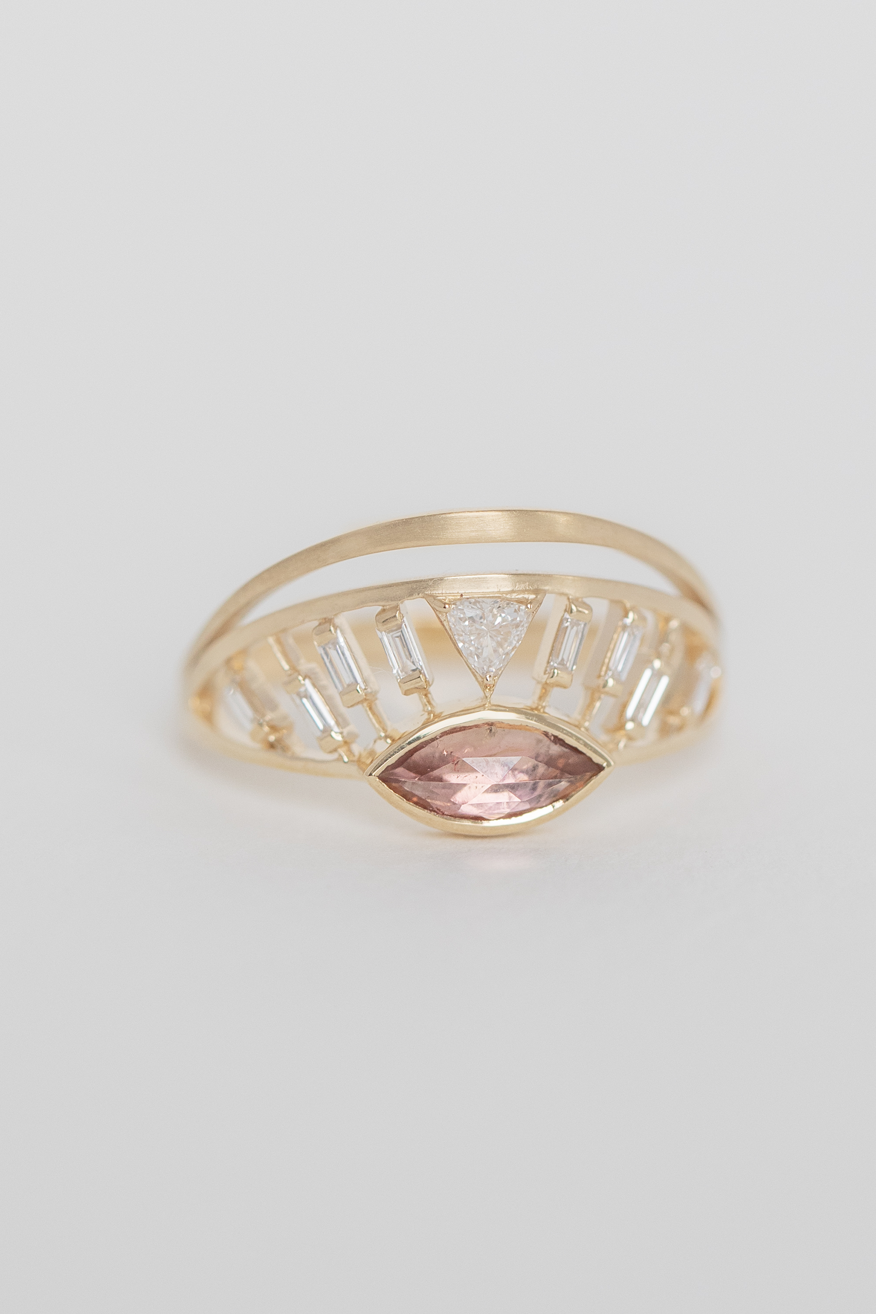 Celine Daoust 14k light yellow gold dream maker open eye crown ring with one light pink tourmaline, one trillion Diamond, Diamonds baguettes and a gold crown.