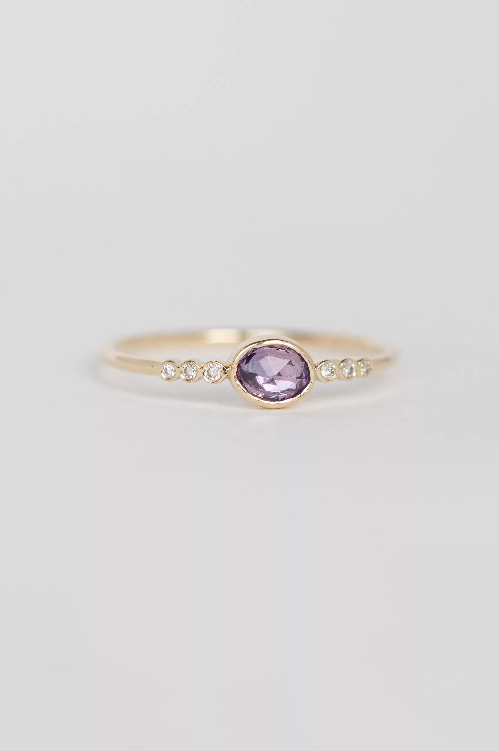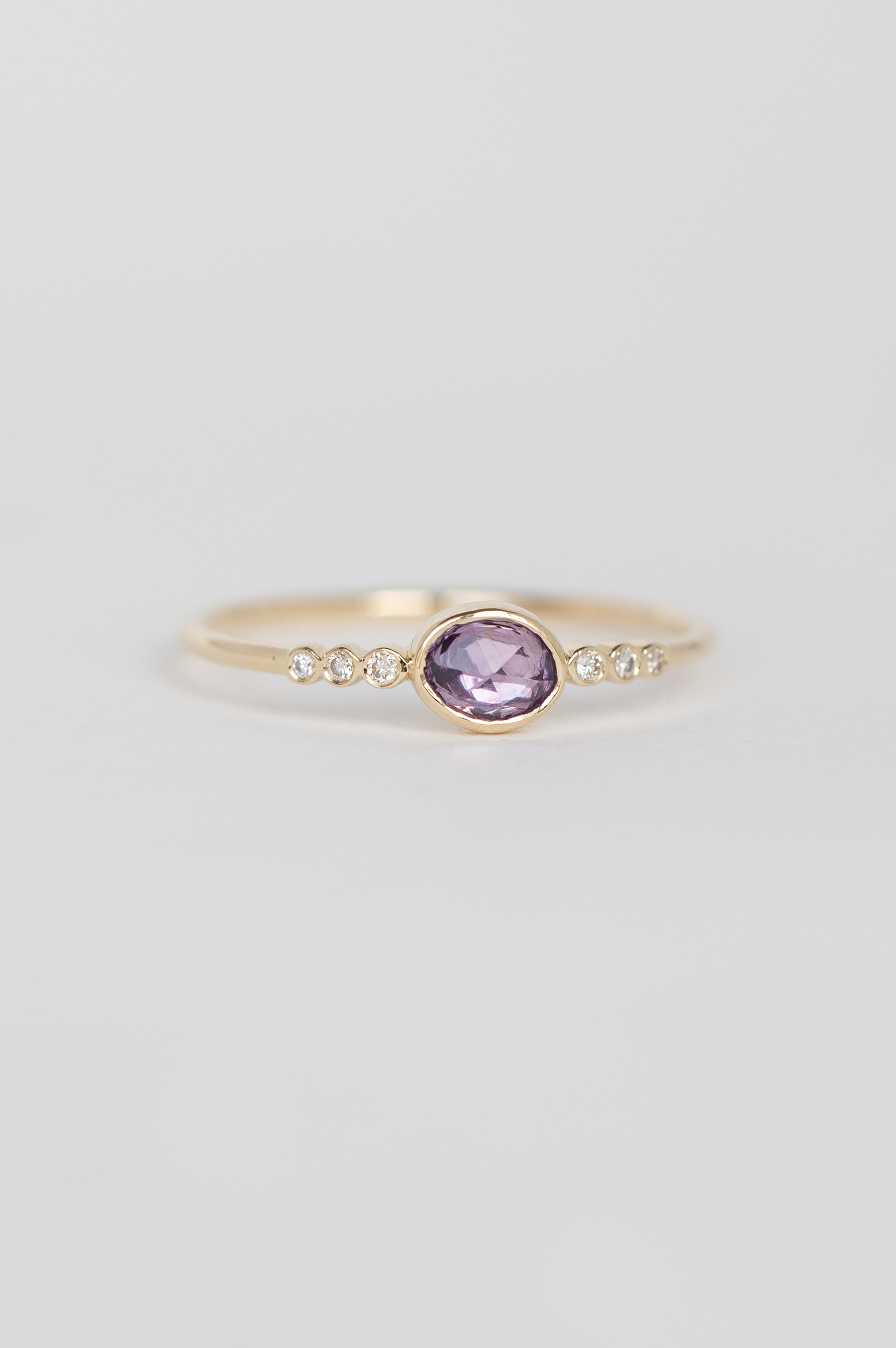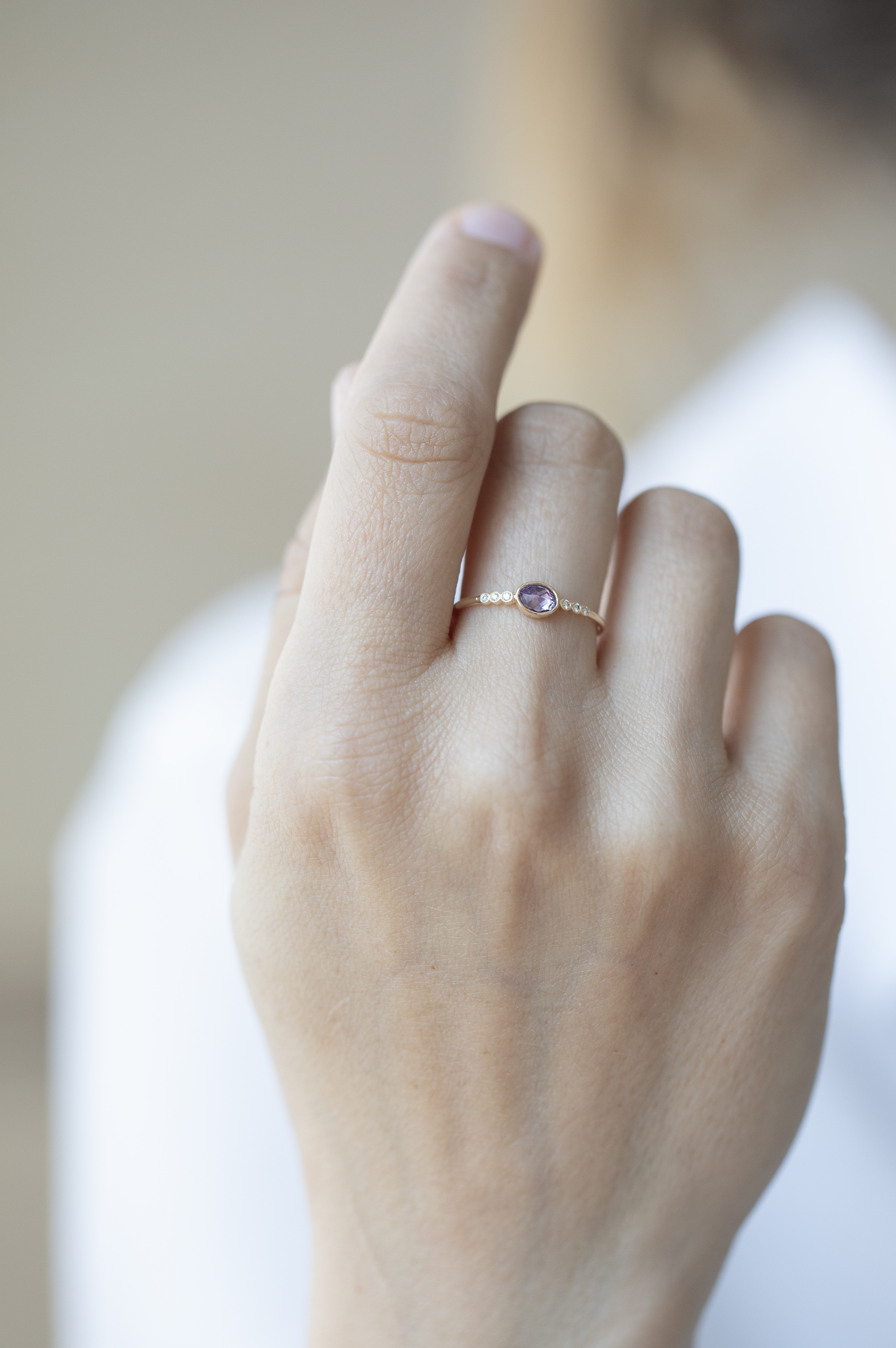 Céline Daoust 14k light yellow gold with one central pink sapphire and six diamonds. The stone comes in a gradient of pink and purple.