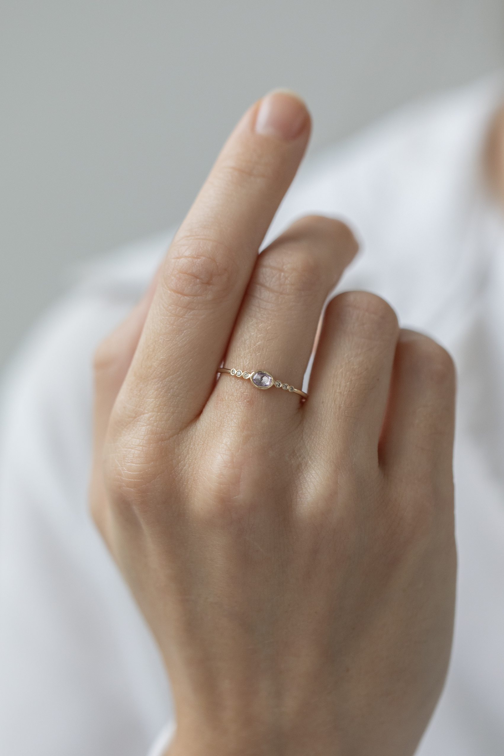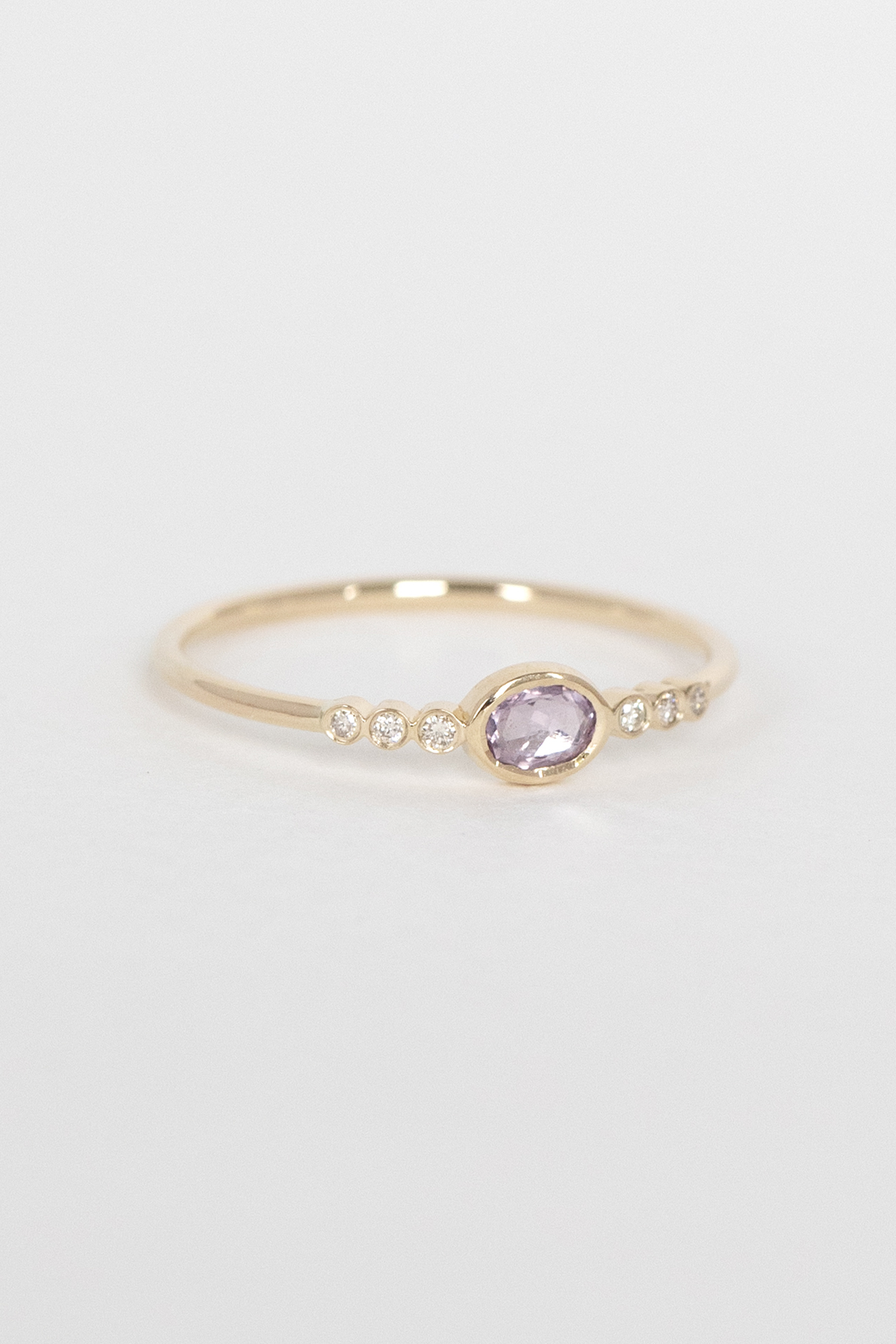 Céline Daoust 14k light yellow gold with one central light pink sapphire and six diamonds. The stone comes in a gradient of light pink.