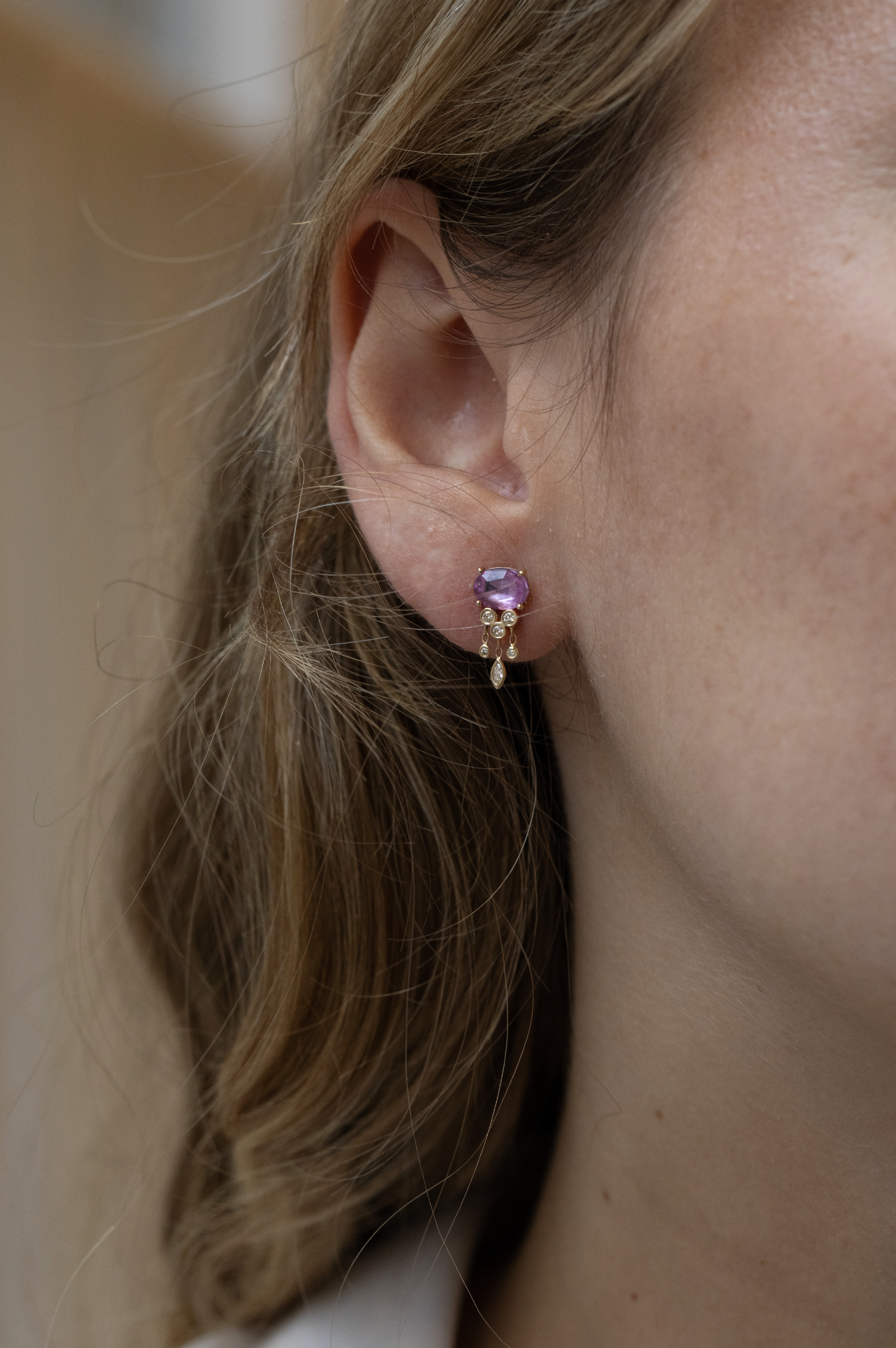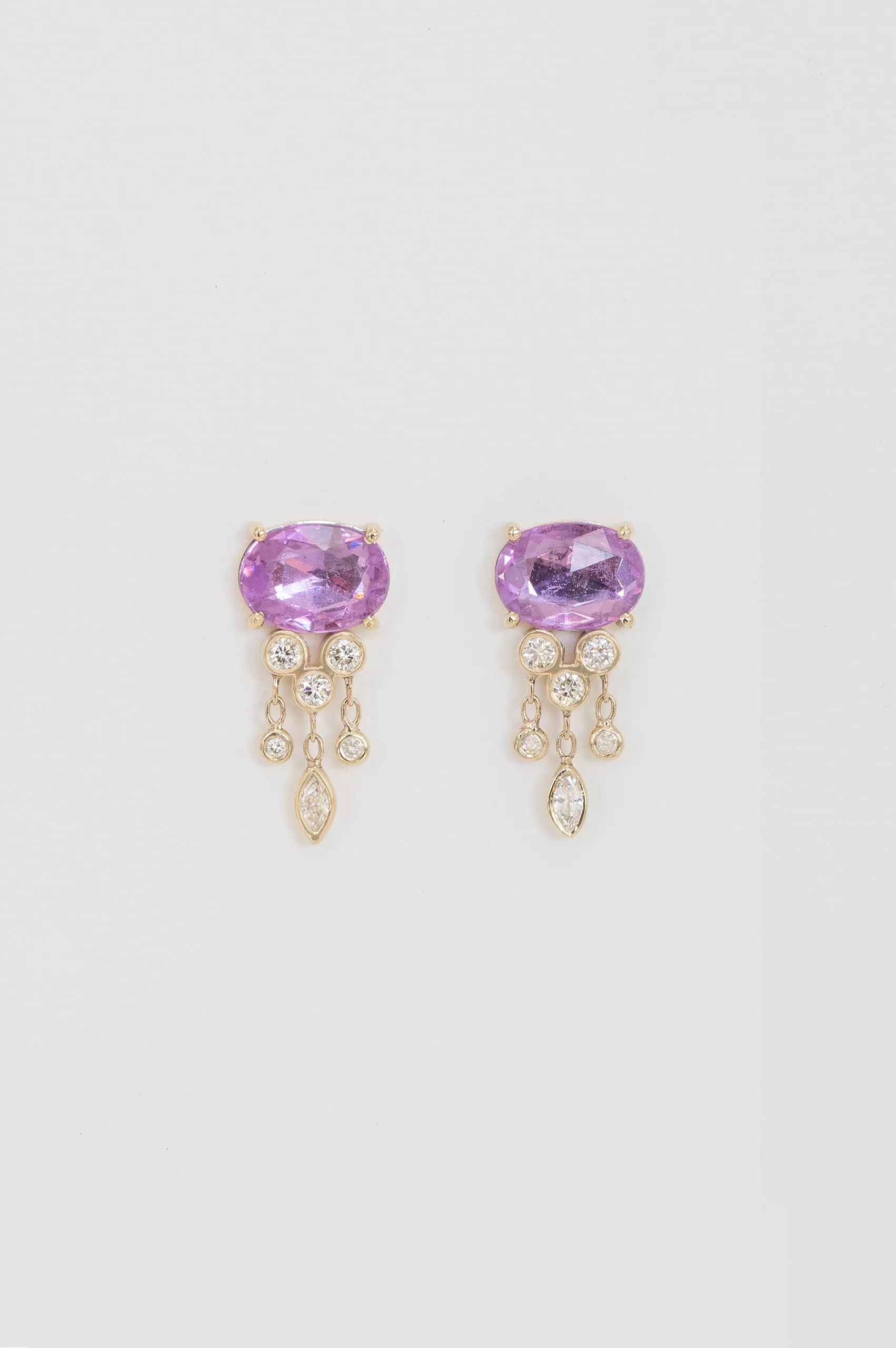 Celine Daoust 14k light yellow gold jellyfish earrings with one pink sapphire and dangling diamonds. The stone comes in a gradient of vivid pink.