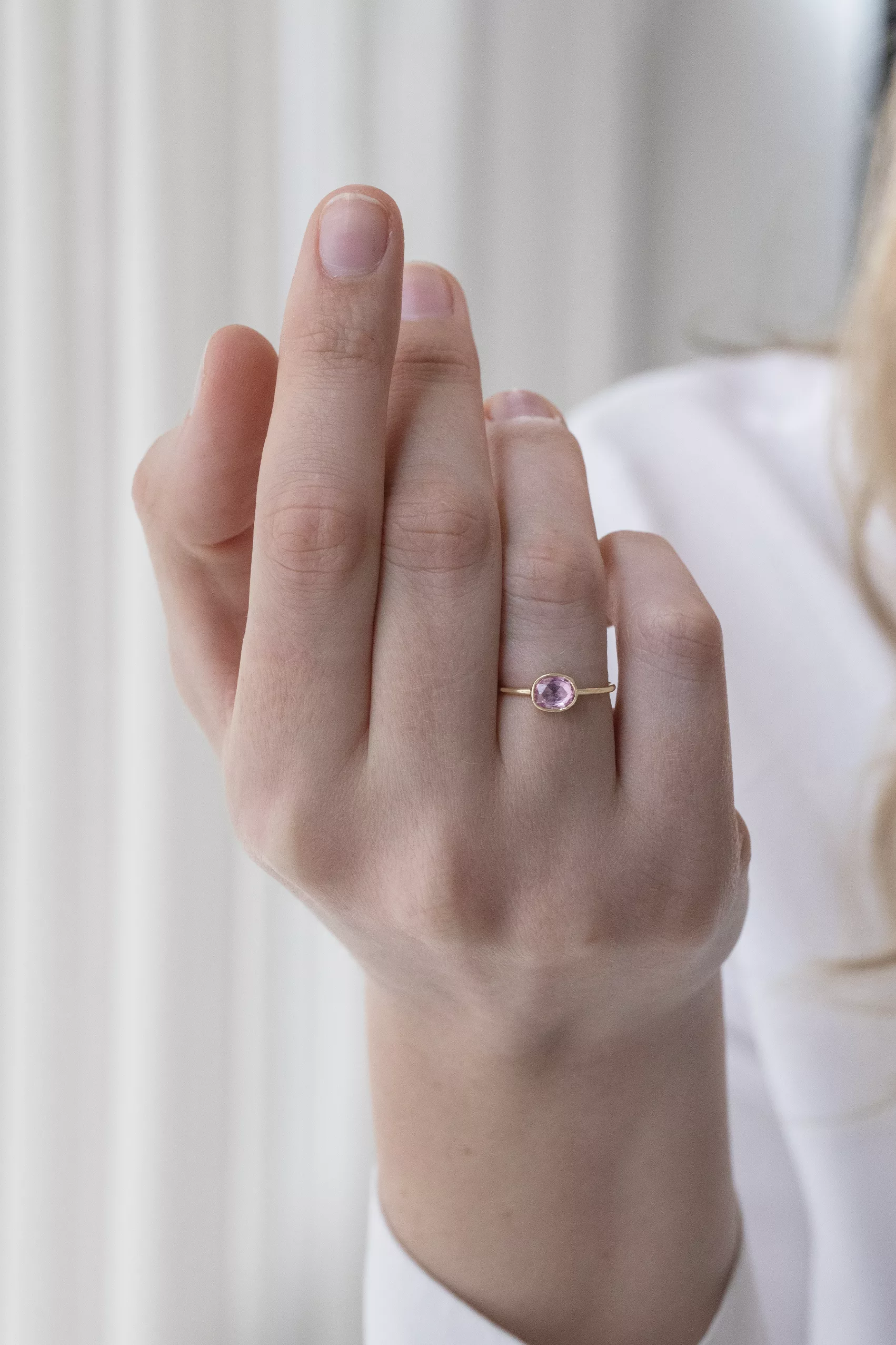Céline Daoust 14k light yellow gold ring with one pink sapphire. The stone comes in a gradient of pink.