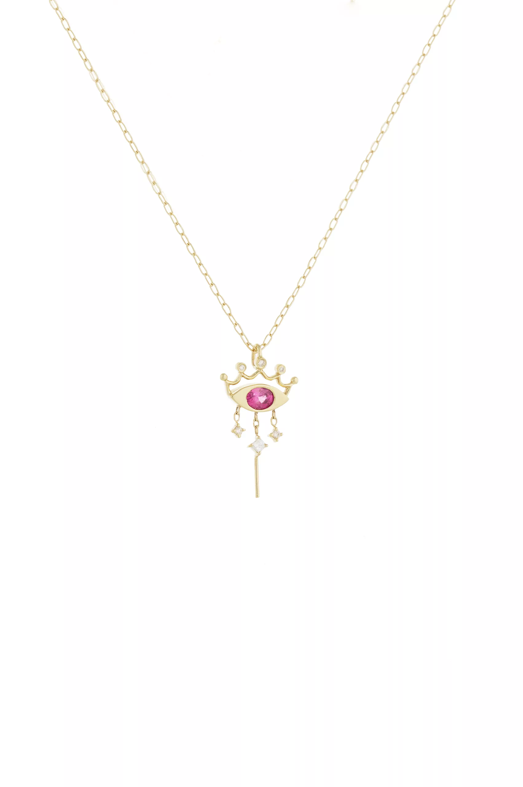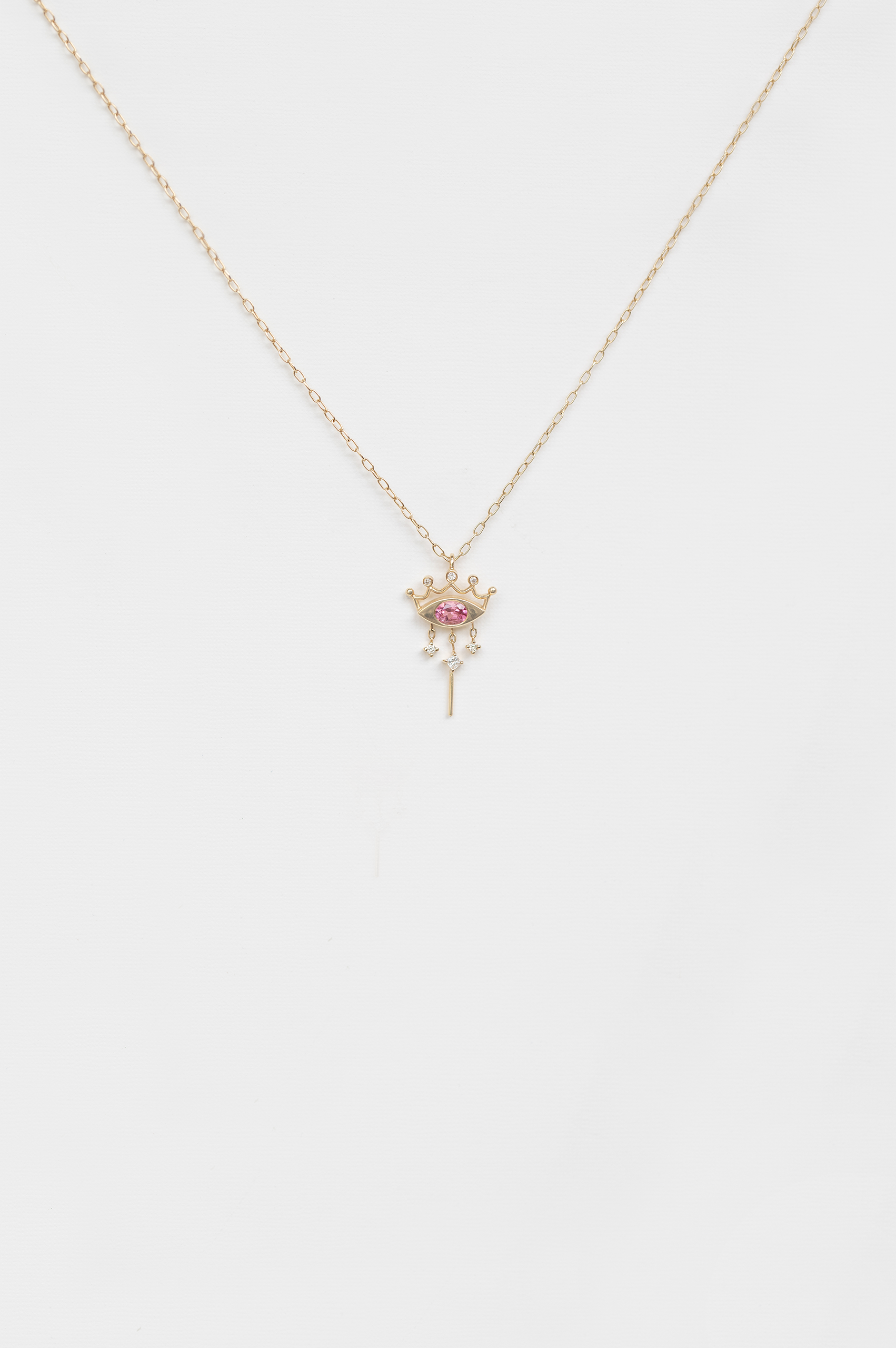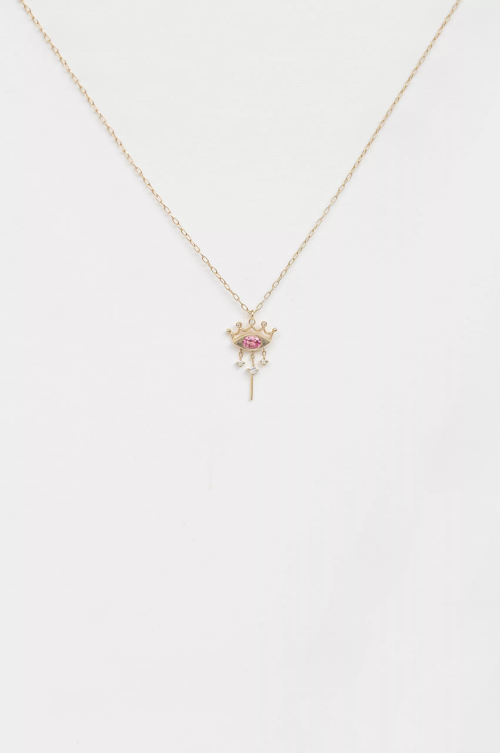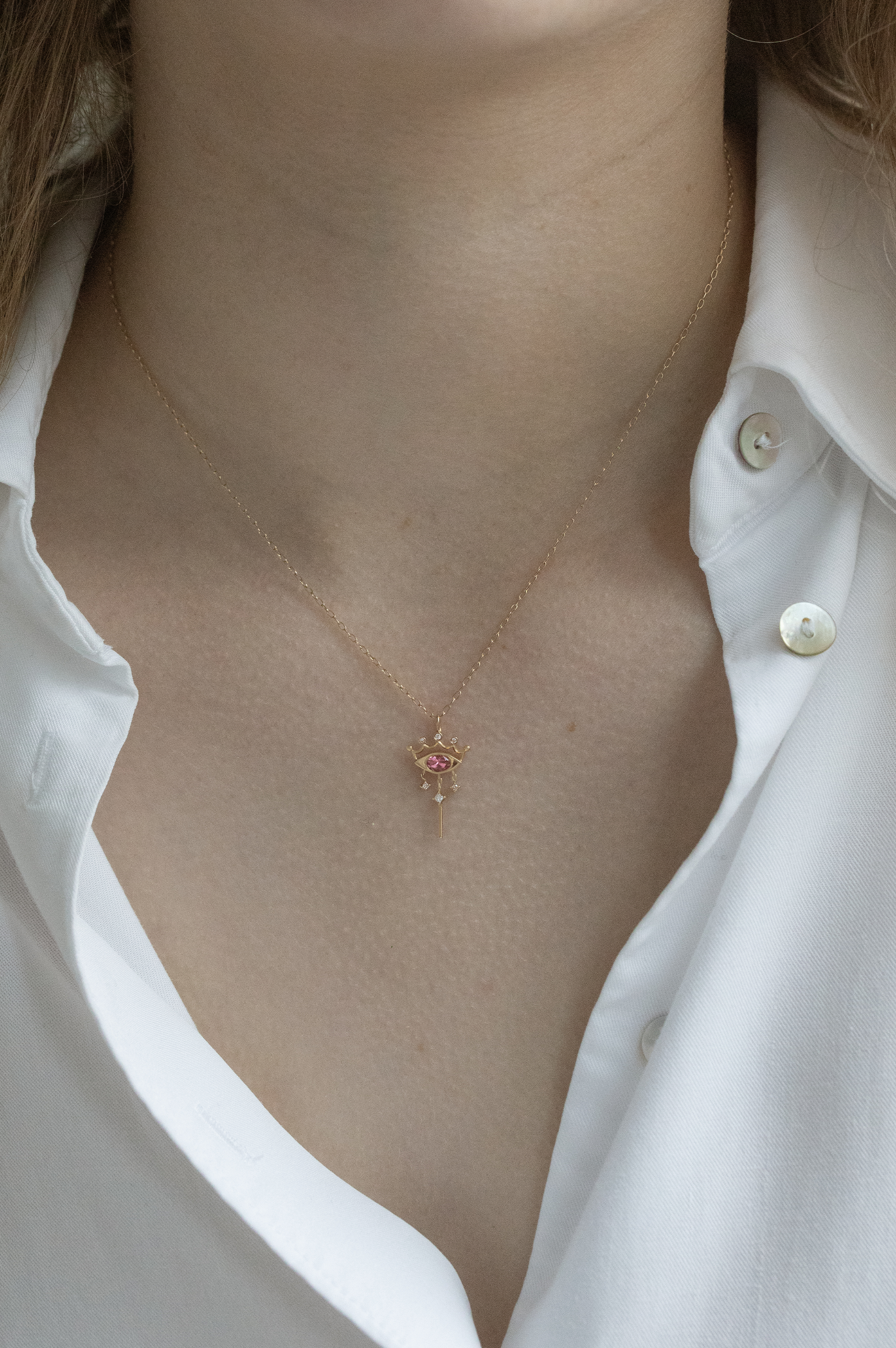 Celine Daoust 14k light yellow gold pendant with one vivid pink spinel and diamonds crown.