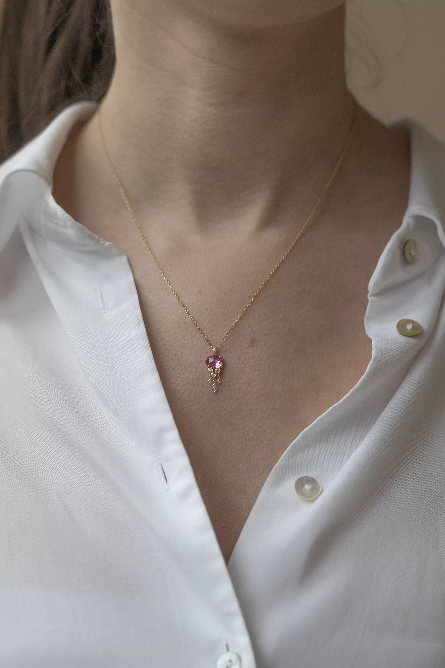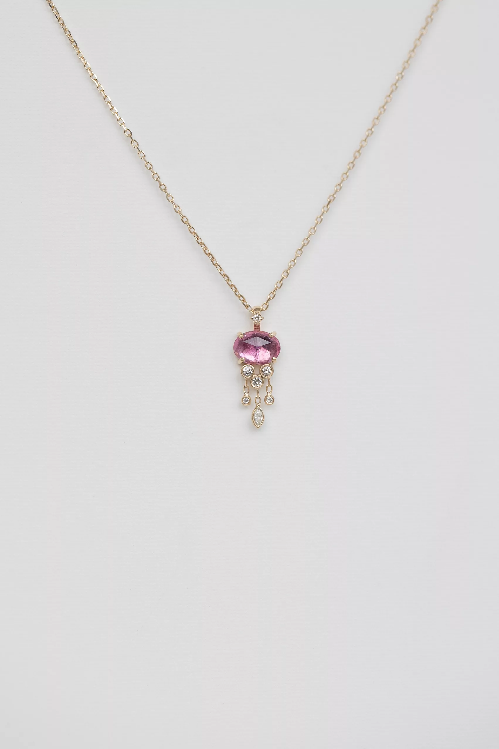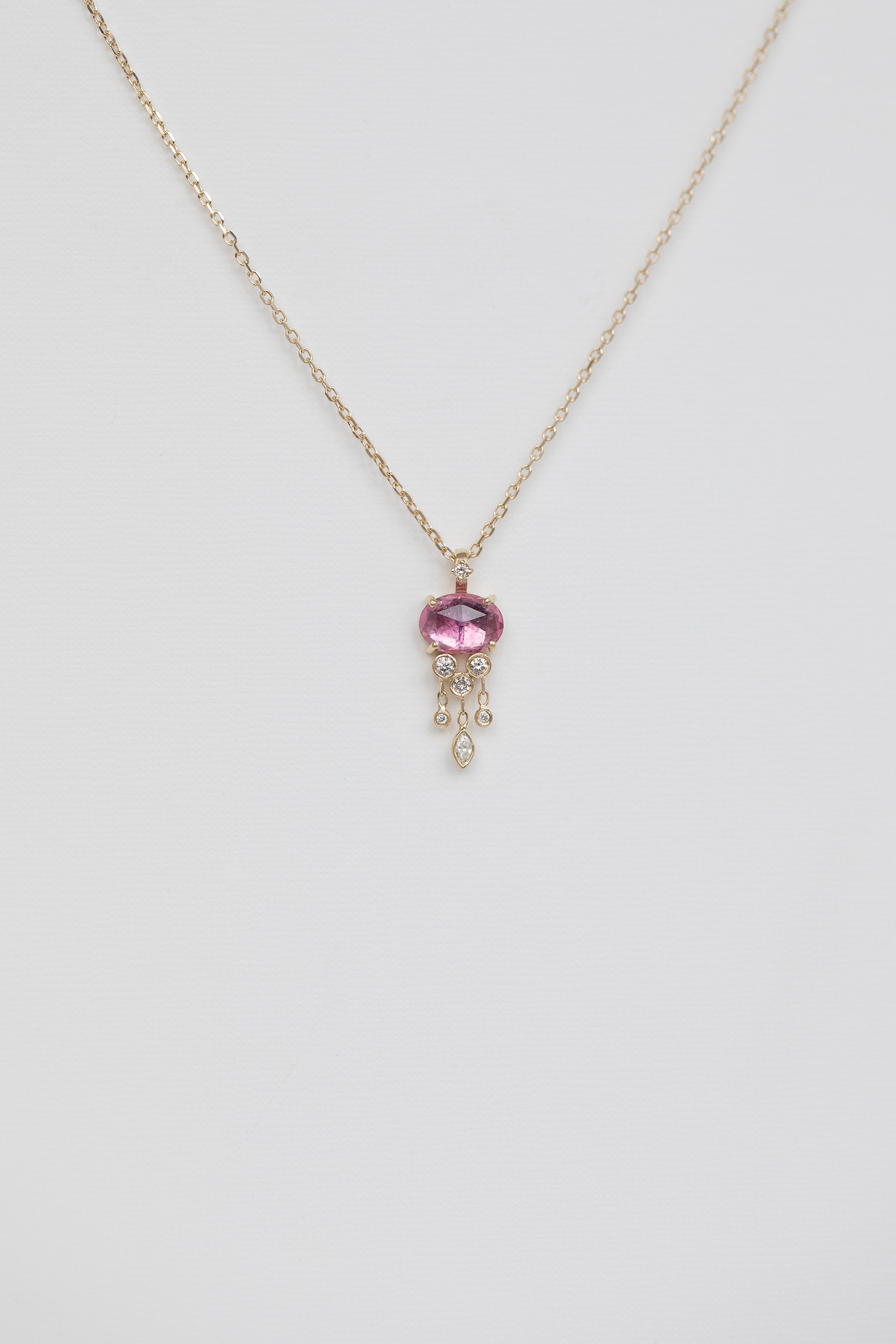 Céline Daoust 14k light yellow gold chain necklace with one pink tourmaline and dangling diamonds jellyfish chain necklace. The stone comes in a gradient of light and dark pink.
