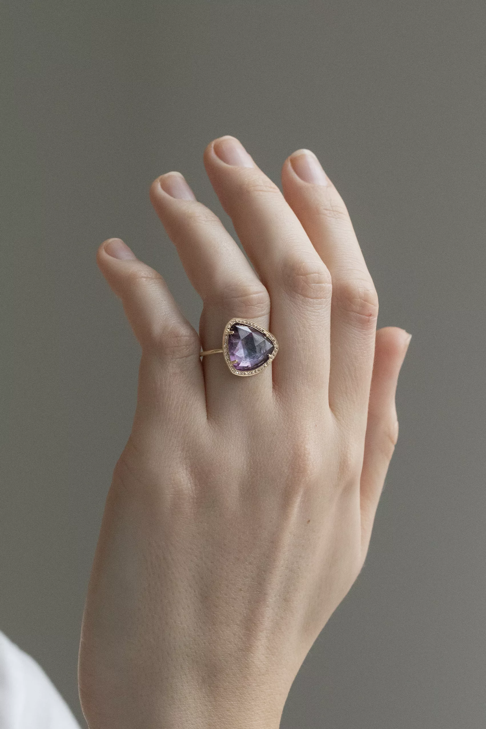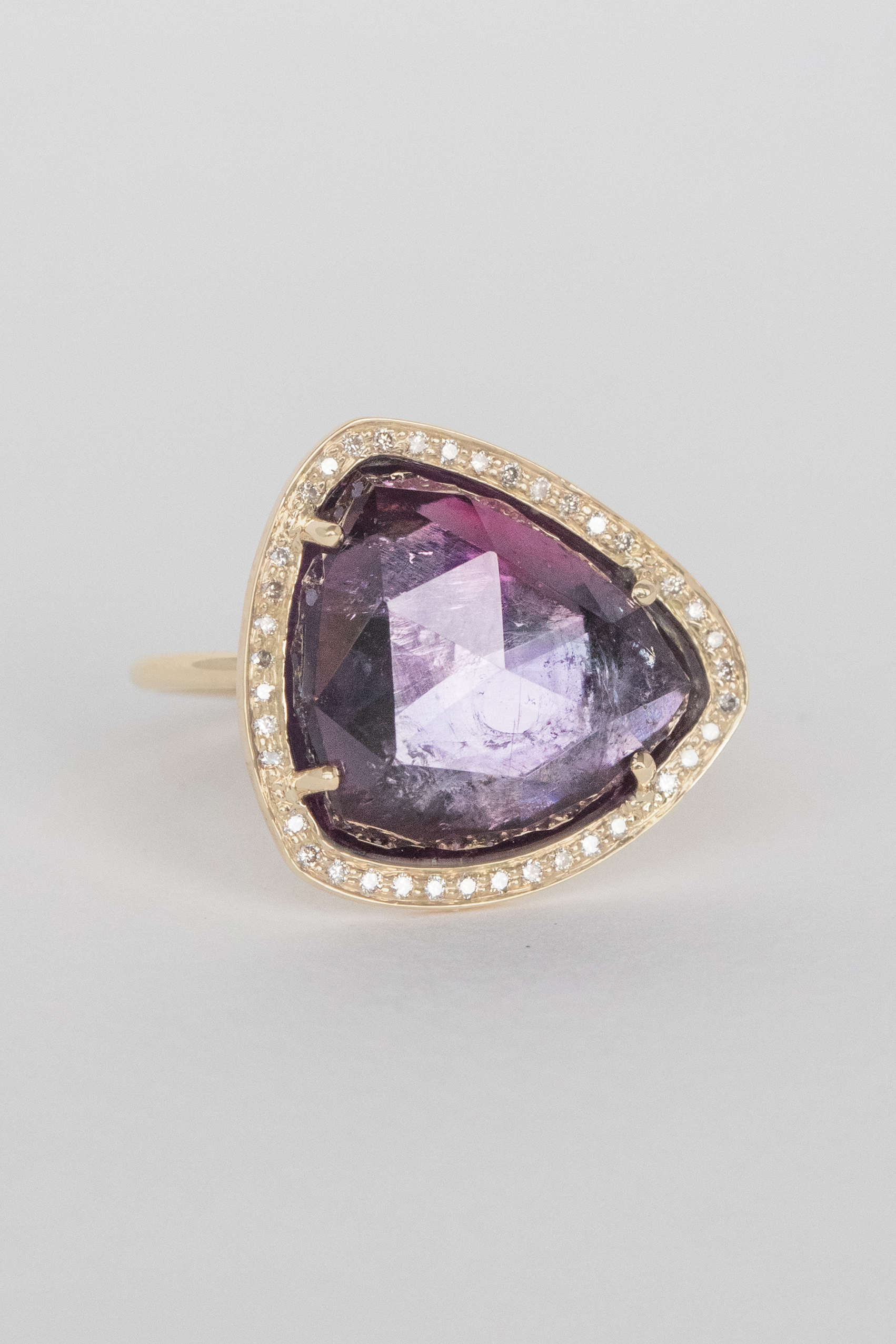 Céline Daoust 14k yellow gold ring with one purple tourmaline surrounded by diamonds. The stone is a gradient of pink and purple hues.