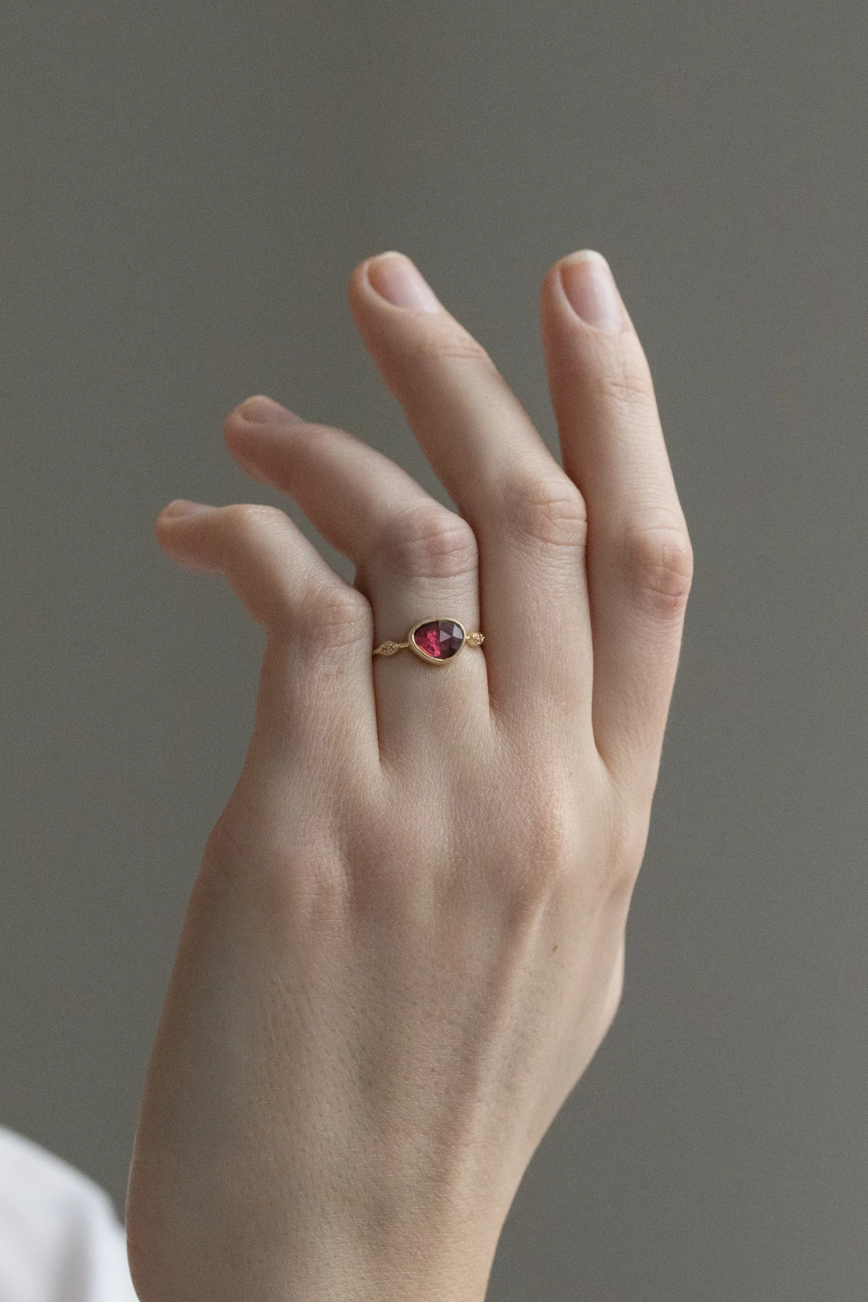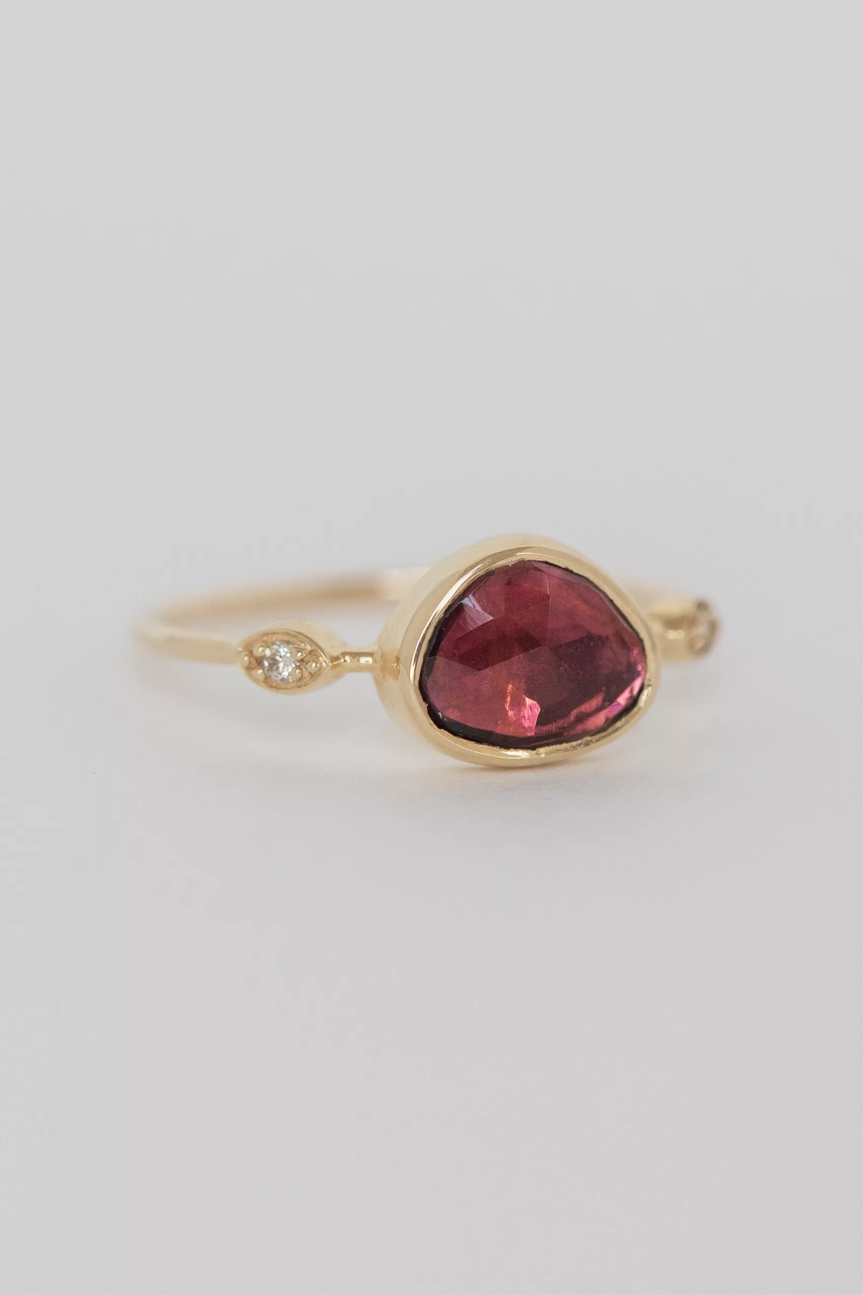 Céline daoust 14k light yellow gold ring with one pink tourmaline and two diamond eyes. The stone color is a gradient of pink.