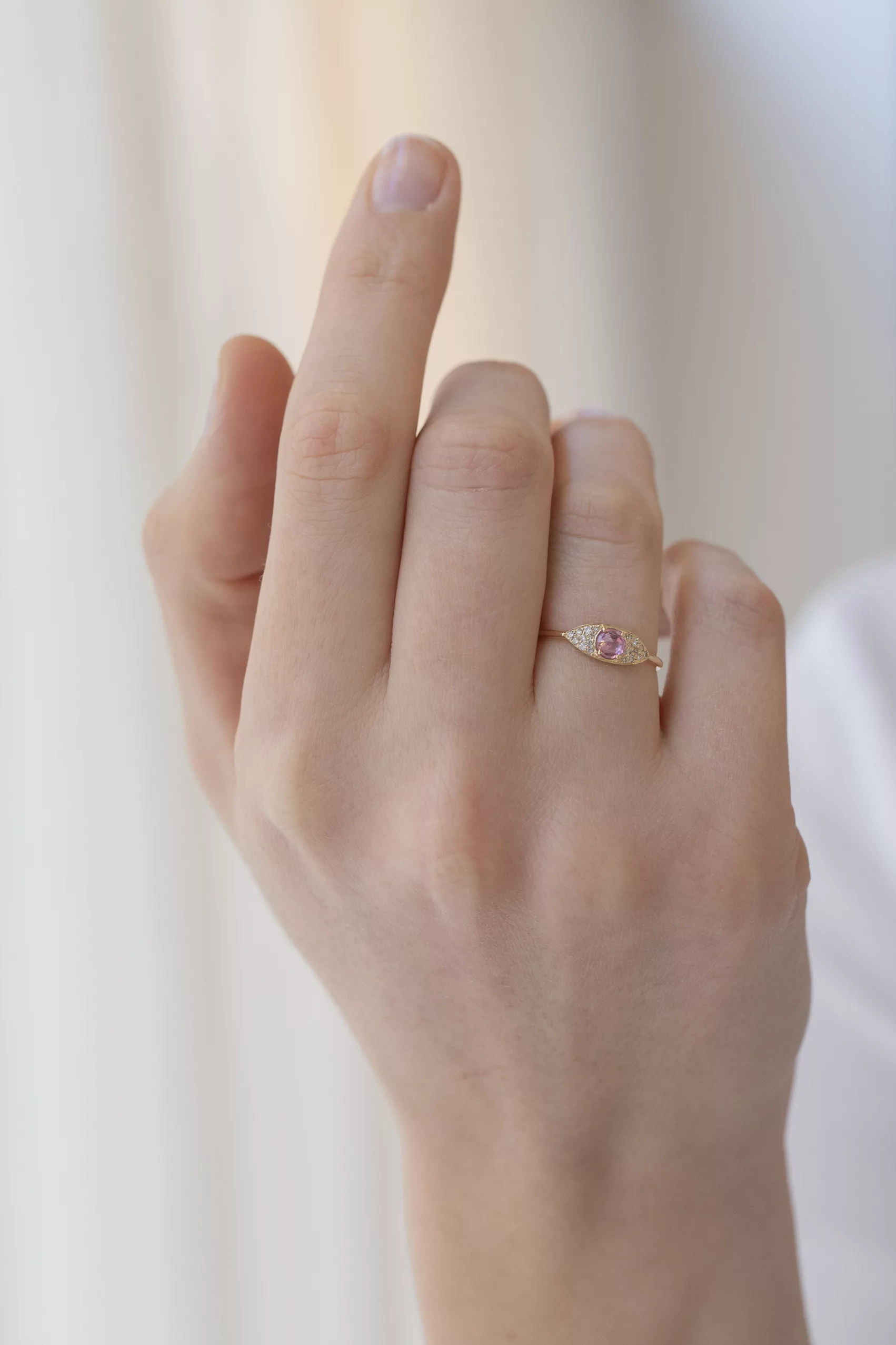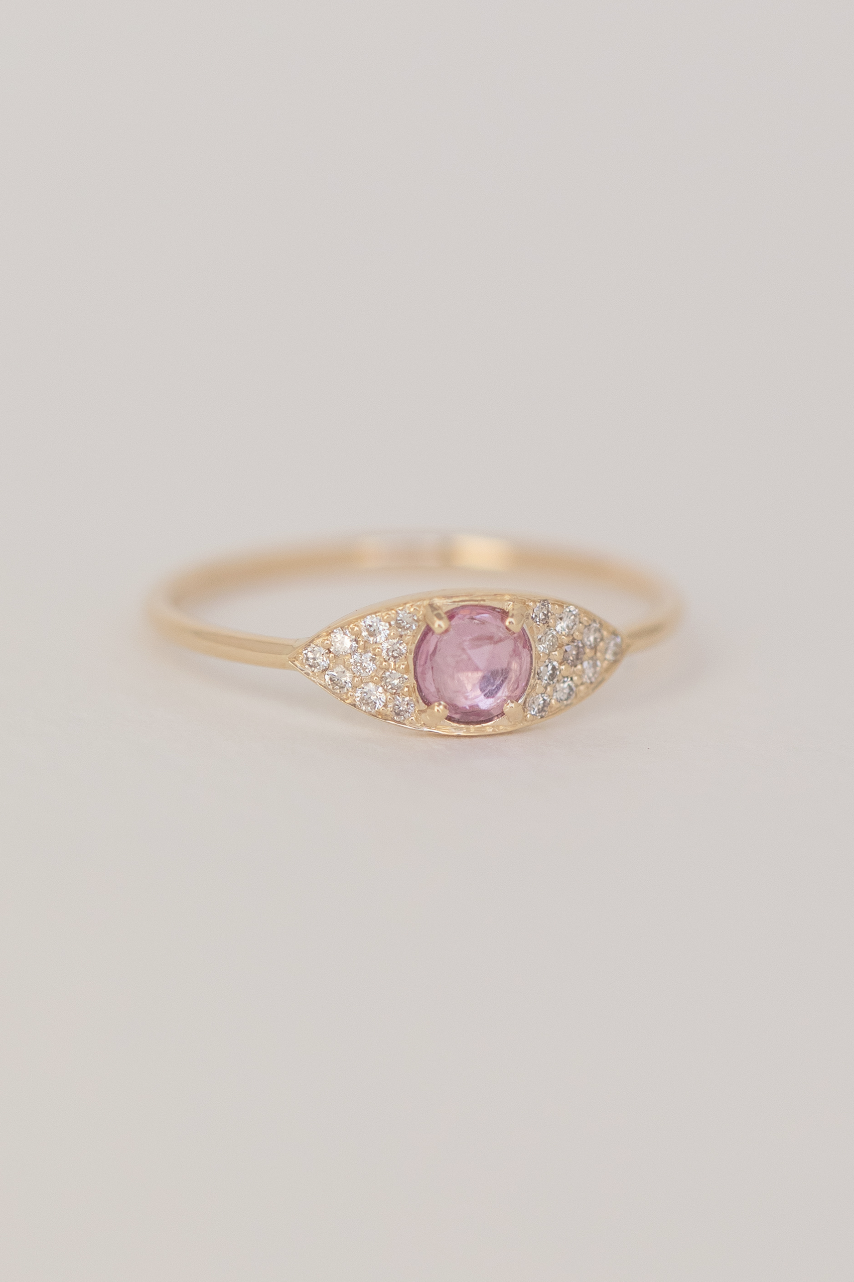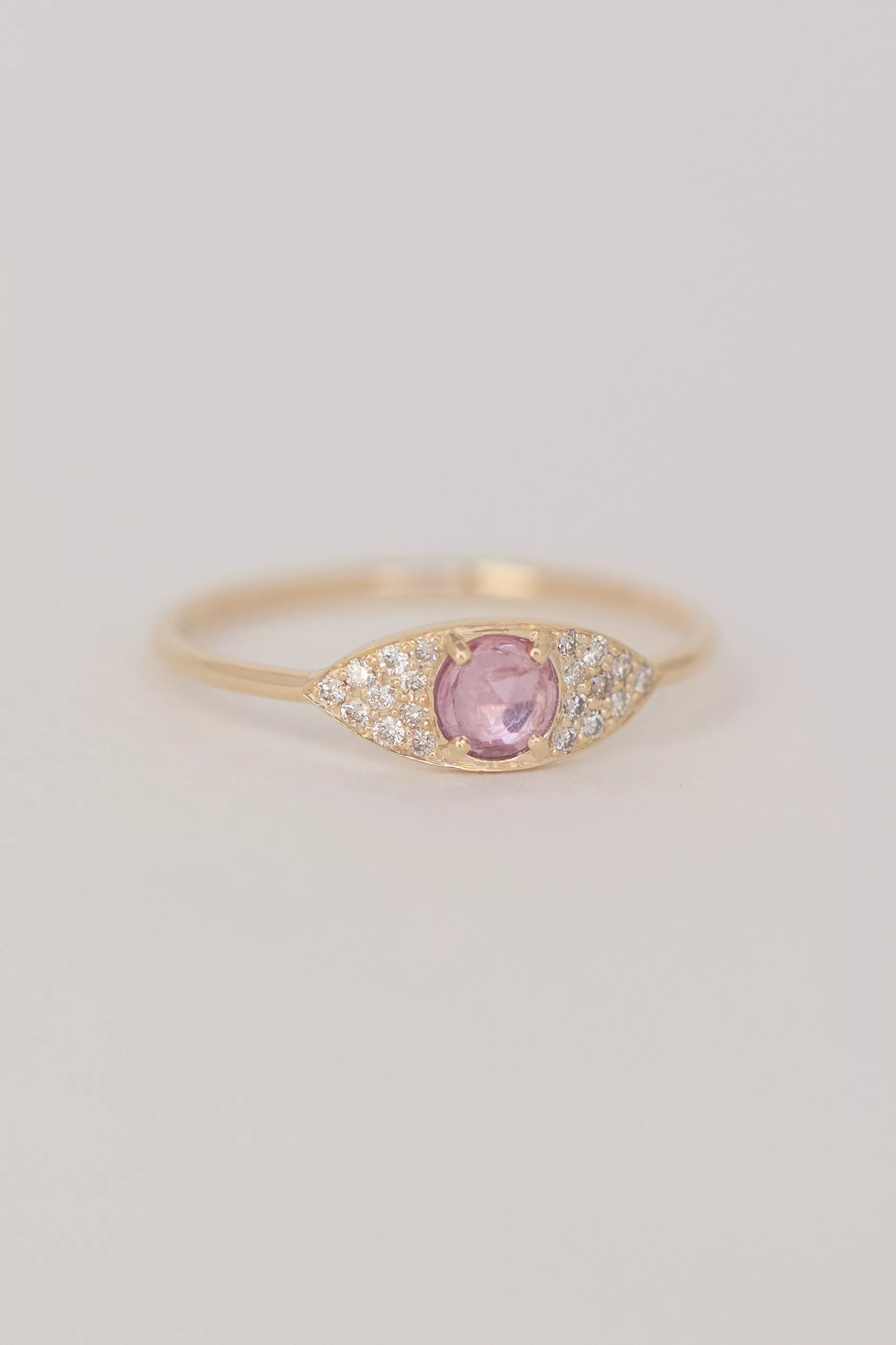 Céline daoust 14k yellow gold full eye ring with one pink tourmaline and diamonds. The stone color is a gradient of pink.