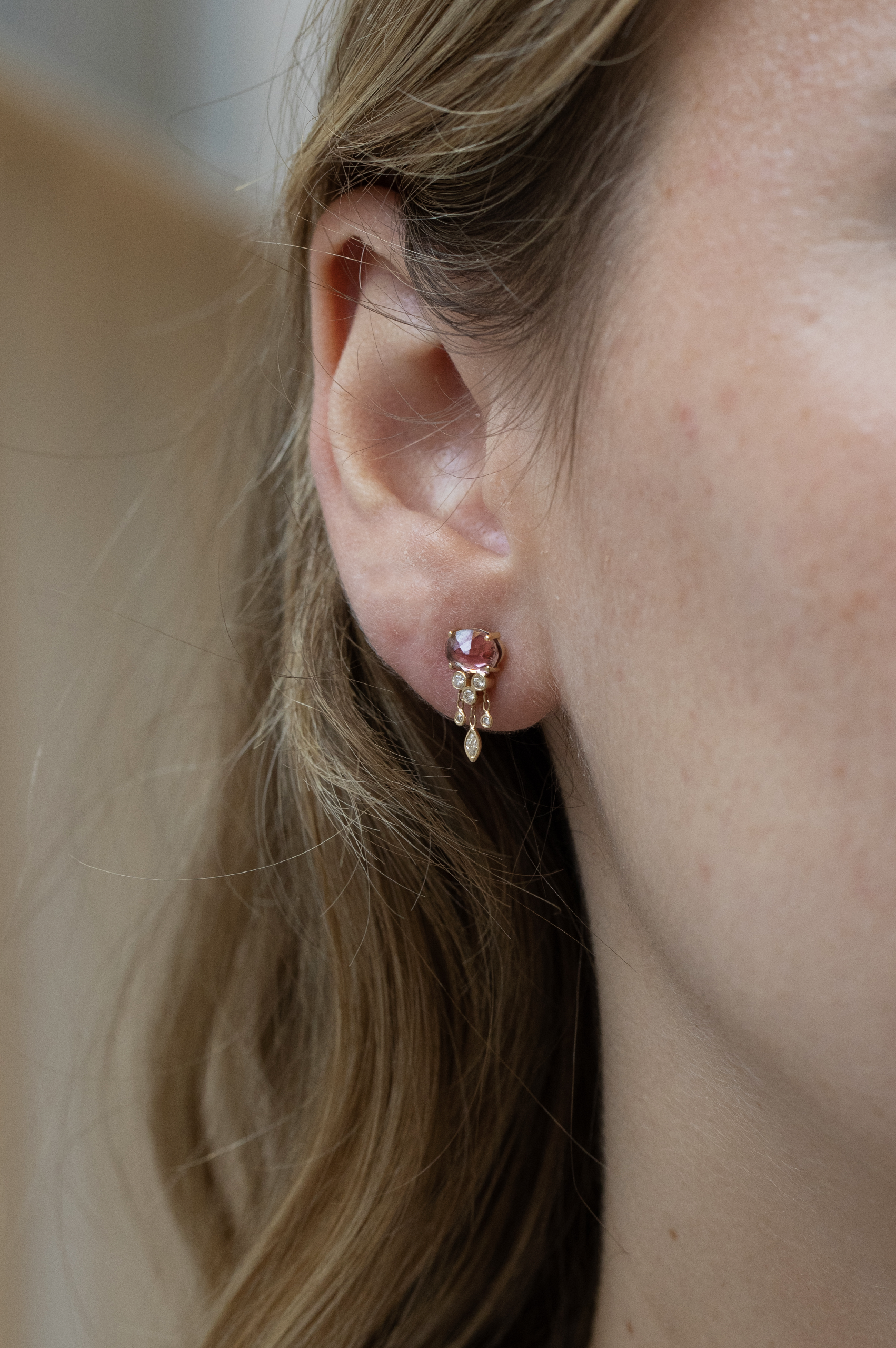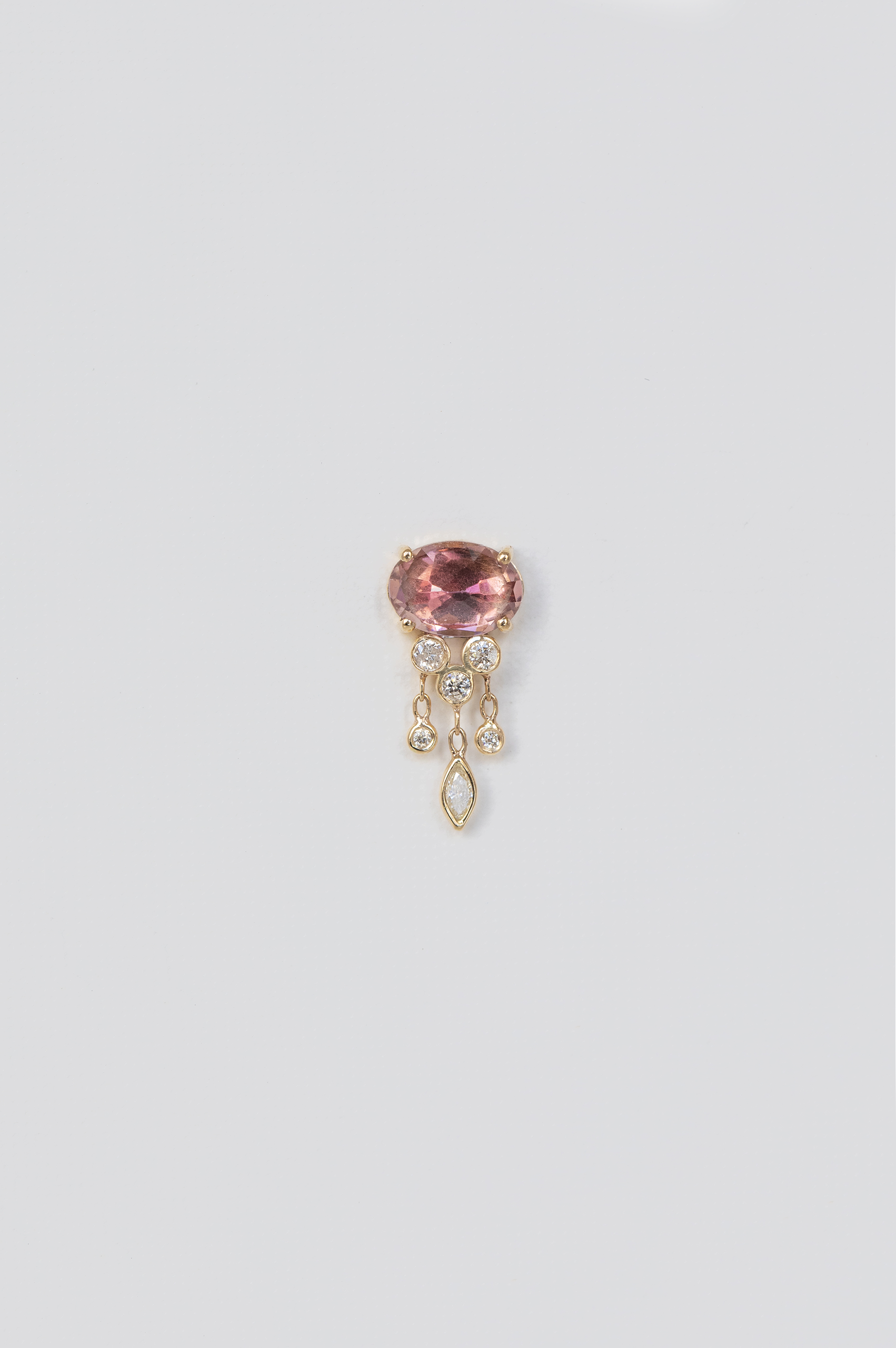 Céline Daoust 14k light yellow gold pink tourmaline & dangling diamonds jellyfish earring. The stone is a gradient of peach pink.