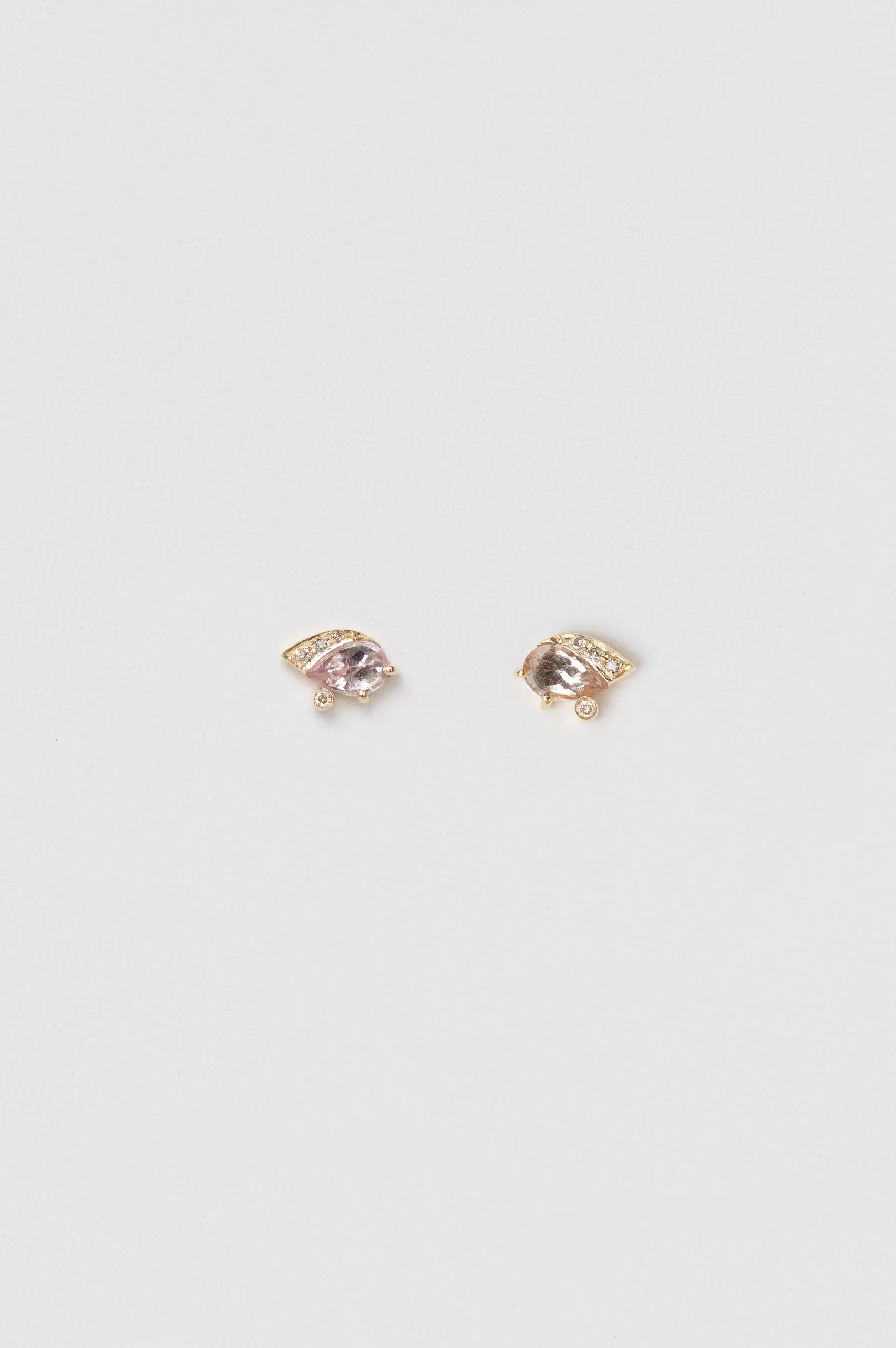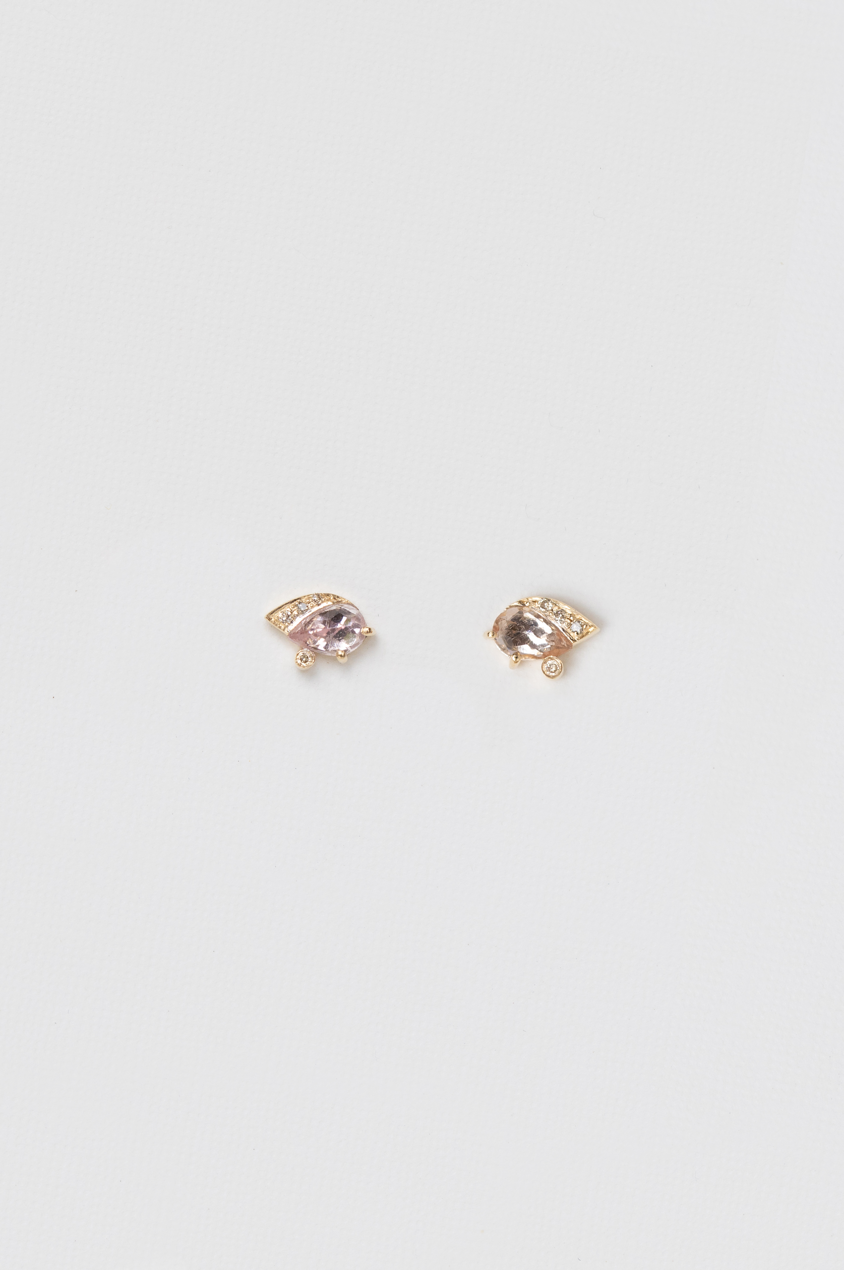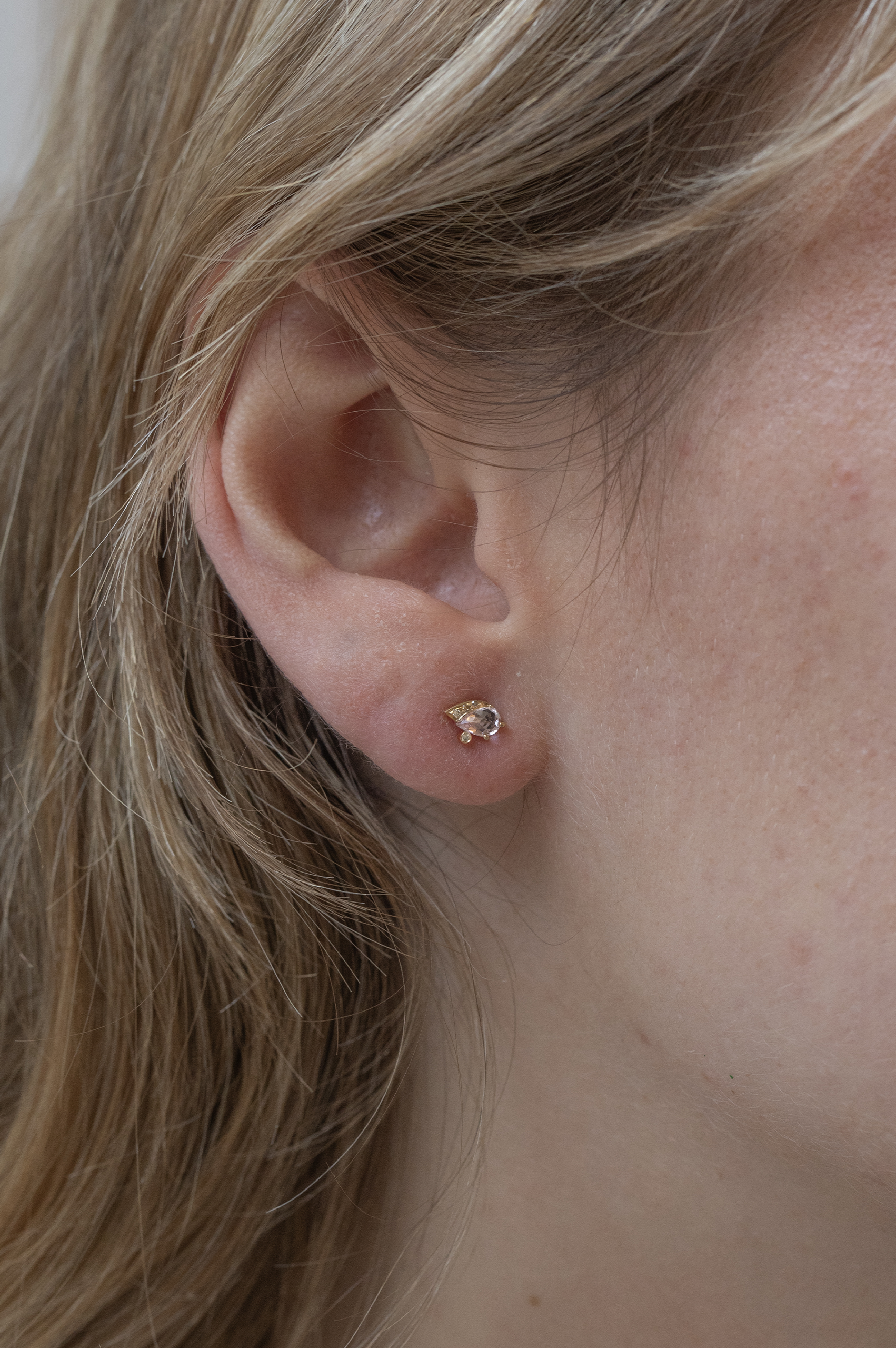Céline Daoust 14k light yellow gold earrings with one pink tourmaline eye and four diamonds.