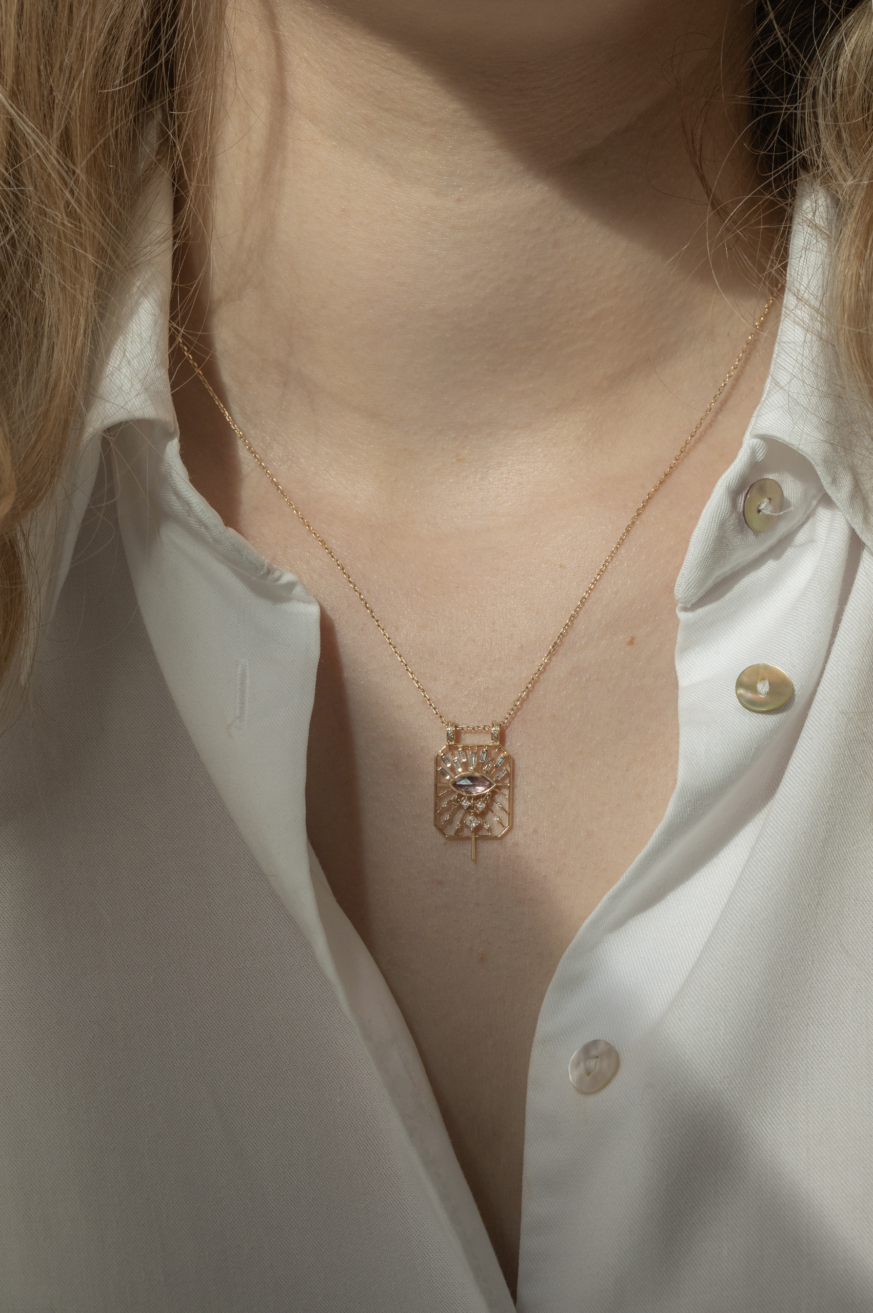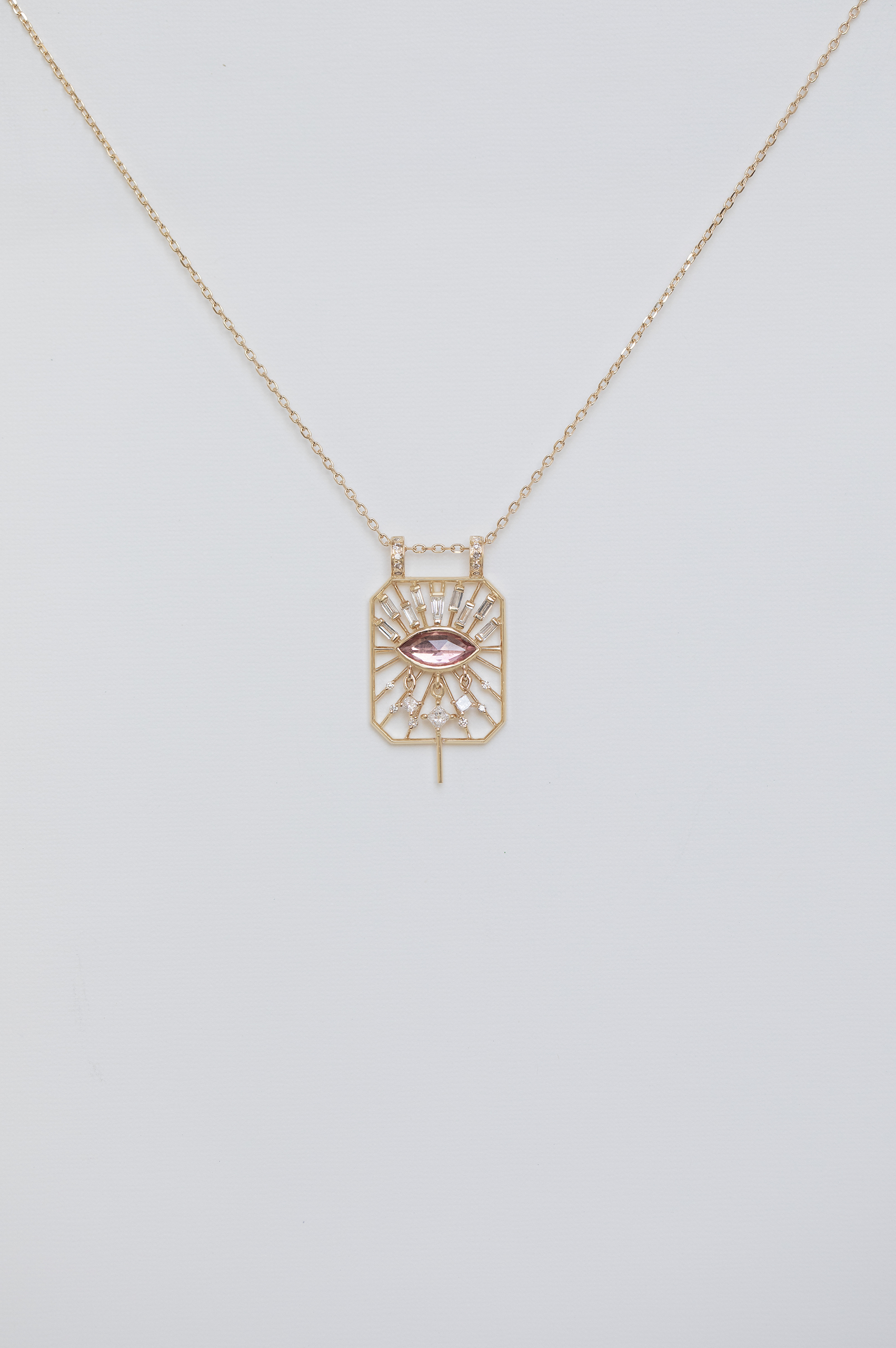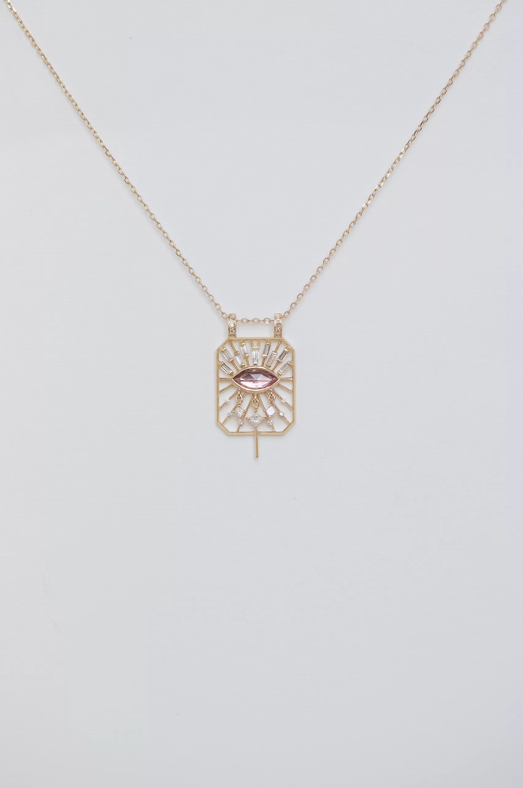 Celine Daoust 14k light yellow gold pink tourmaline marquise eye open rectangle chain necklace with diamonds. The stone comes in a gradient of pink.