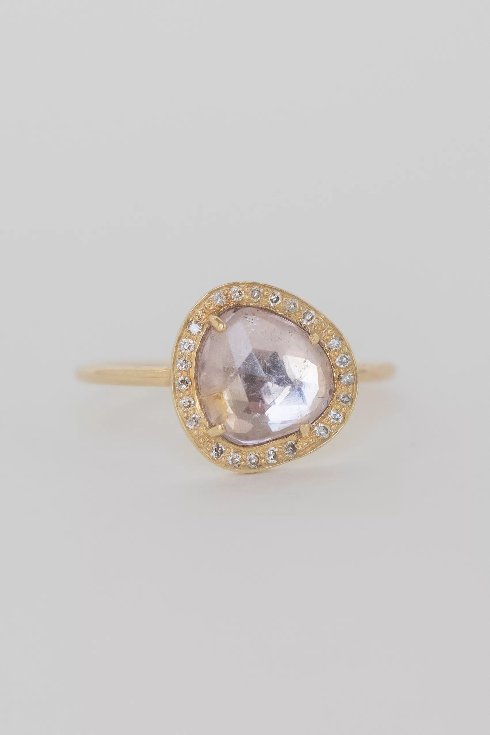 Céline Daoust 14k light yellow gold stella ring with a pink tourmaline surrounded by diamonds. The stone comes in a gradient of light pink.
