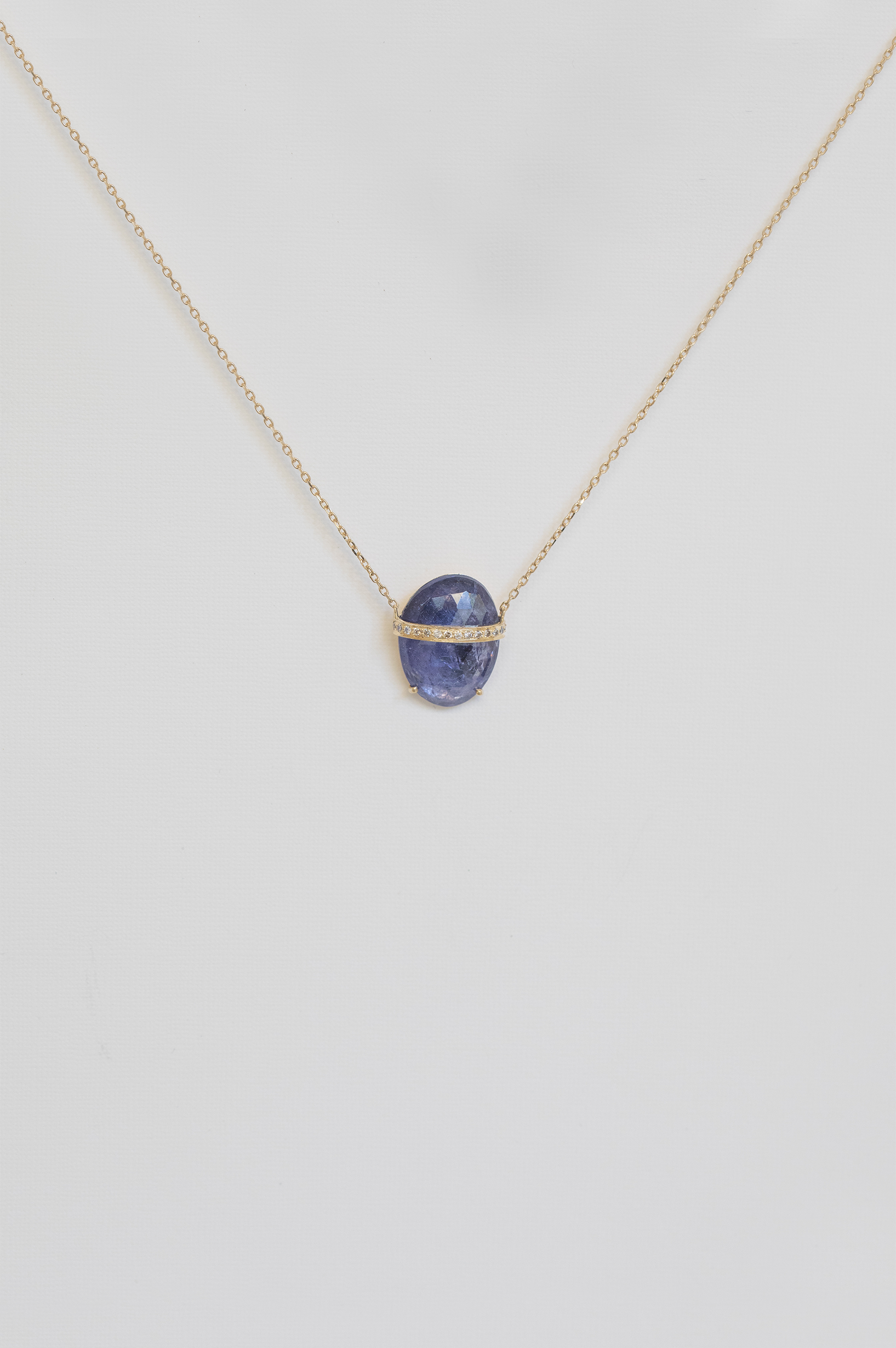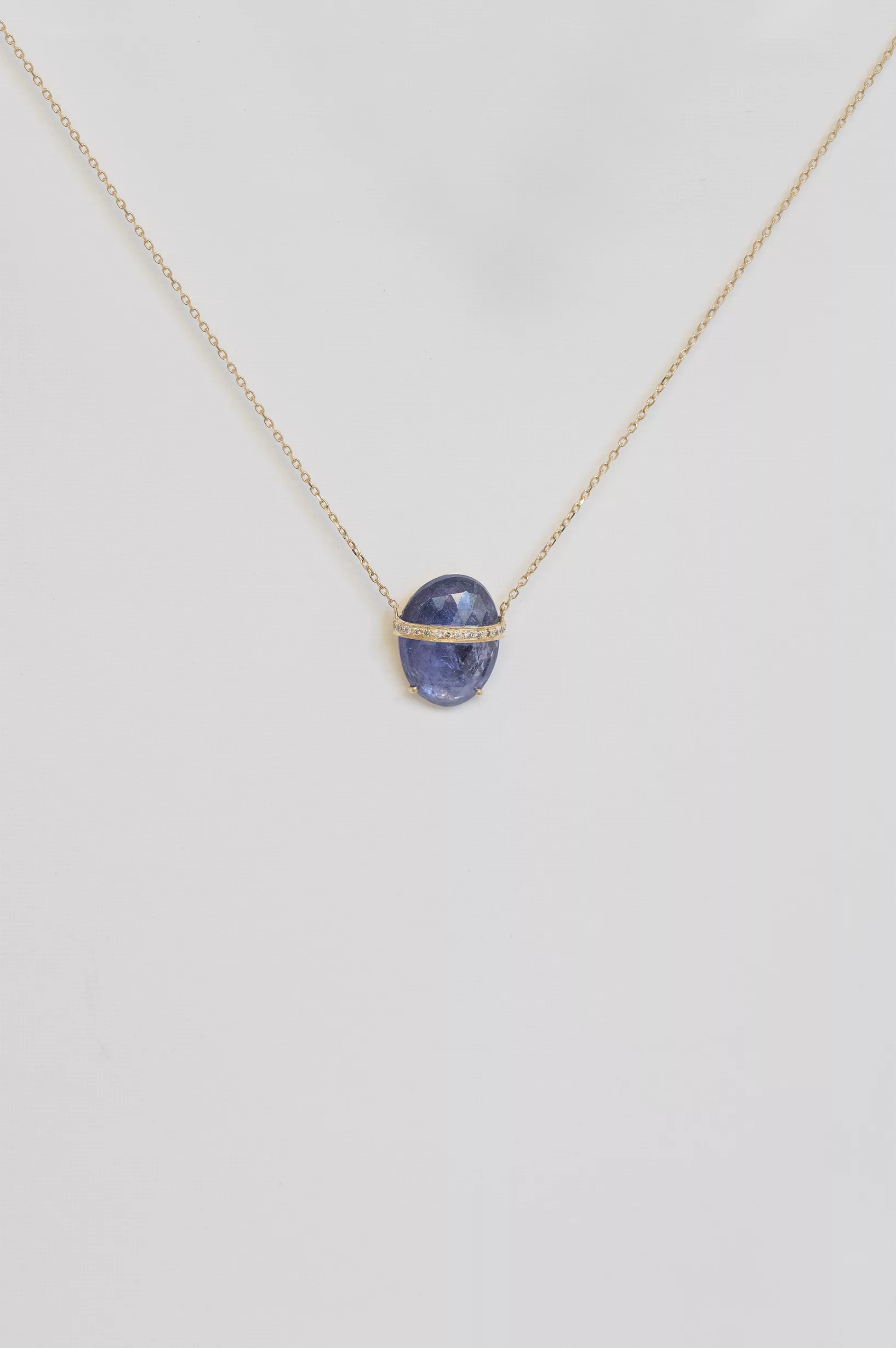 Celine Daoust 14k light yellow gold necklace with a rough pencil rosecut tanzanite and diamonds. The stone comes in a gradient of vivid purple and blue.