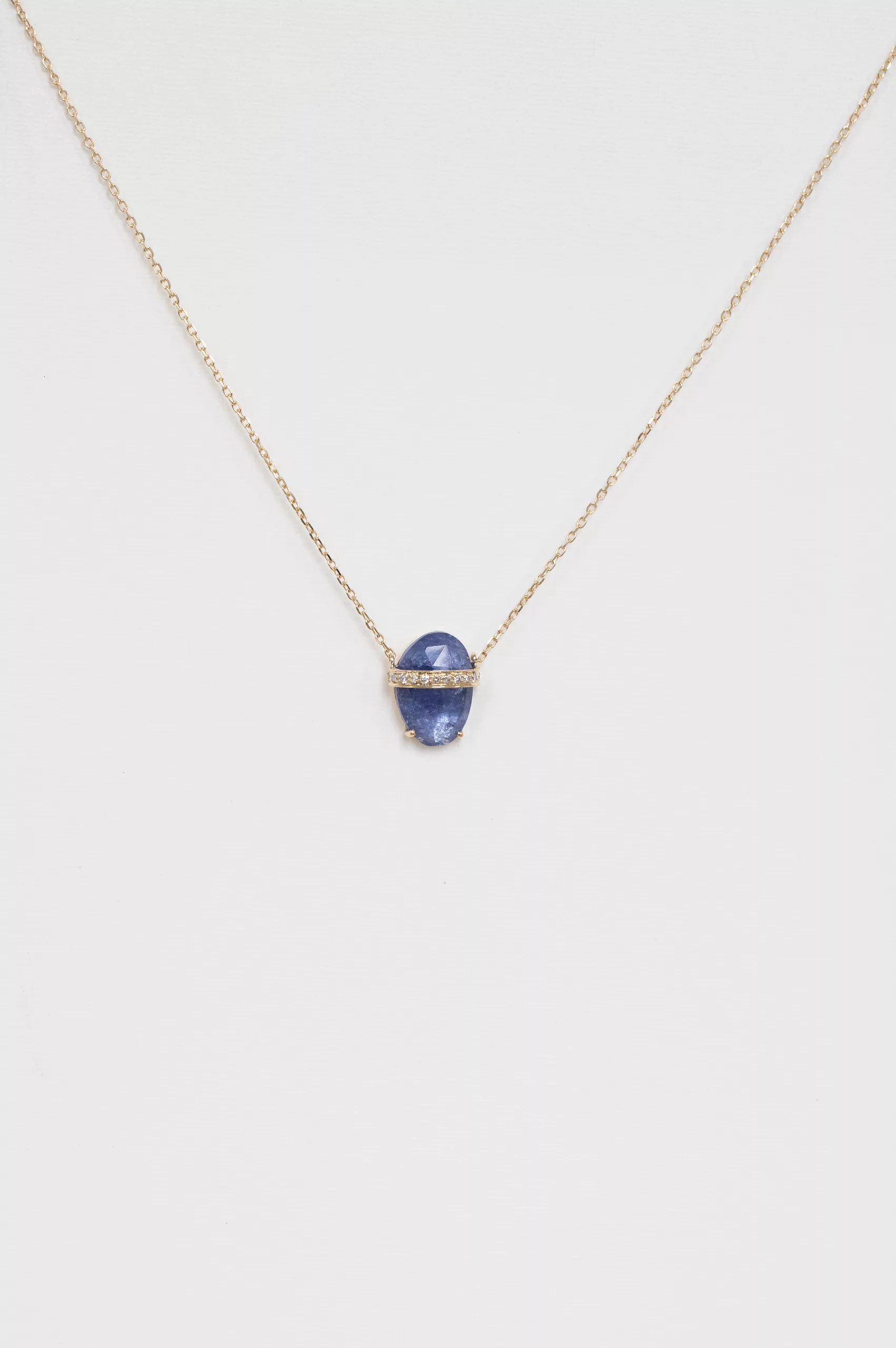 Celine Daoust 14k light yellow gold necklace with a rough pencil rosecut tanzanite and diamonds. The stone comes in a gradient of vivid purple and blue.