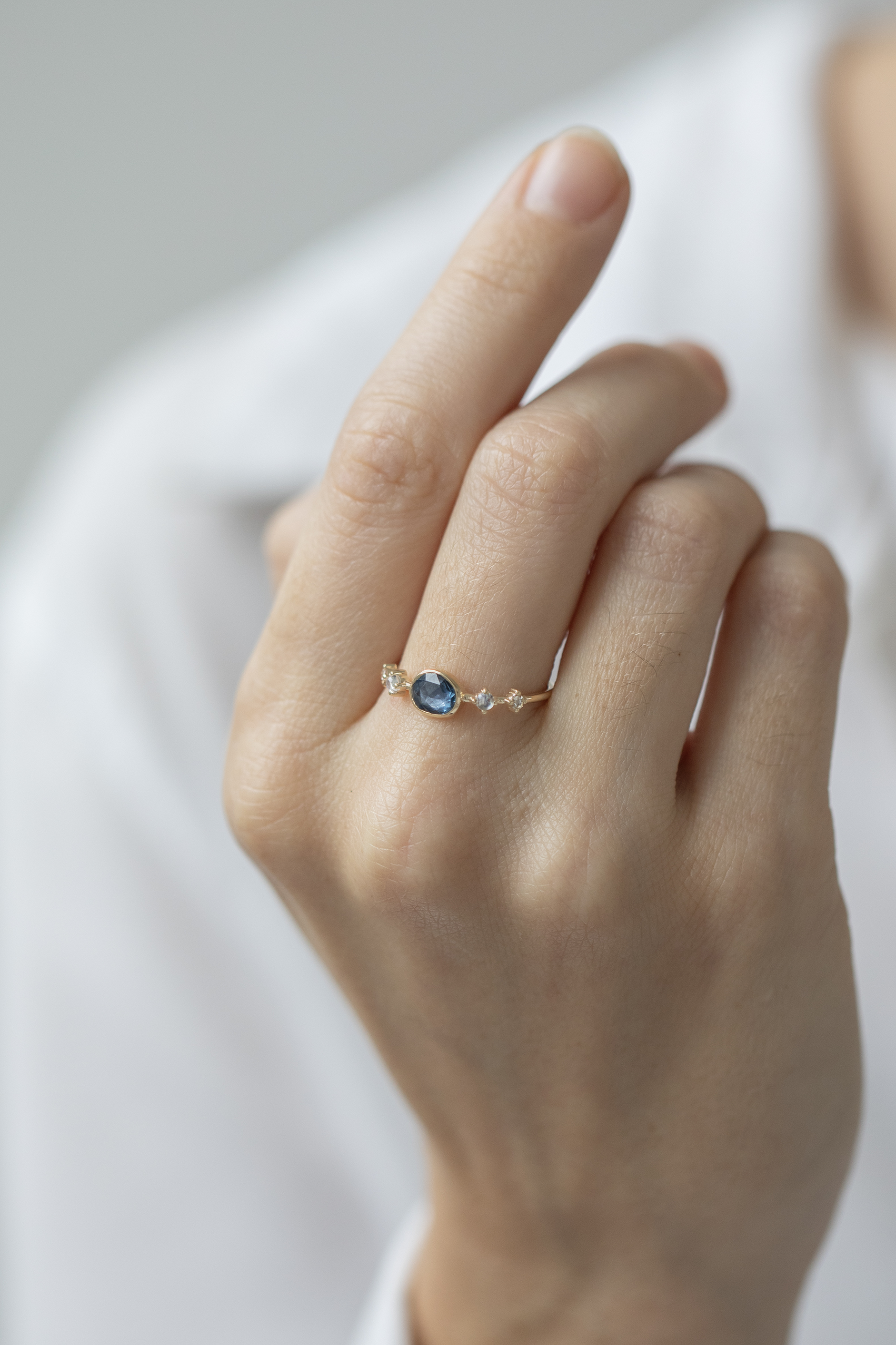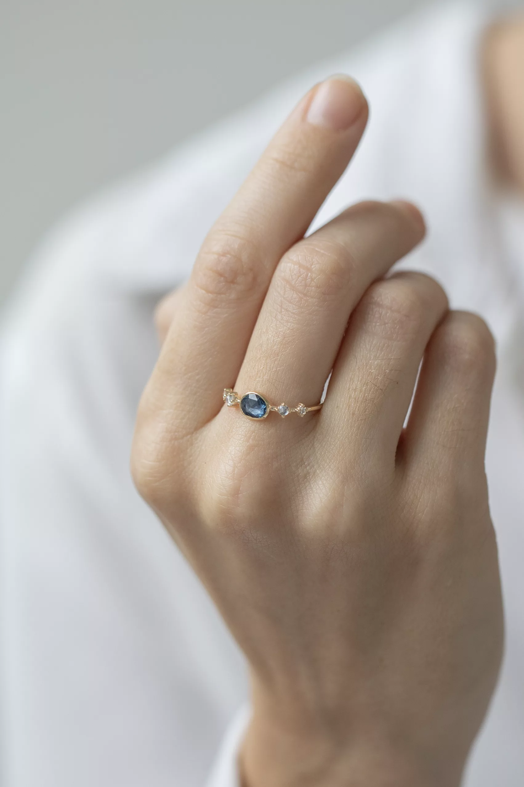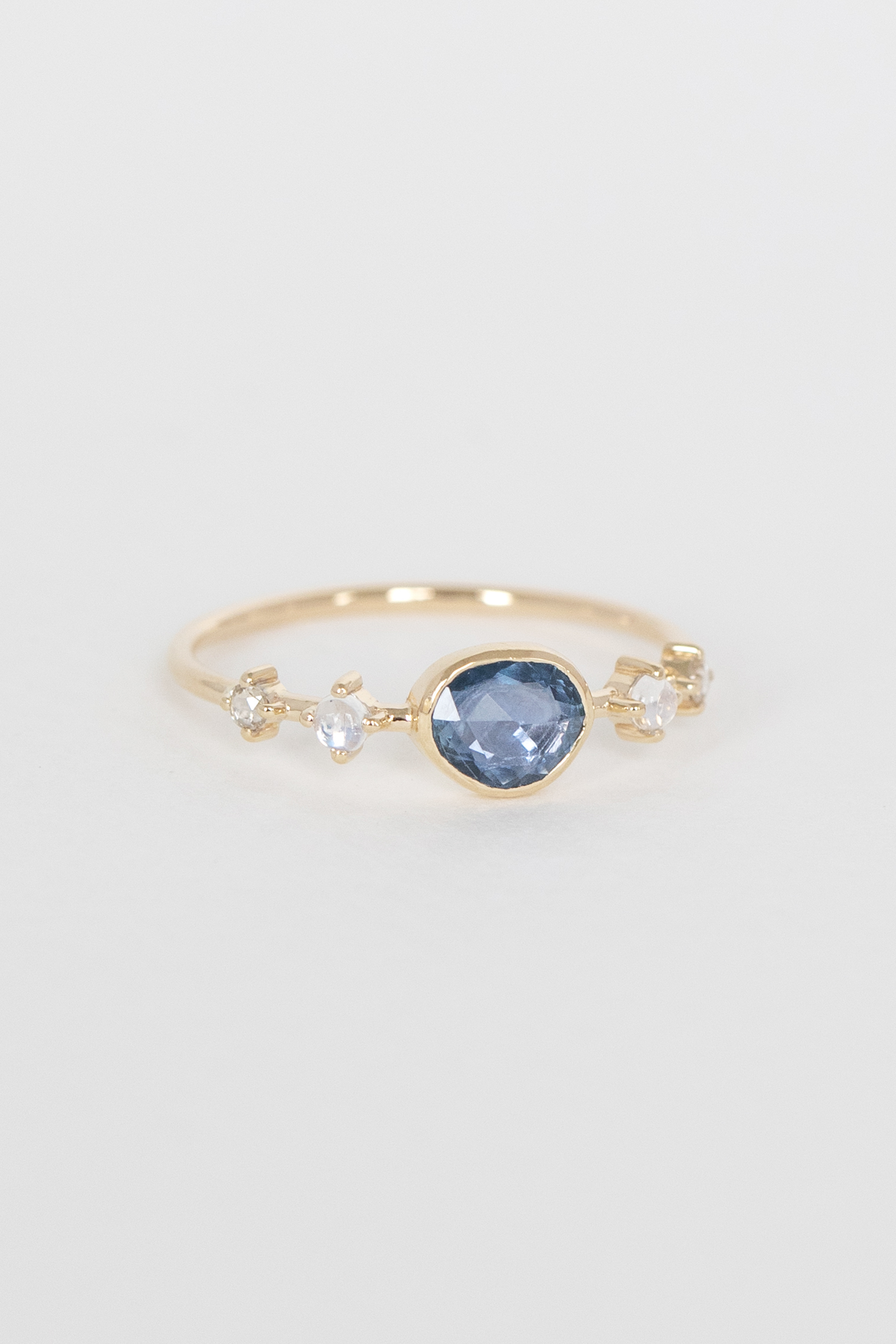 Celine Daoust 14k light yellow gold ring with one central sapphire, two moonstones and two diamonds. The stone comes in a gradient of blue.