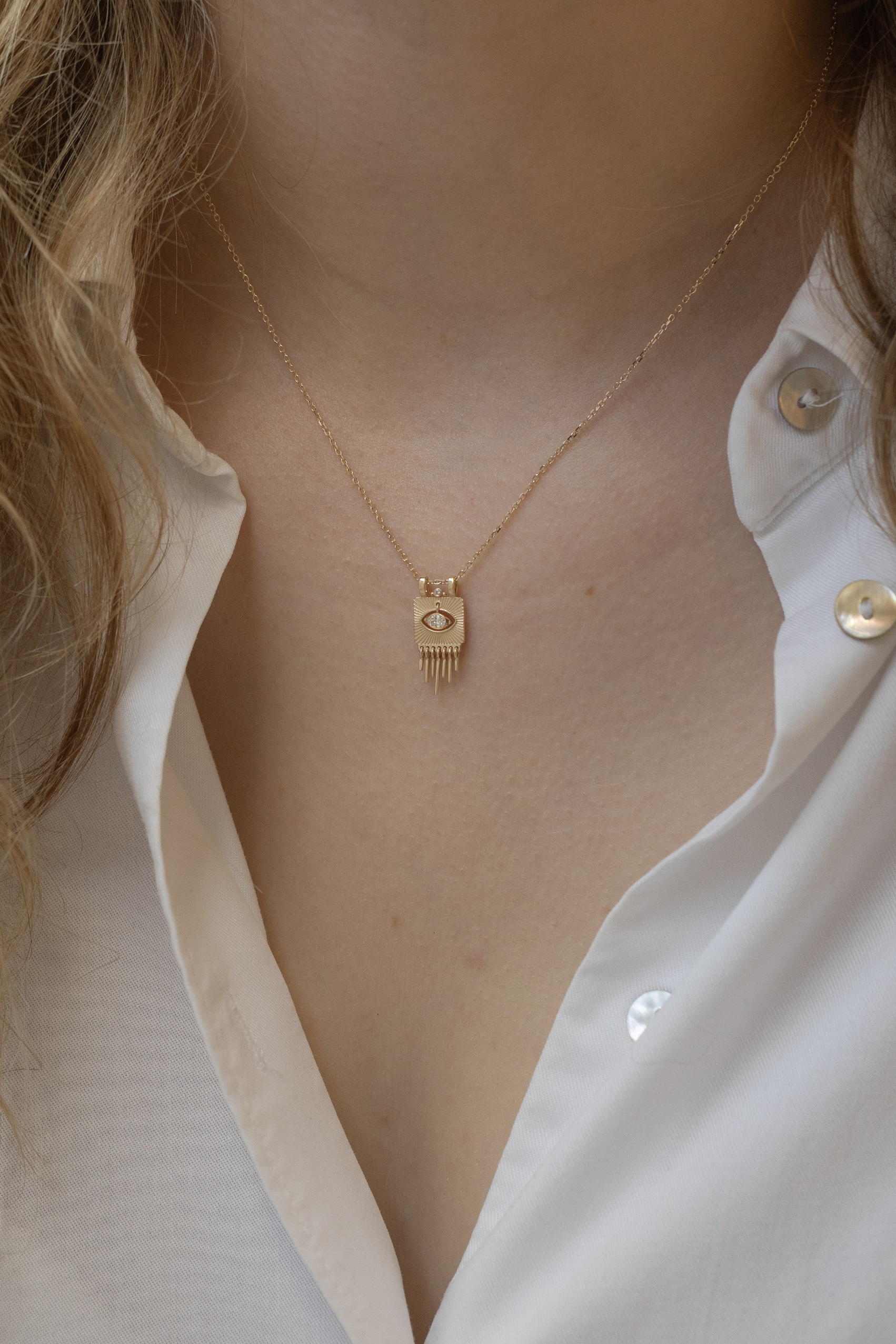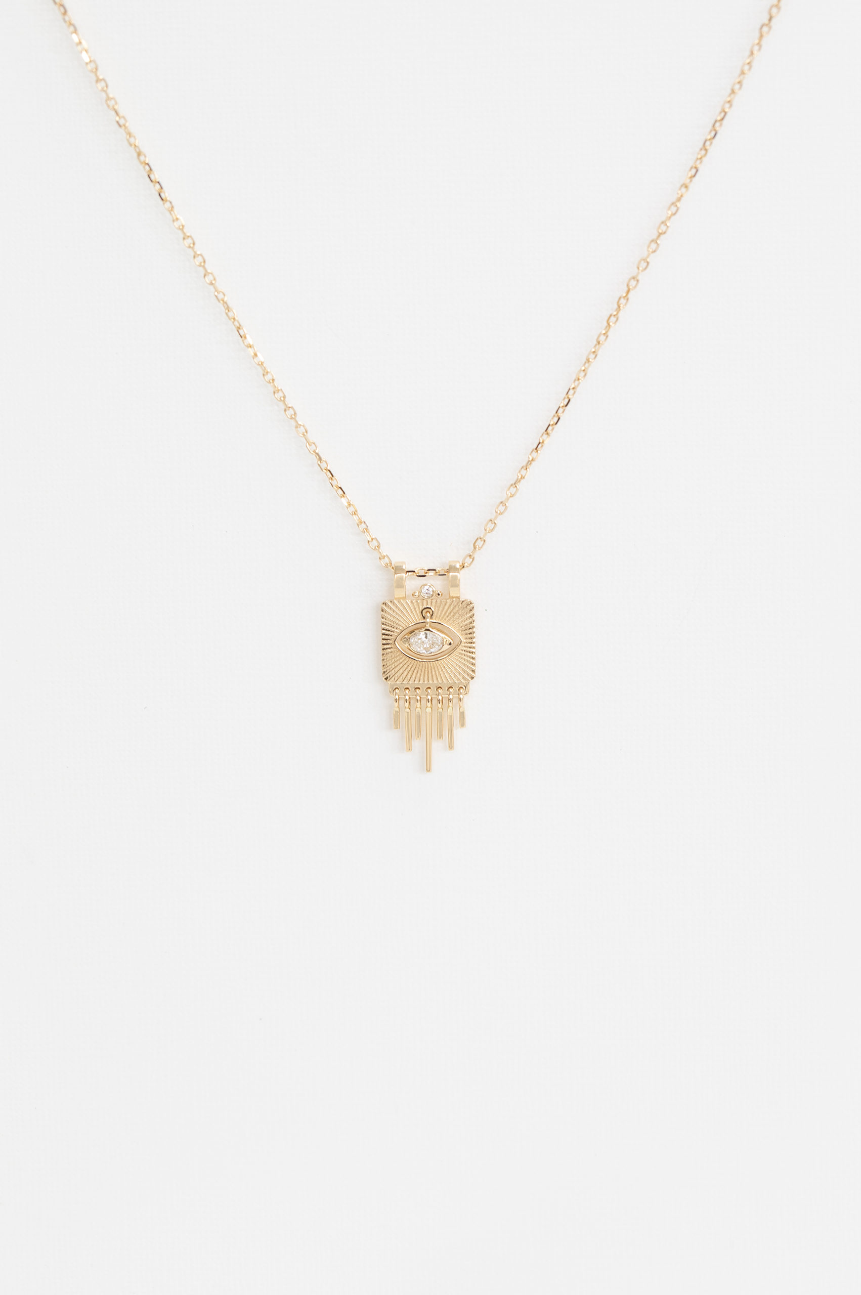 Celine Daoust 14k light yellow solid gold plate small pendant necklace with diamond eye and dangling details.