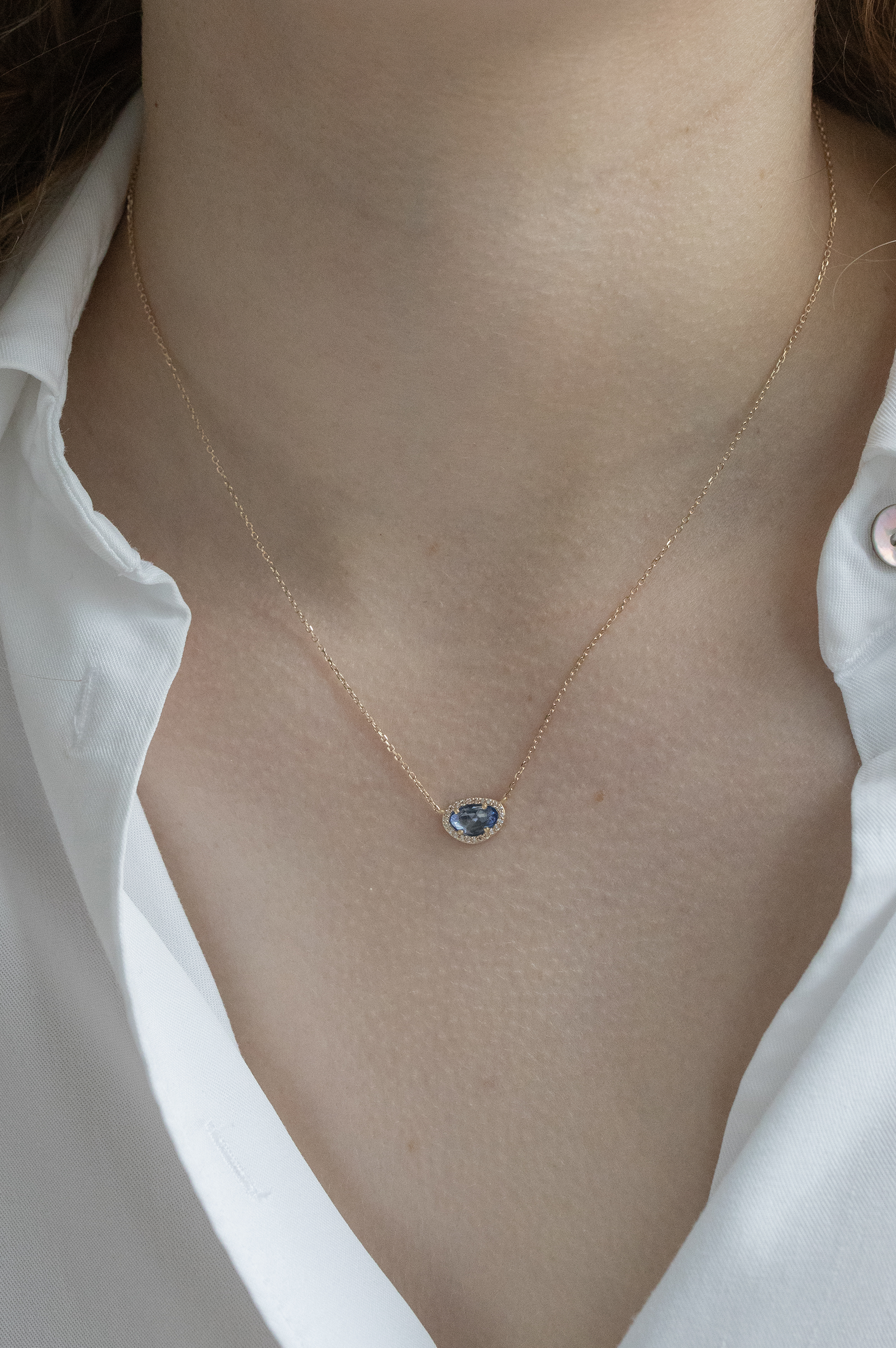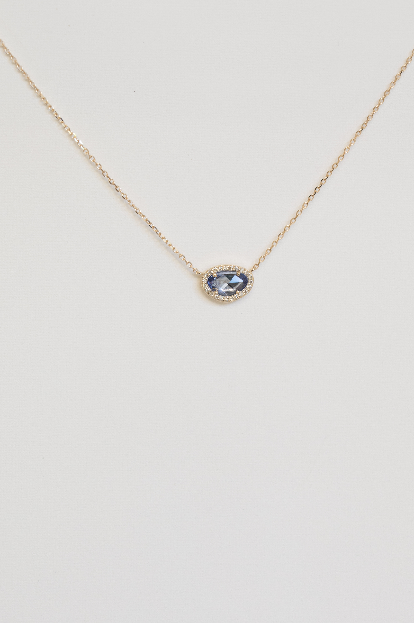 Celine Daoust 14k light yellow gold chain necklace with one sapphire surrounded by diamonds. The stone comes in a gradient of blue.