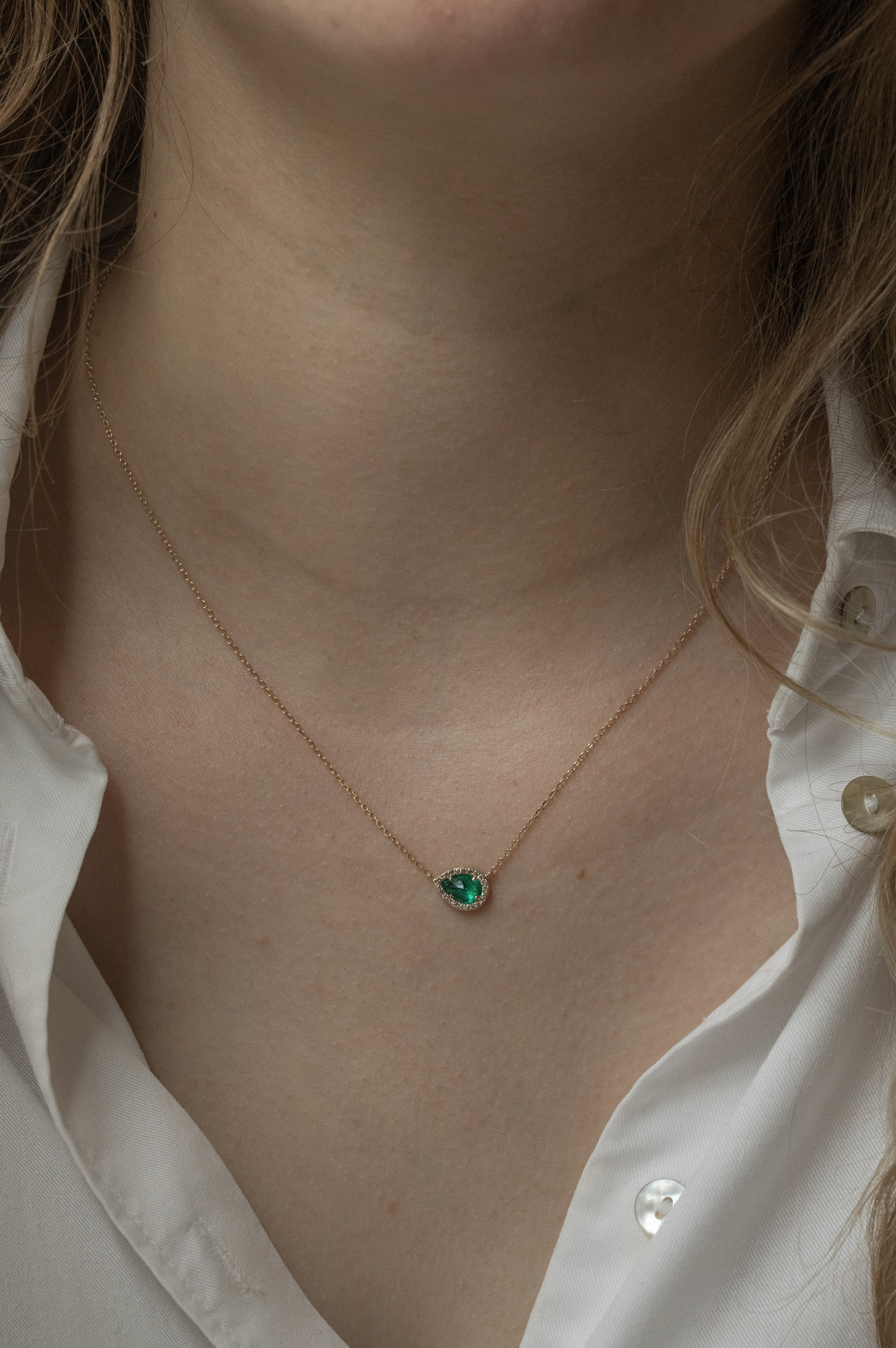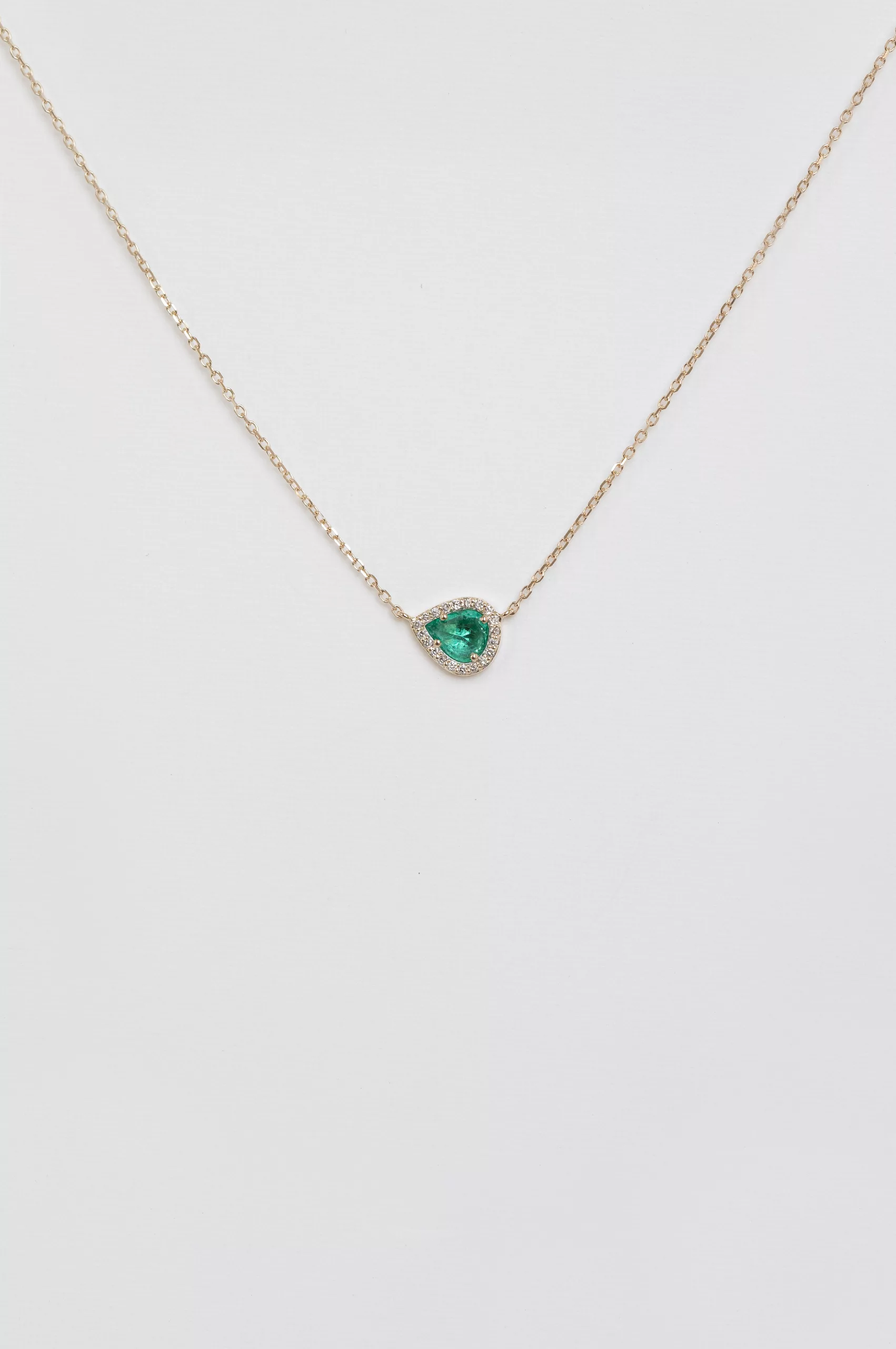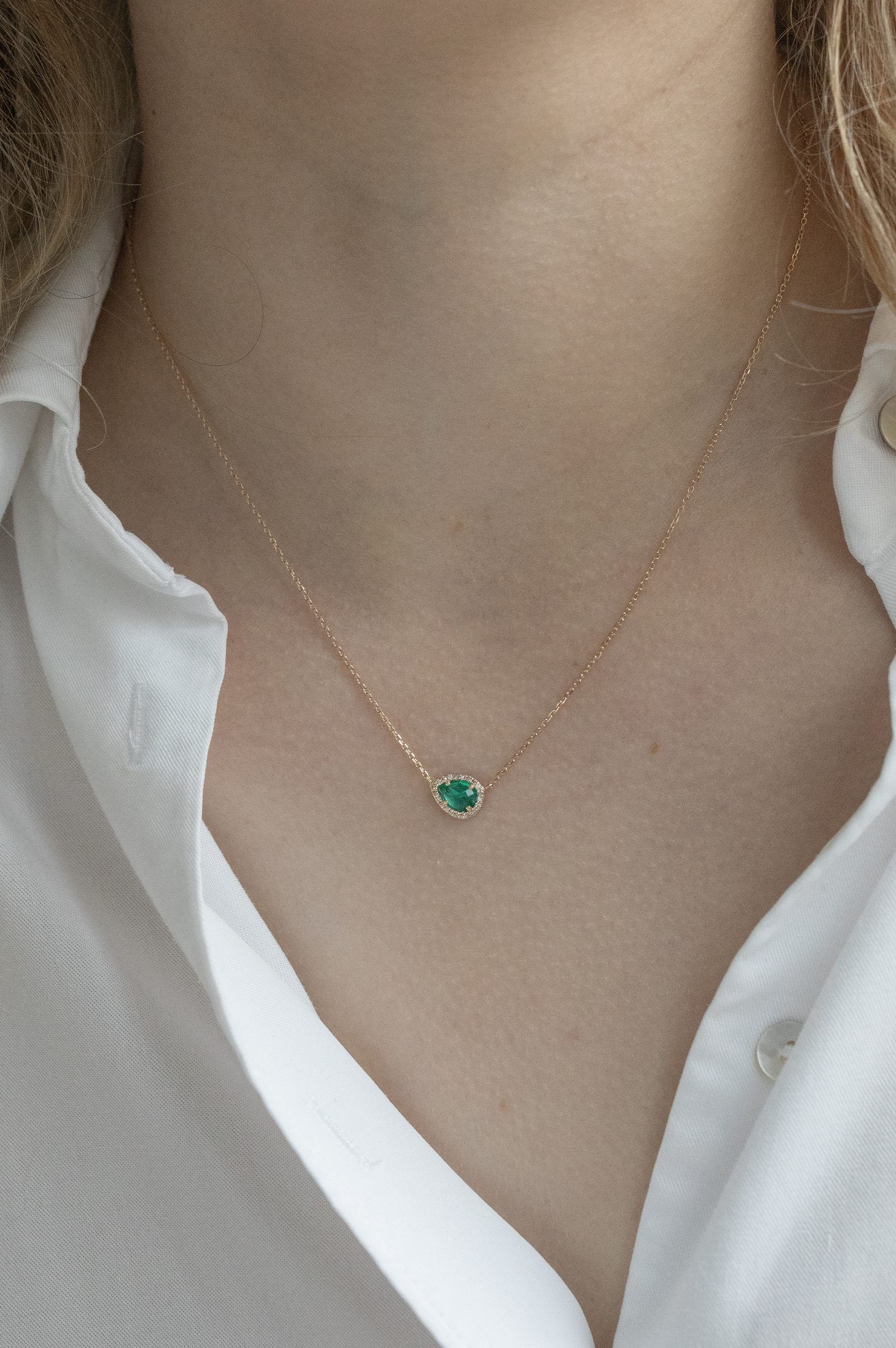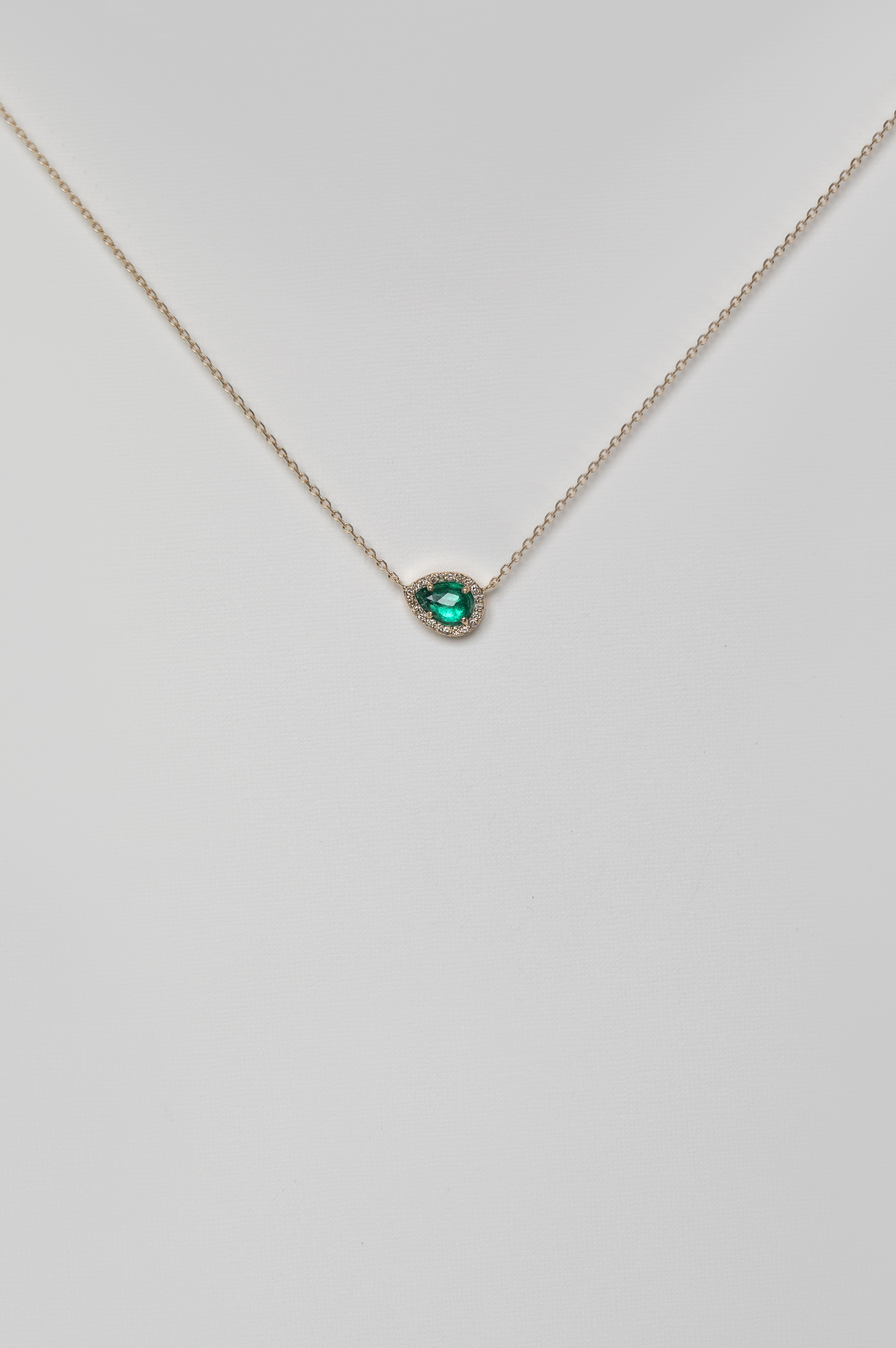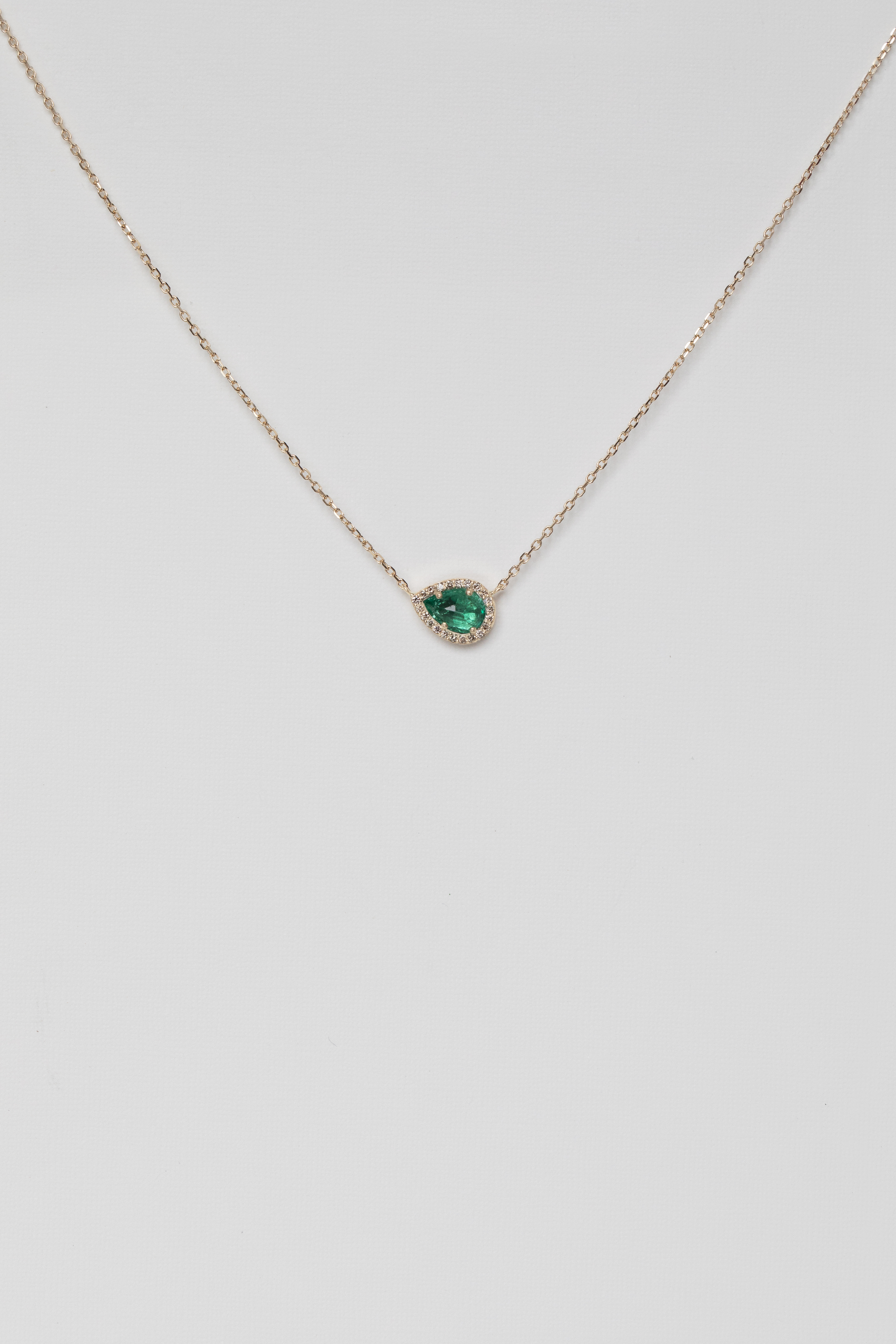 Celine Daoust 14k light yellow gold stella necklace with one emerald surrounded by diamonds. The stone color is an intense green.