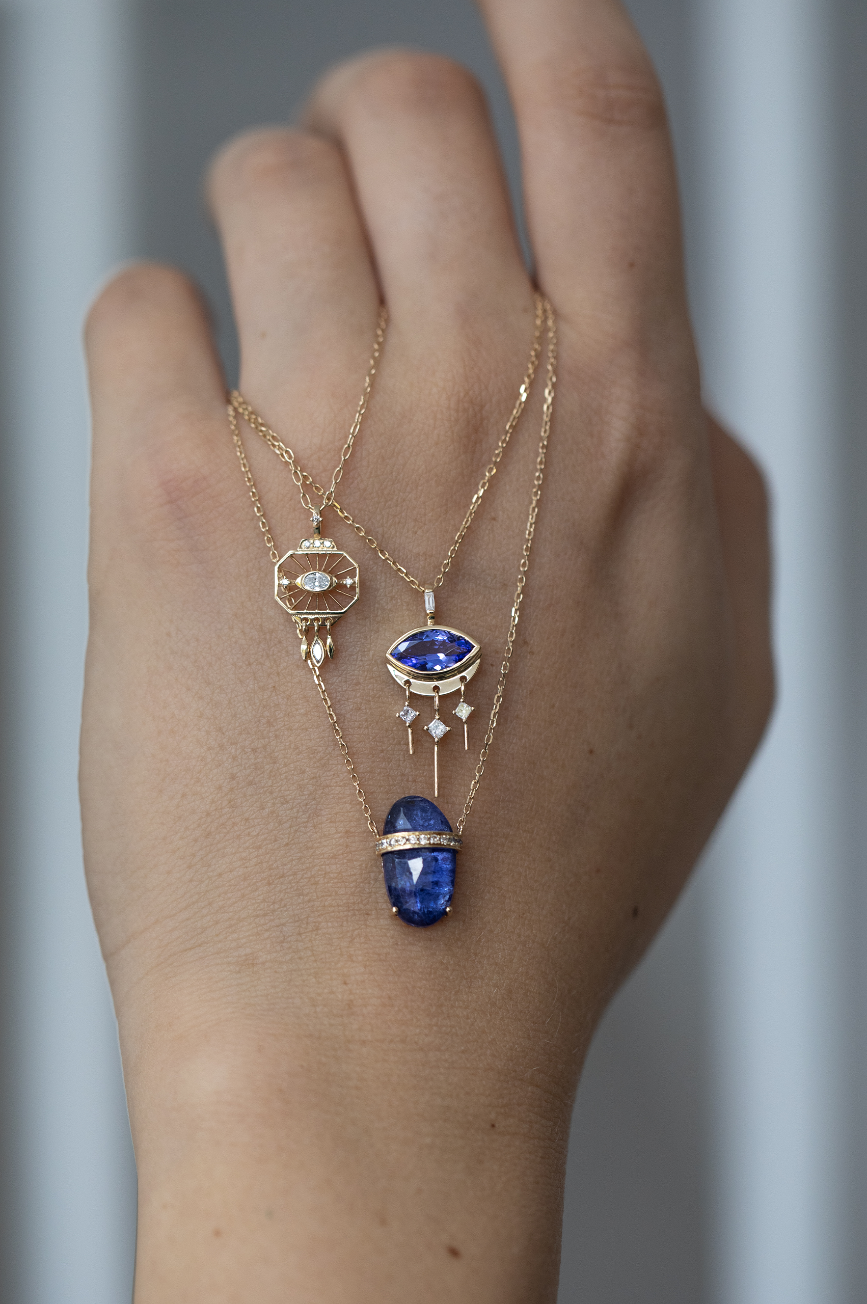 Céline Daoust 14k light yellow gold Tanzanite Marquise Eye & Dangling Diamond Necklace.