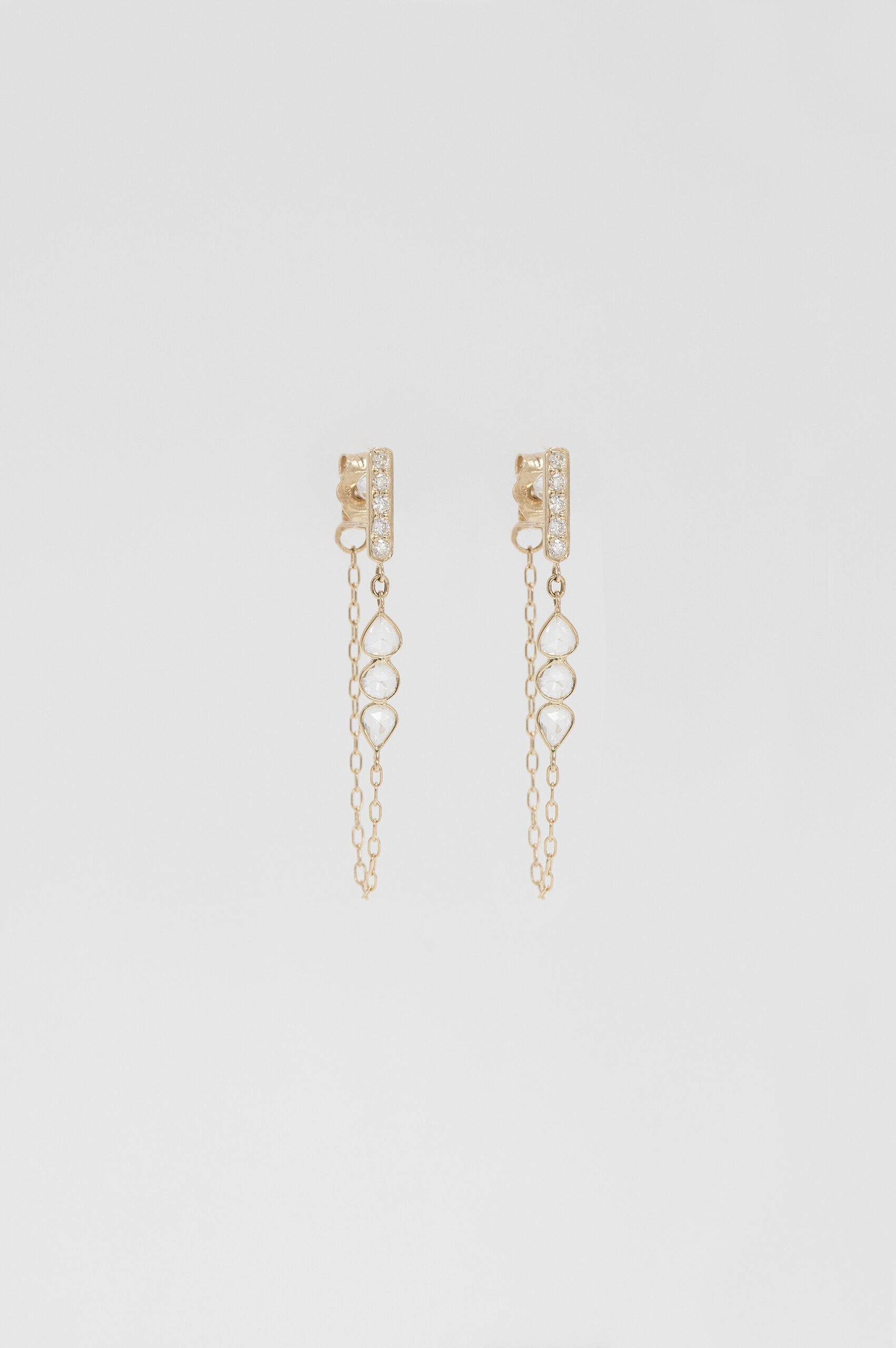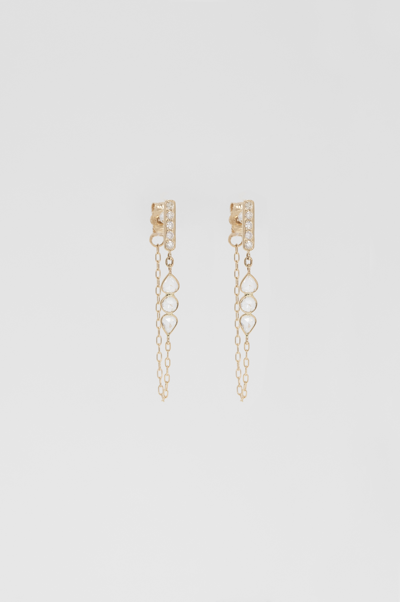 Celine Daoust 14k light yellow gold three champagne diamonds rose cut long chain earring. The stones come in a gradient of white.