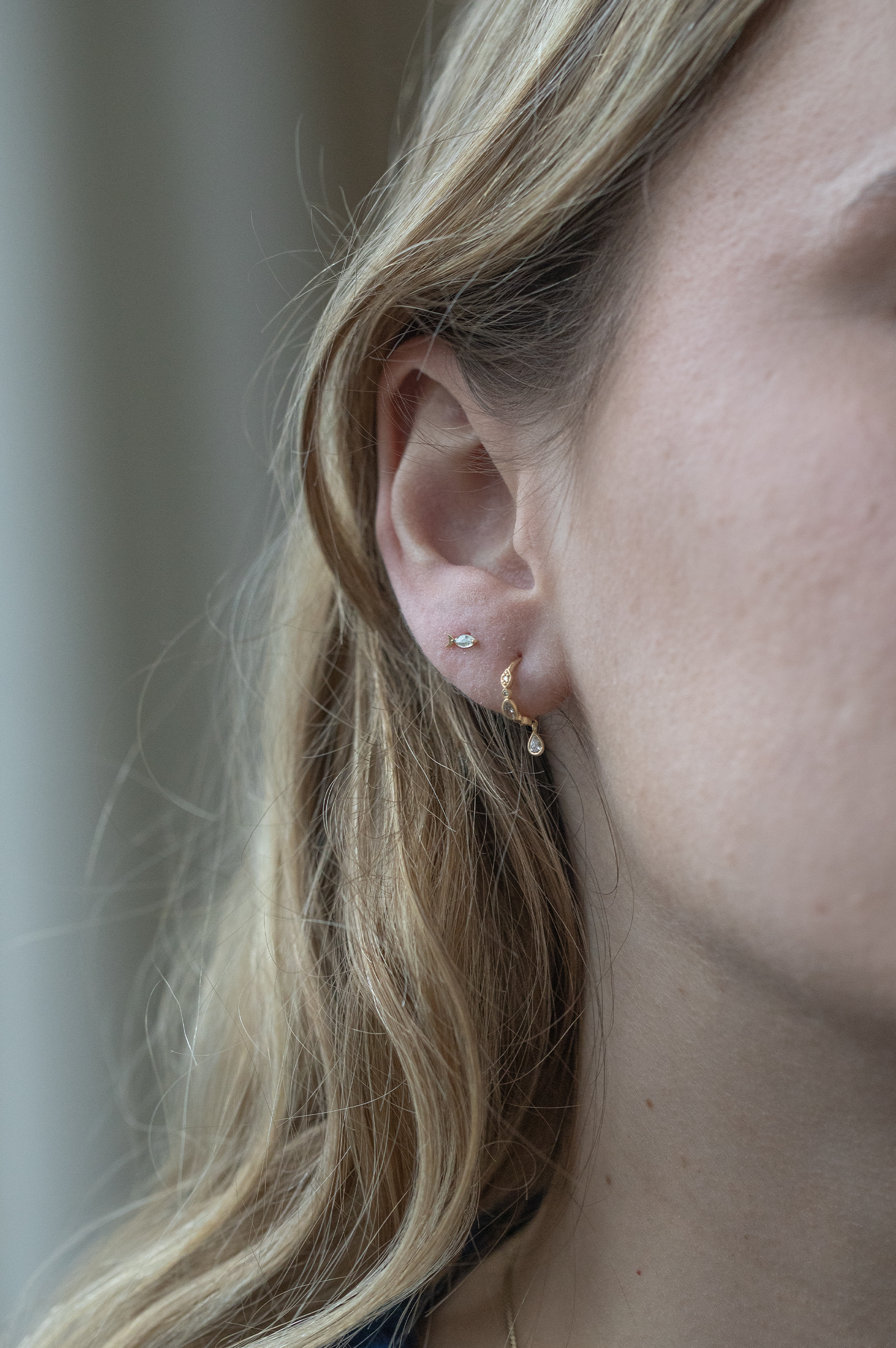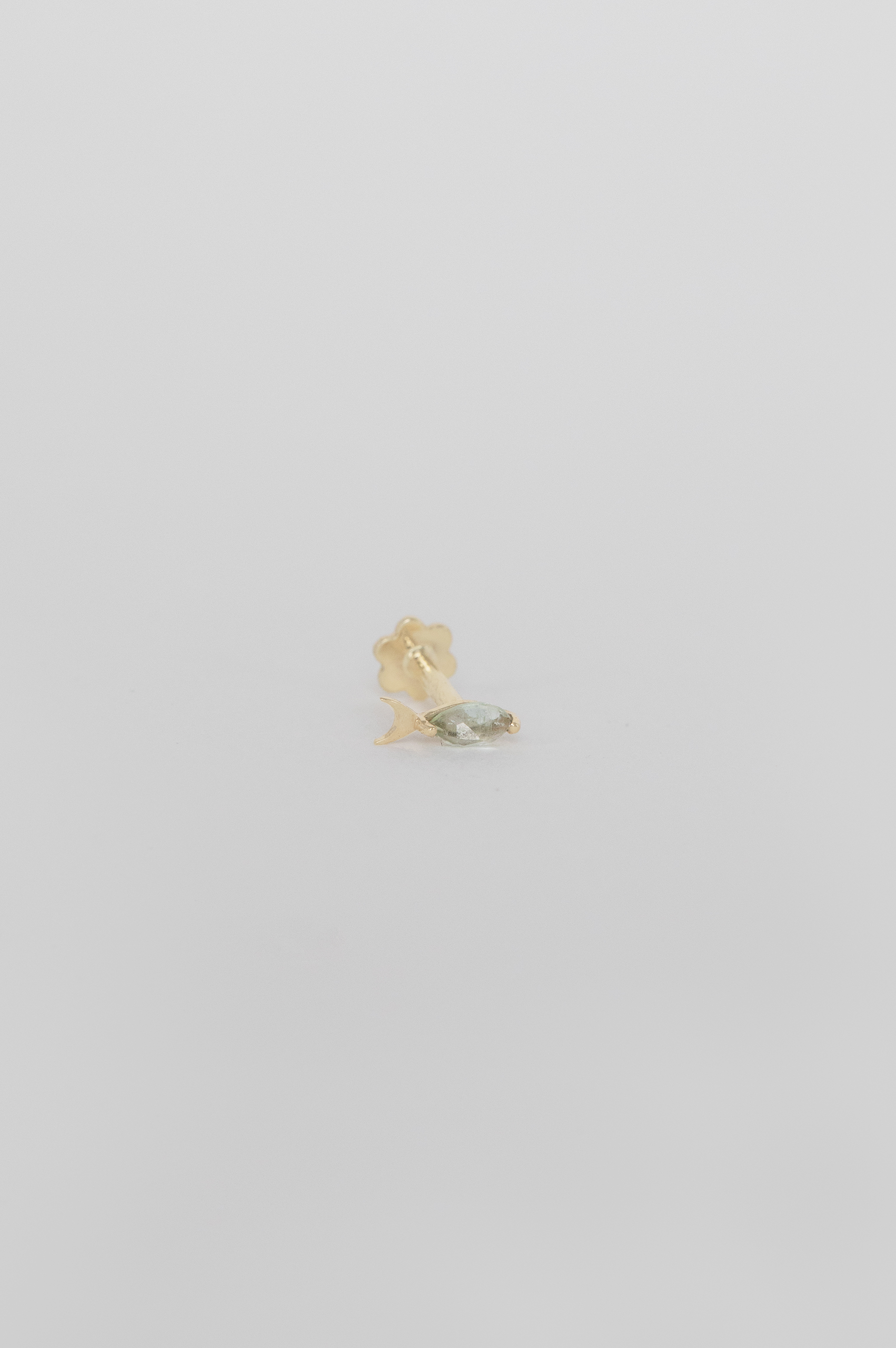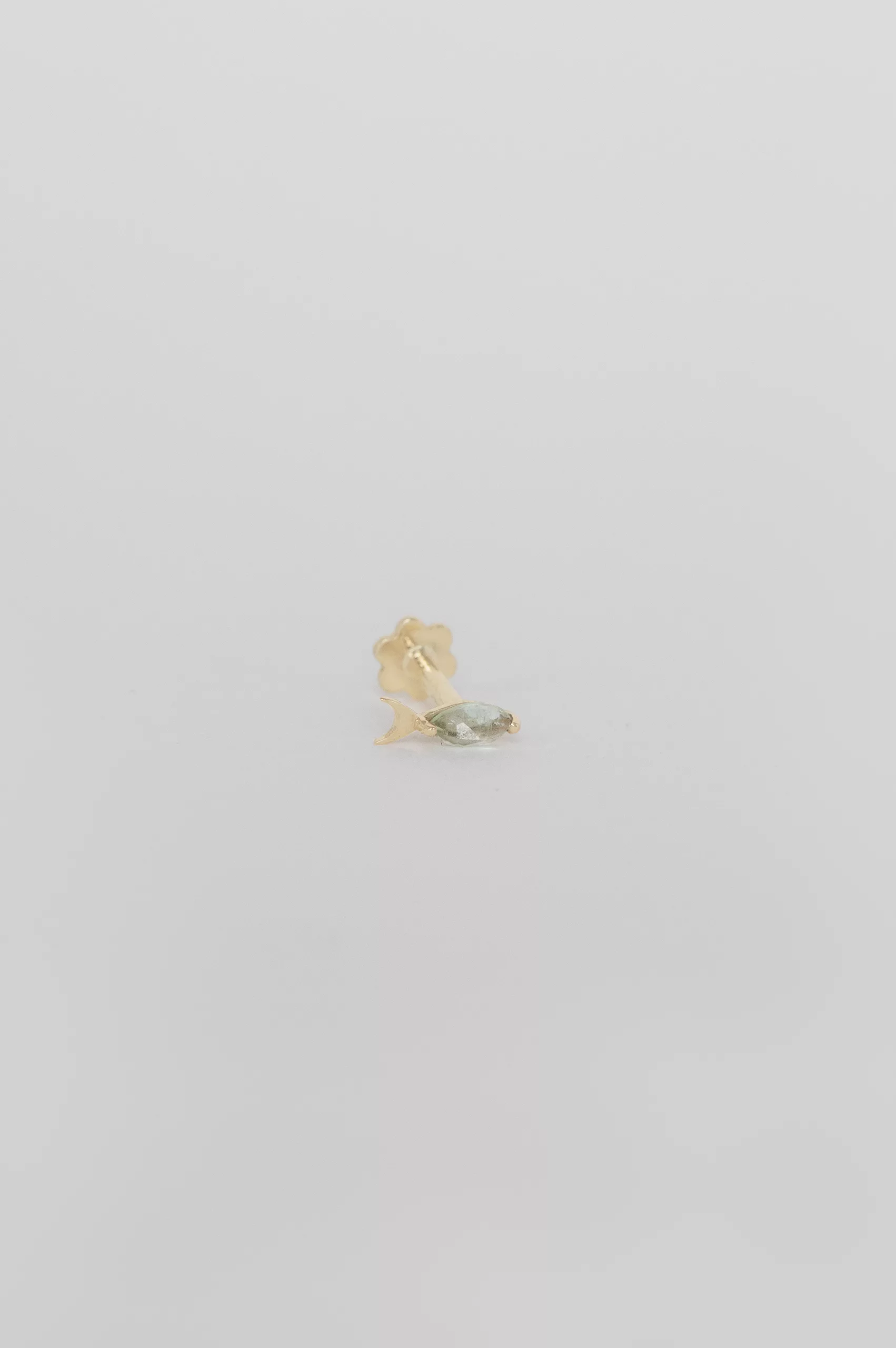 Céline Daoust 14k light yellow gold fish piercing with a one of a kind cristal green tourmaline stone. The stone comes in a gradient of light crystal green.