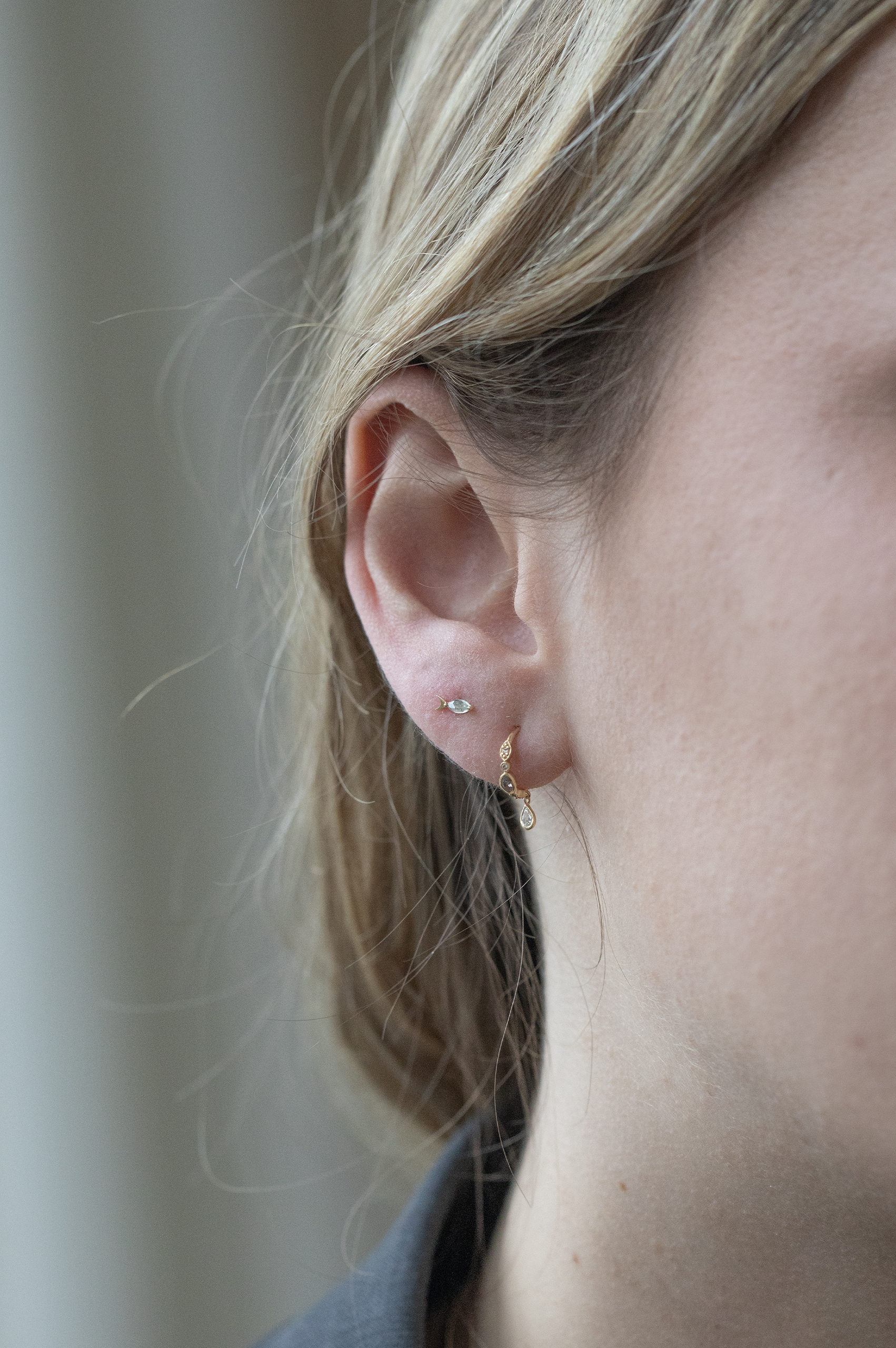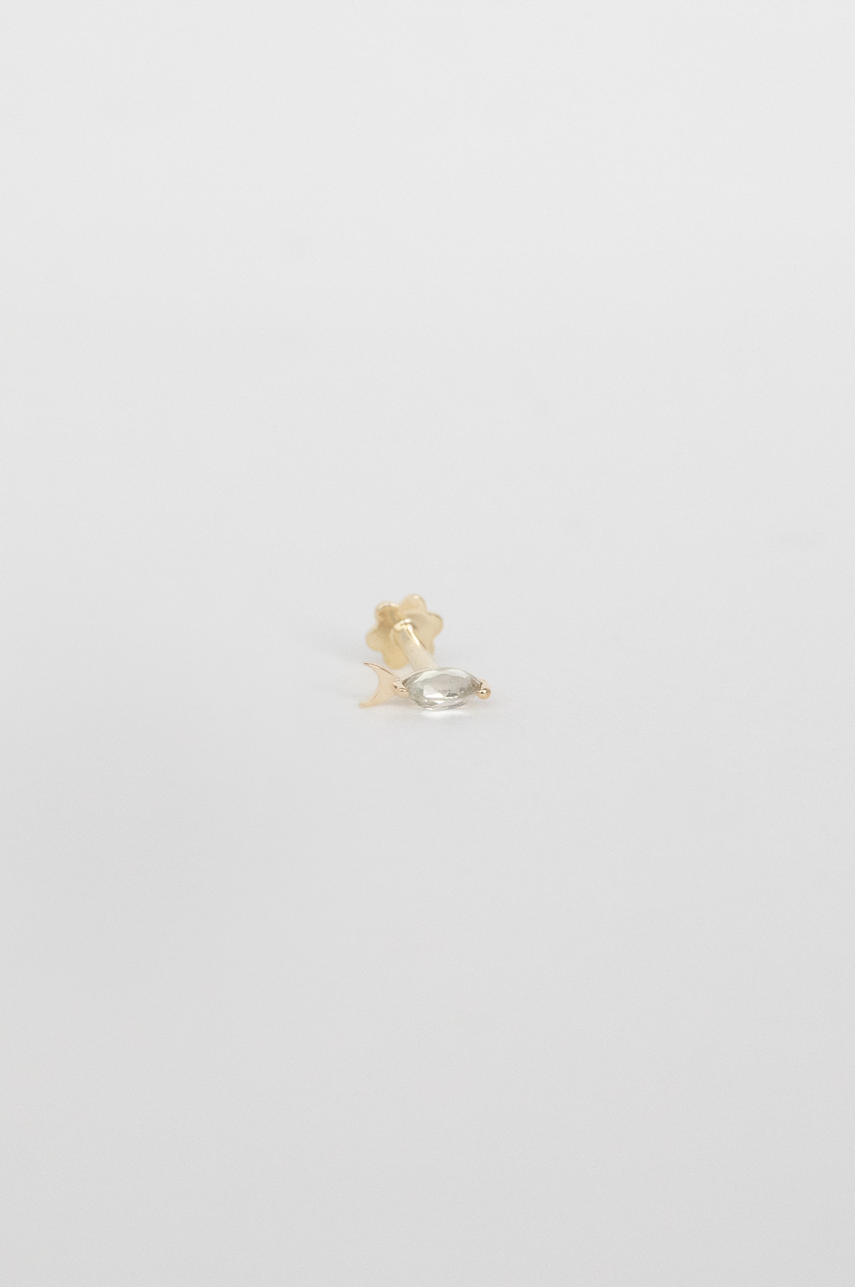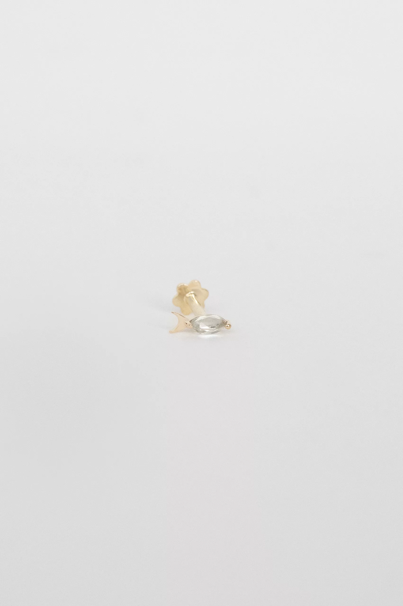 Céline Daoust 14k light yellow gold fish piercing with a one of a kind cristal grey tourmaline stone. The stone comes in a gradient of light grey and crystal.