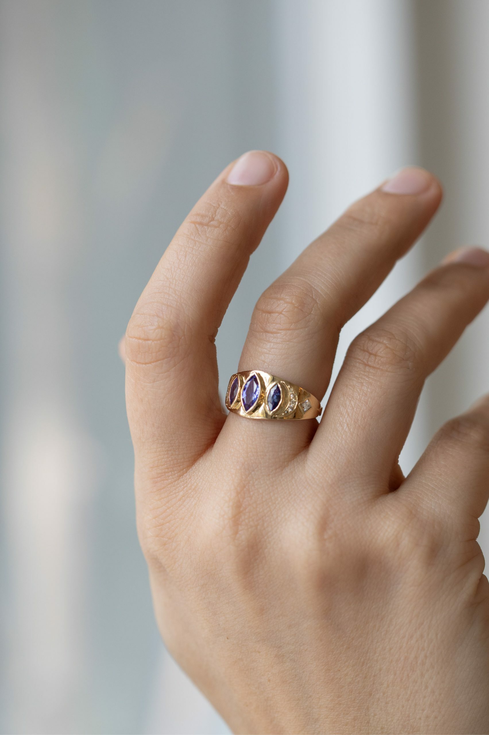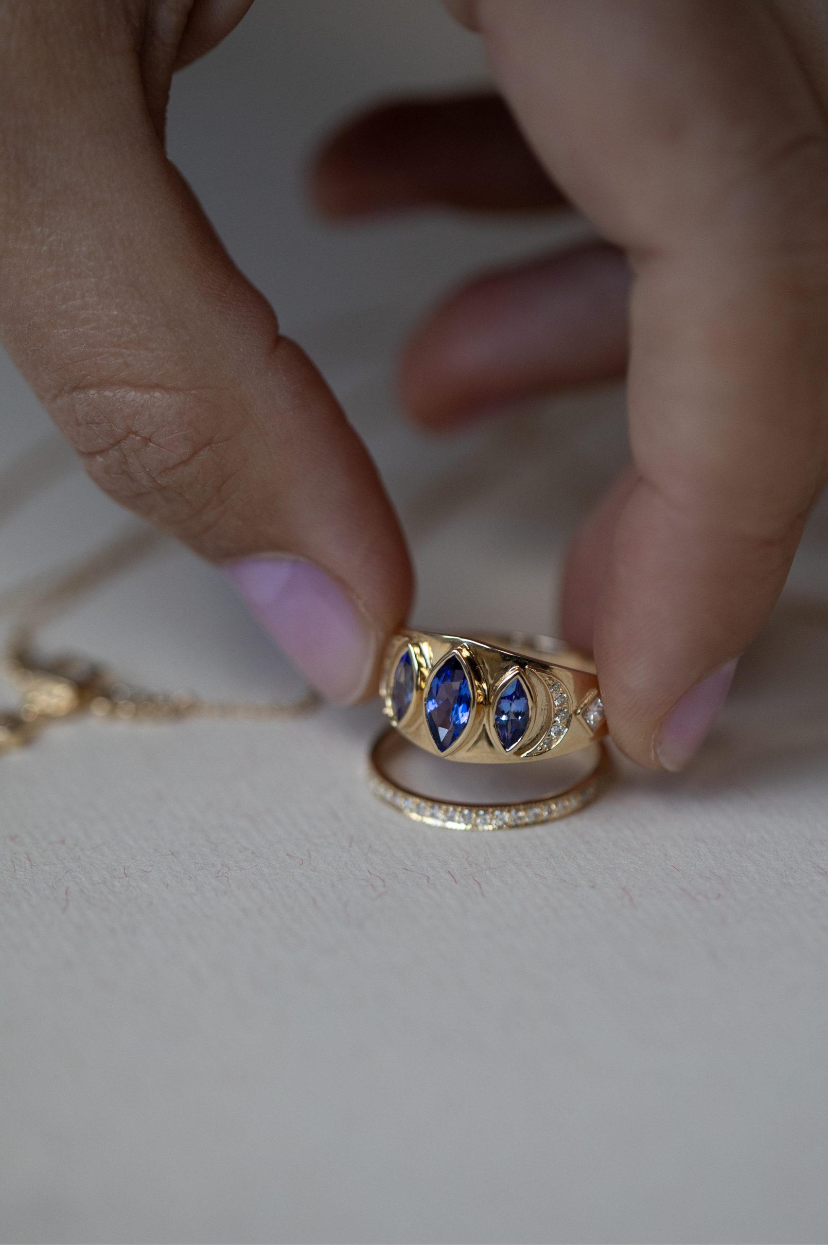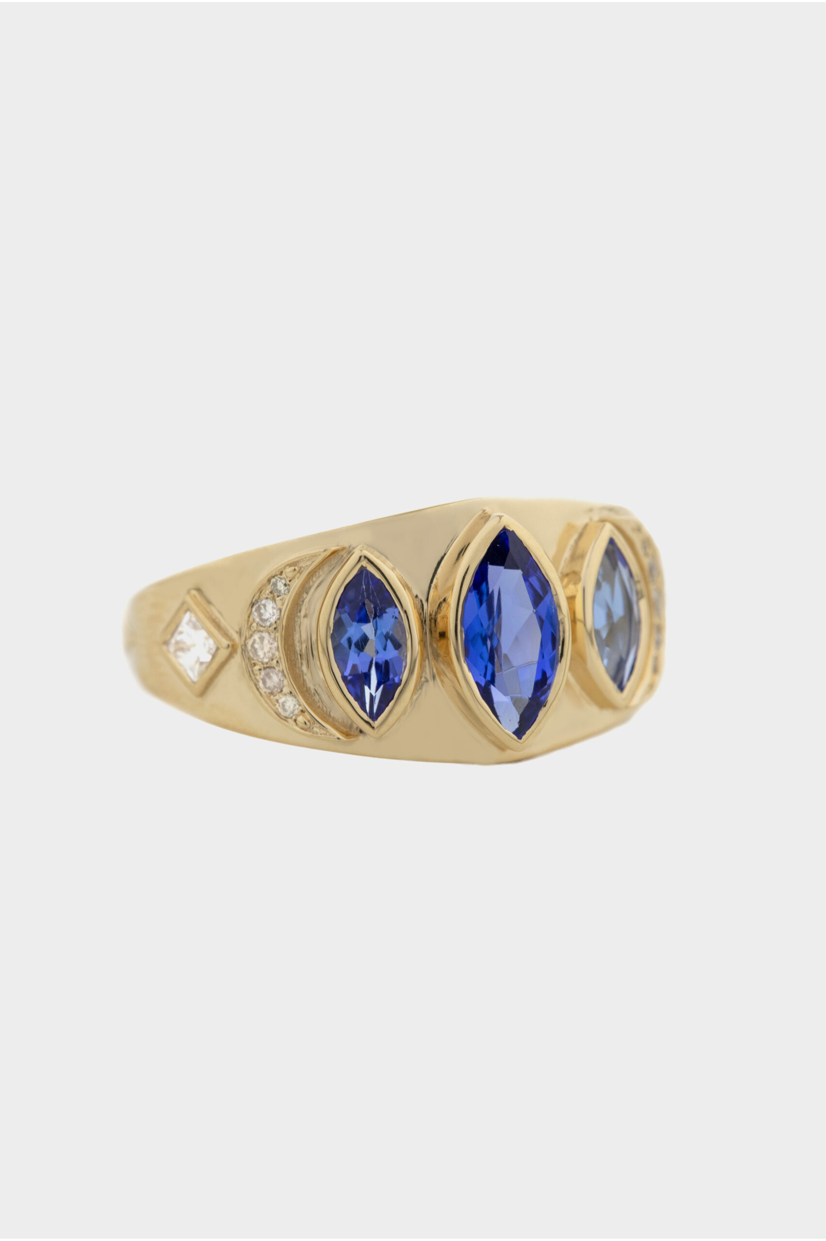 Celine daoust 14k light yellow gold triple marquise tanzanite ring with moon crescent and square diamonds.