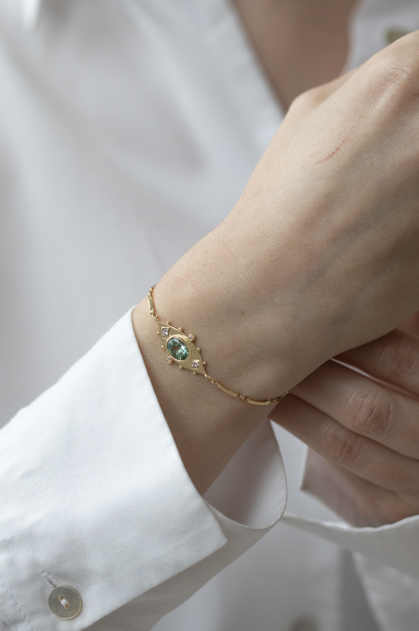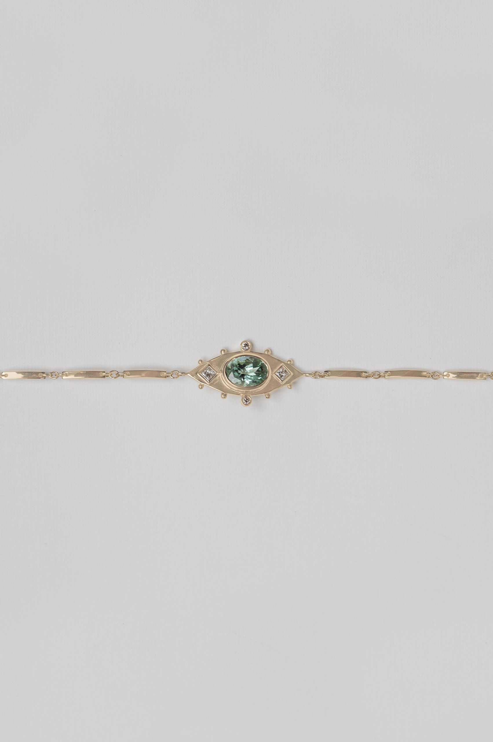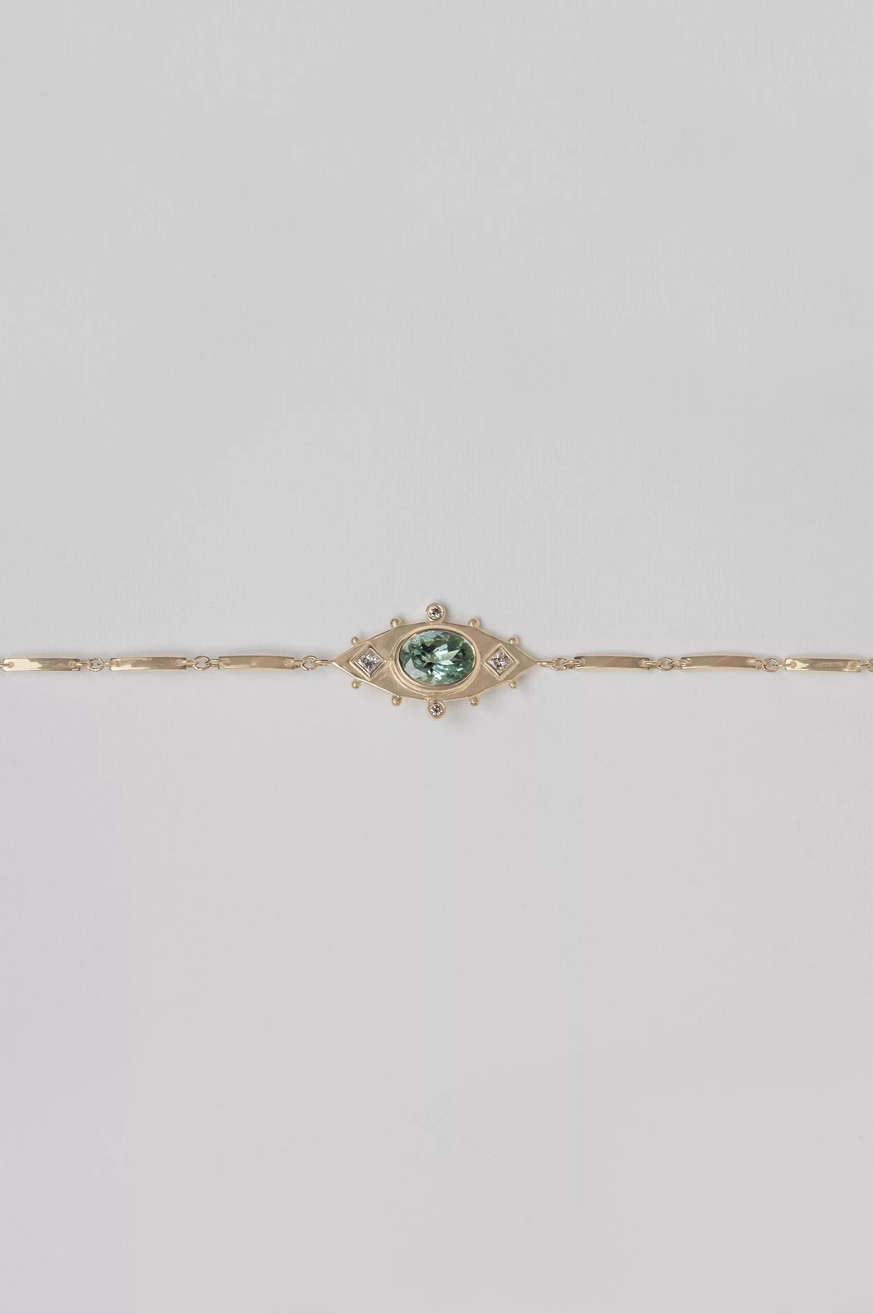 Celine Daoust 14k light yellow gold articulated bracelet with one gold plate set with one light green oval tourmaline eye, square diamonds and diamonds.