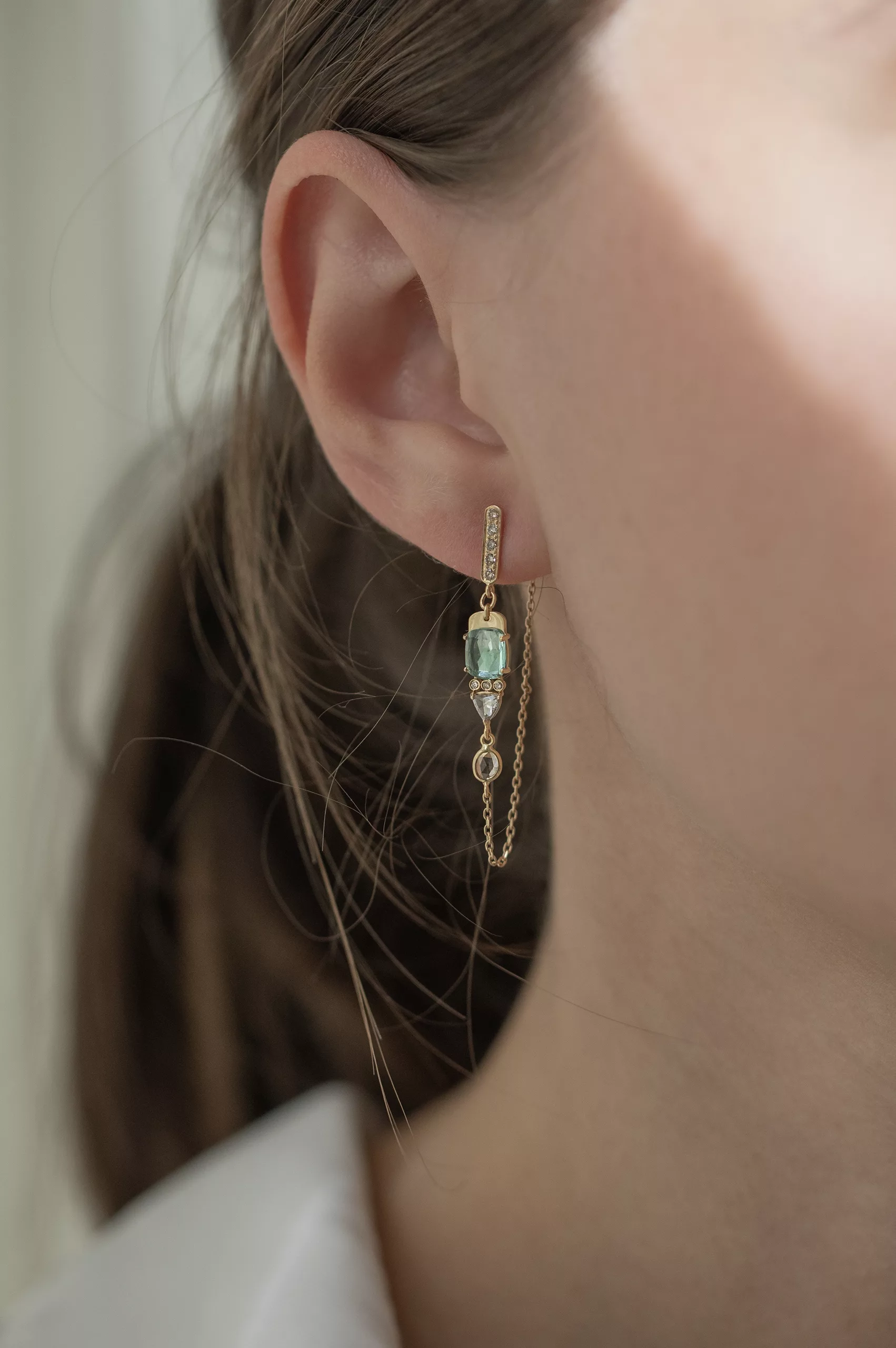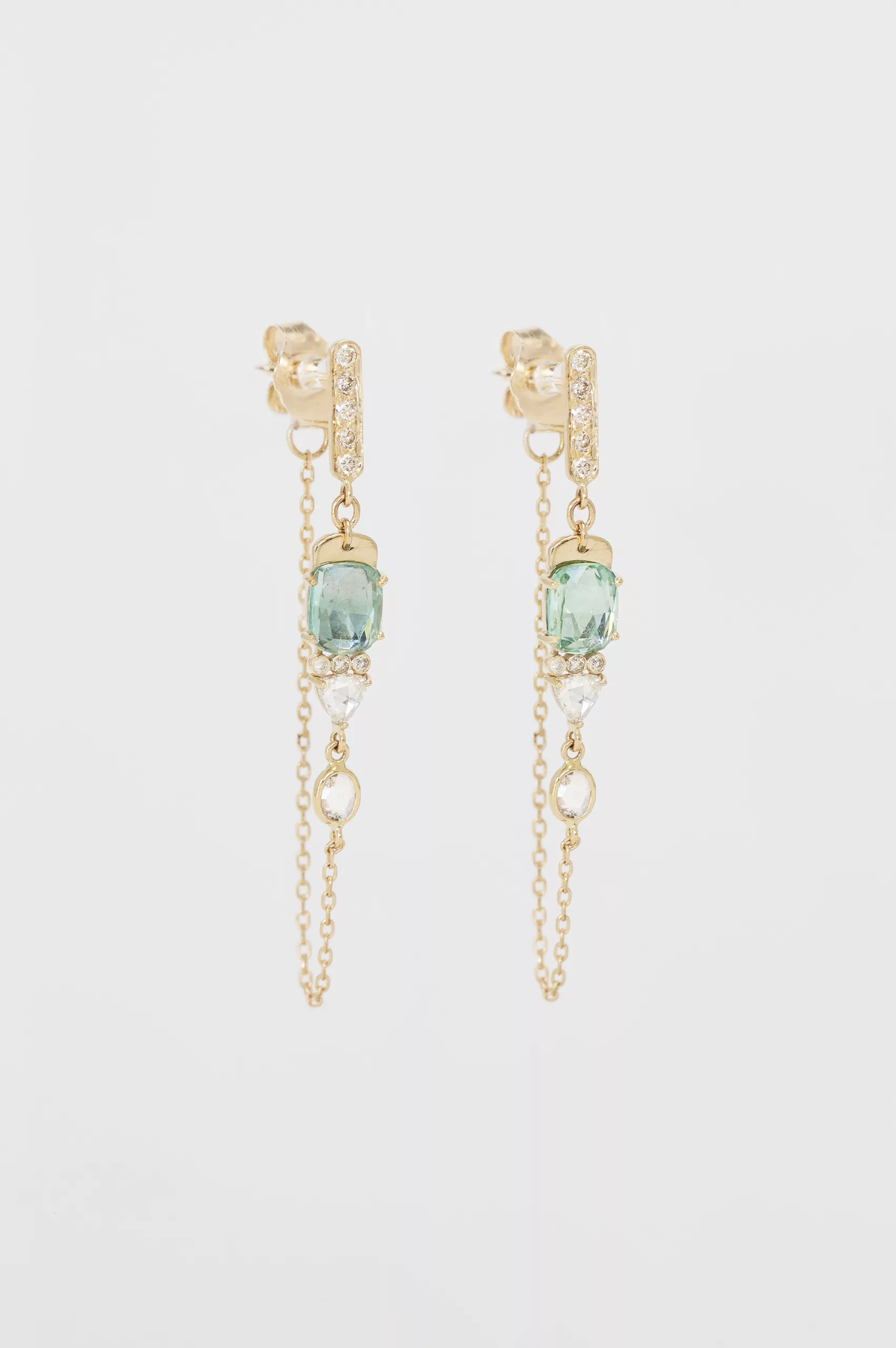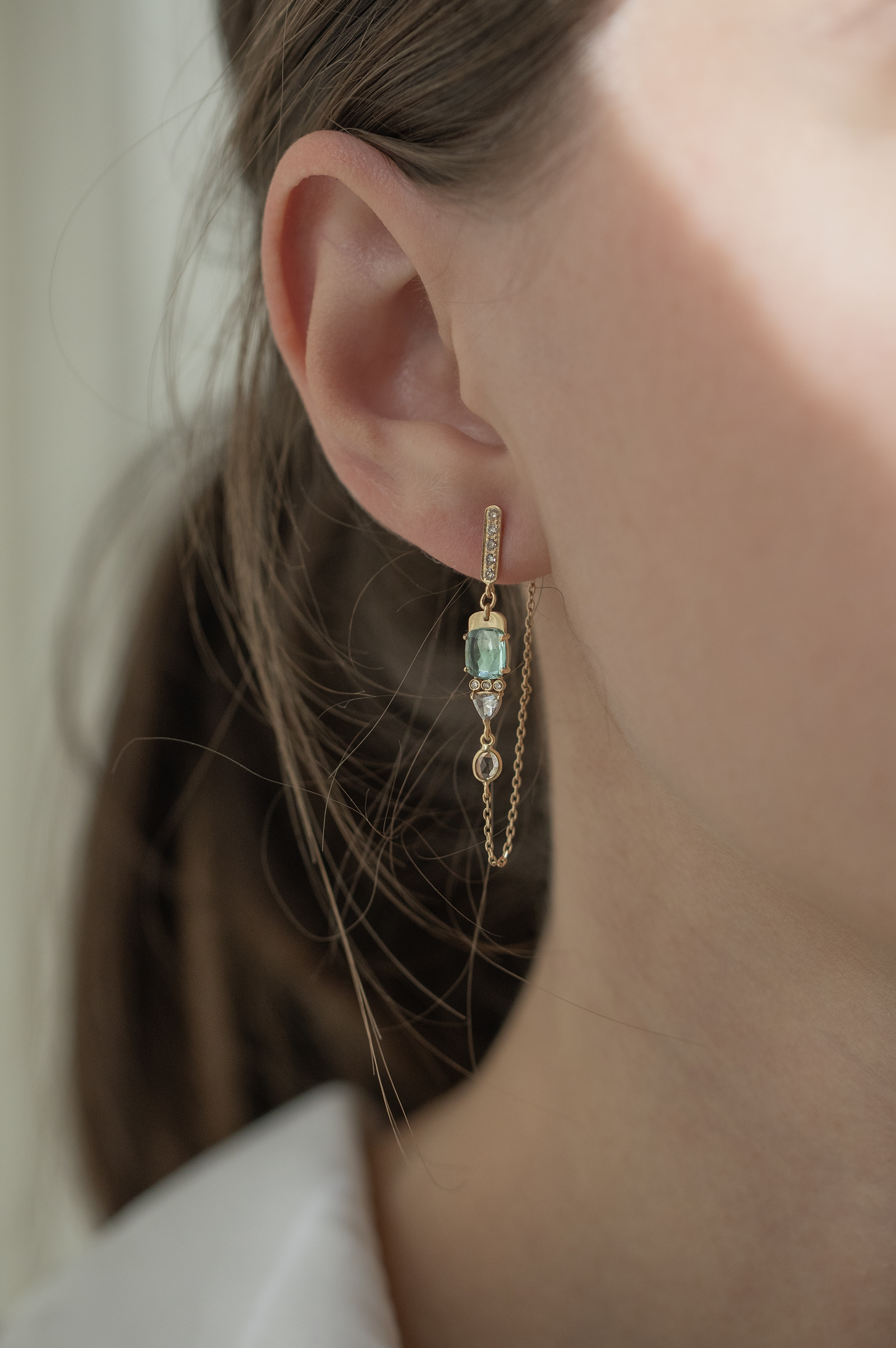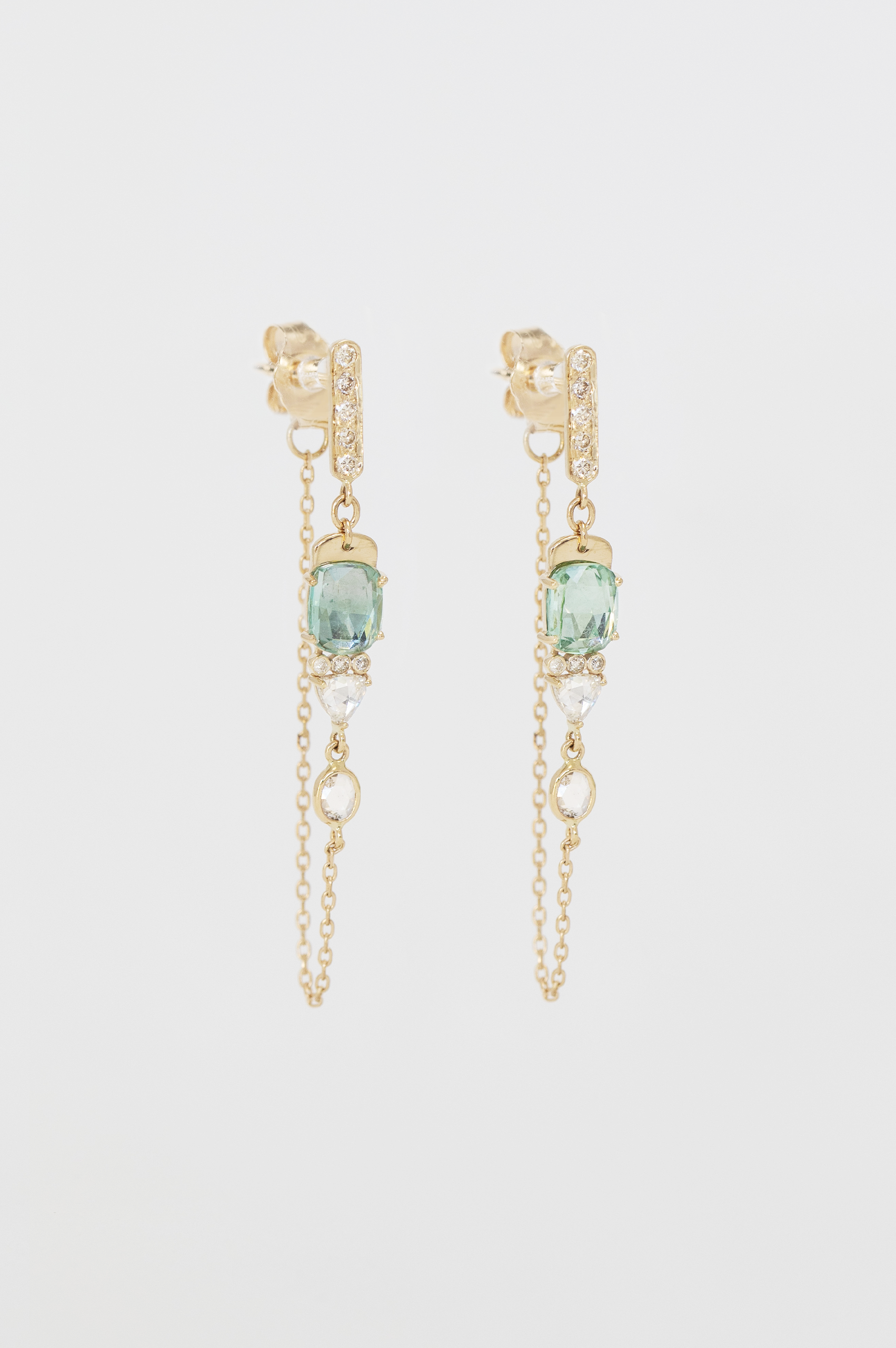 Celine Daoust 14k light yellow gold long earrings with turquoise tourmaline and diamonds. The stones come in a gradient of light blue and green.