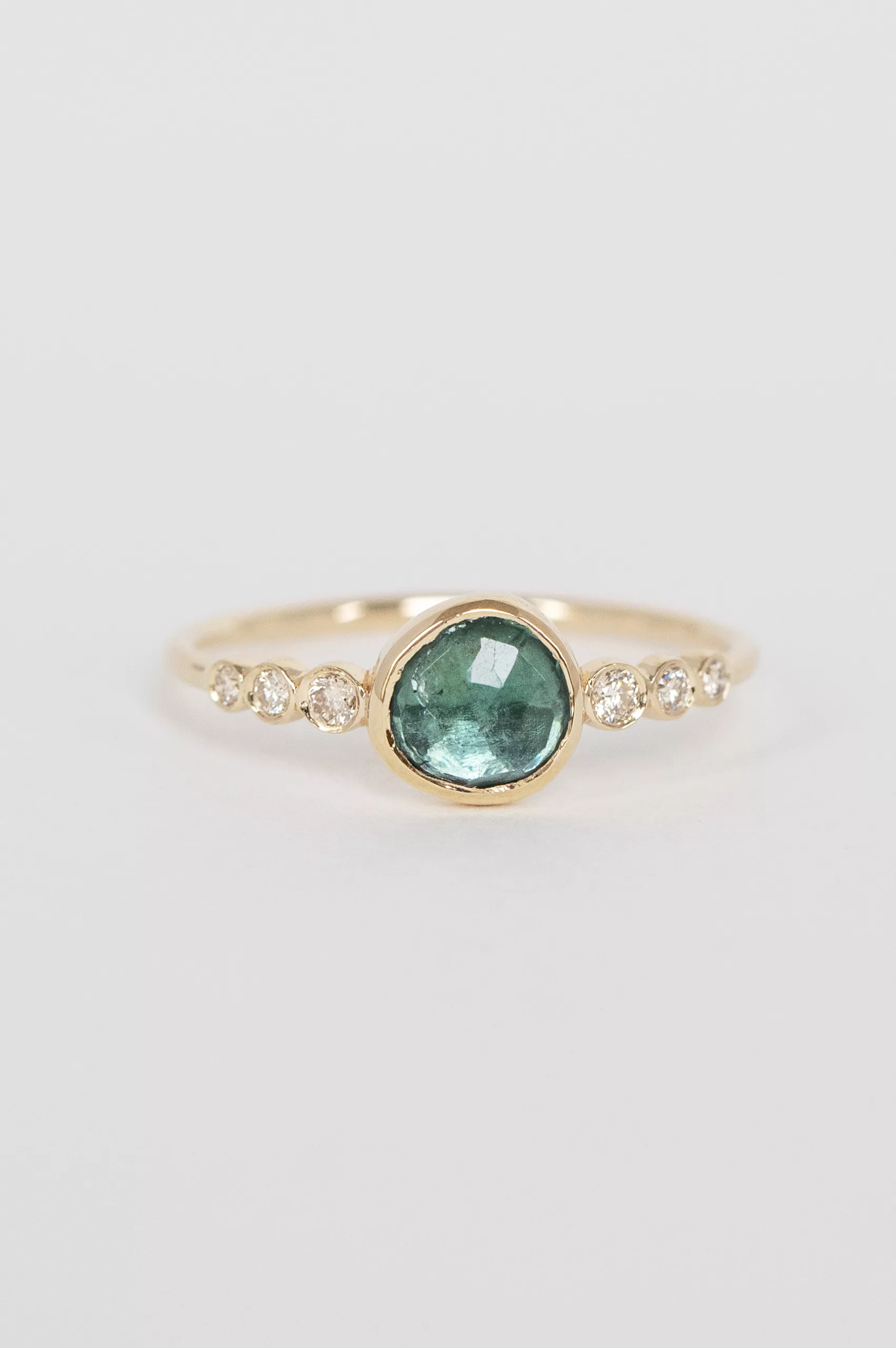 Celine Daoust 14k light yellow gold with one central turquoise tourmaline and six diamonds. The stone comes in a gradient of blue and turquoise.