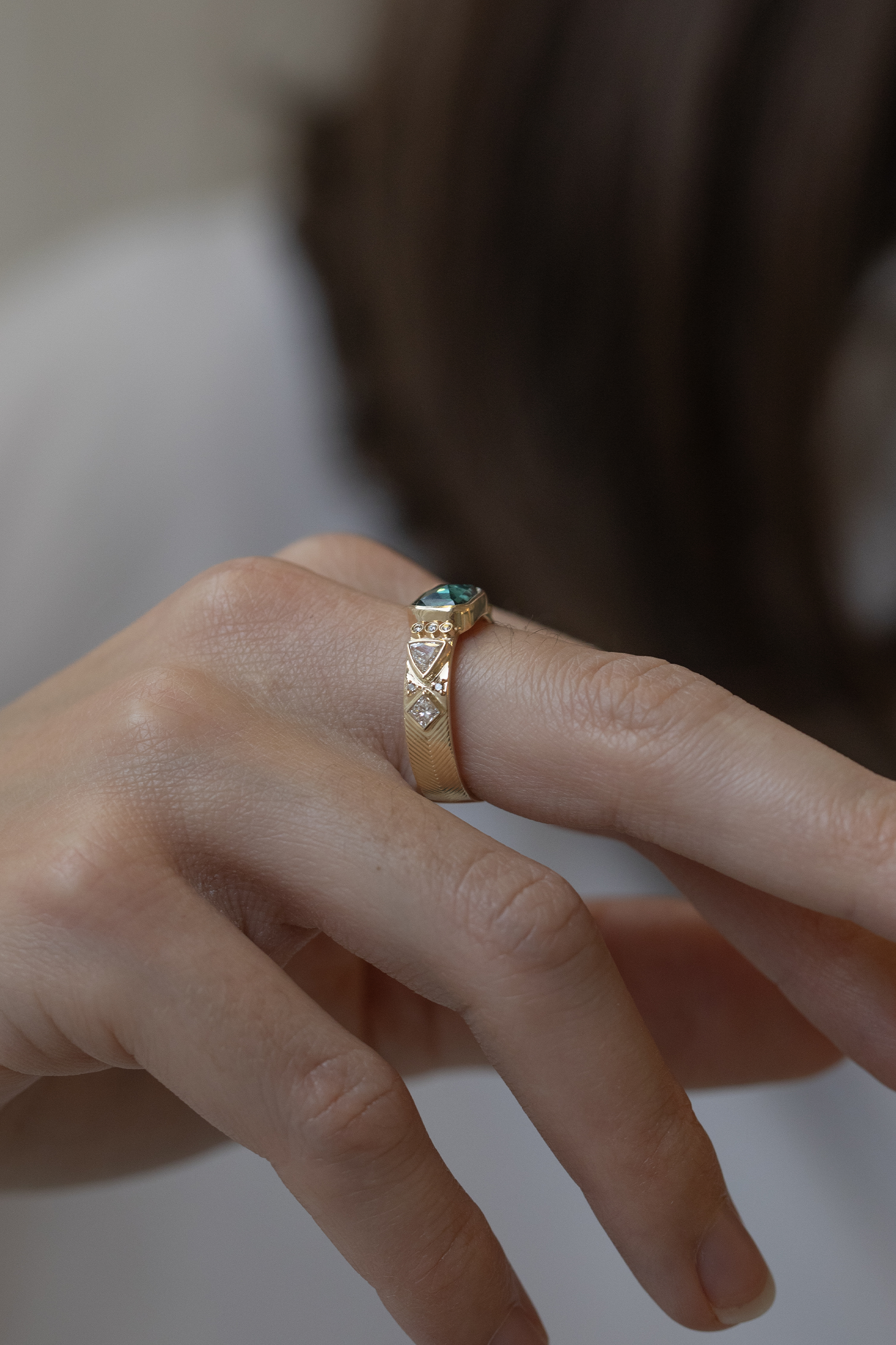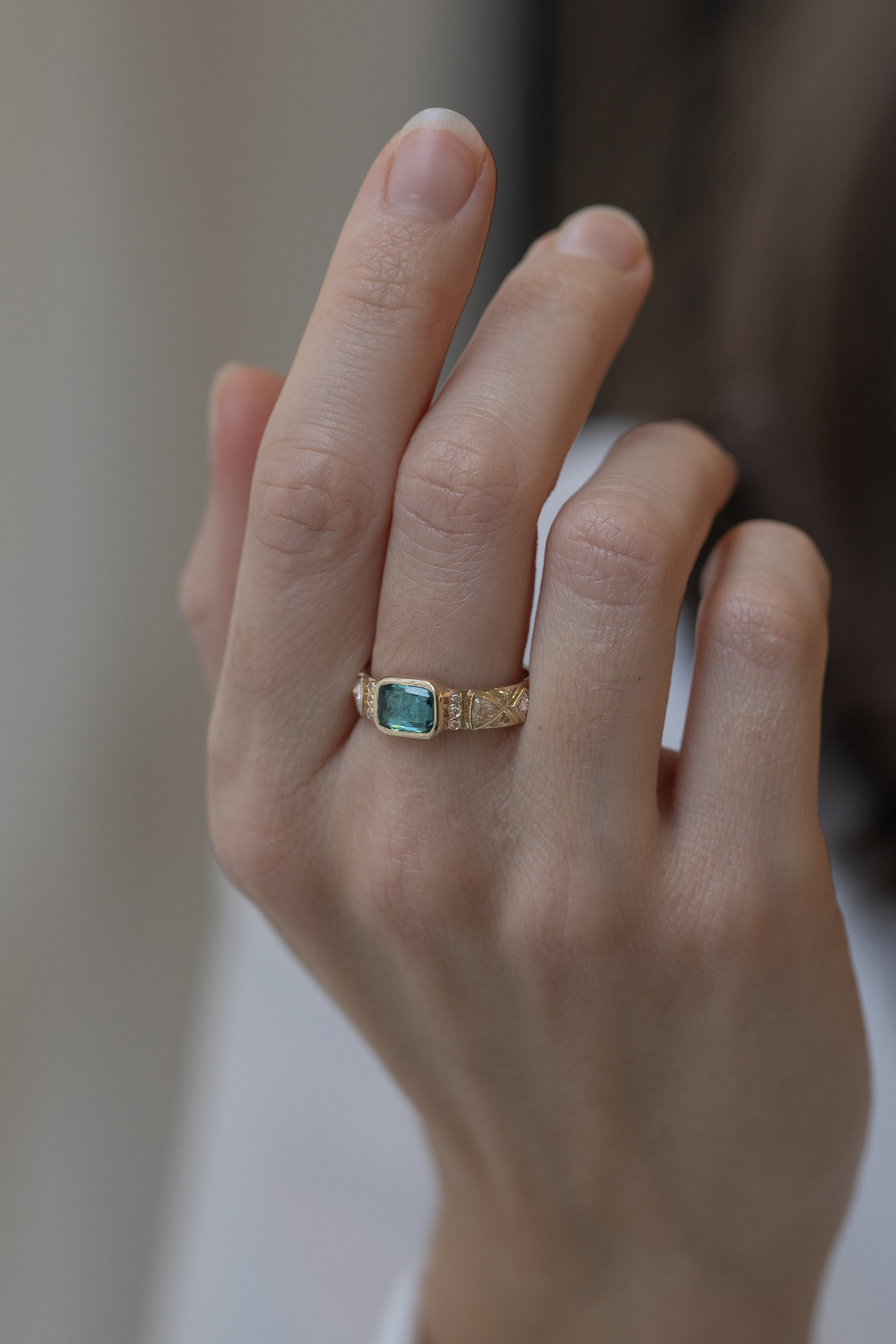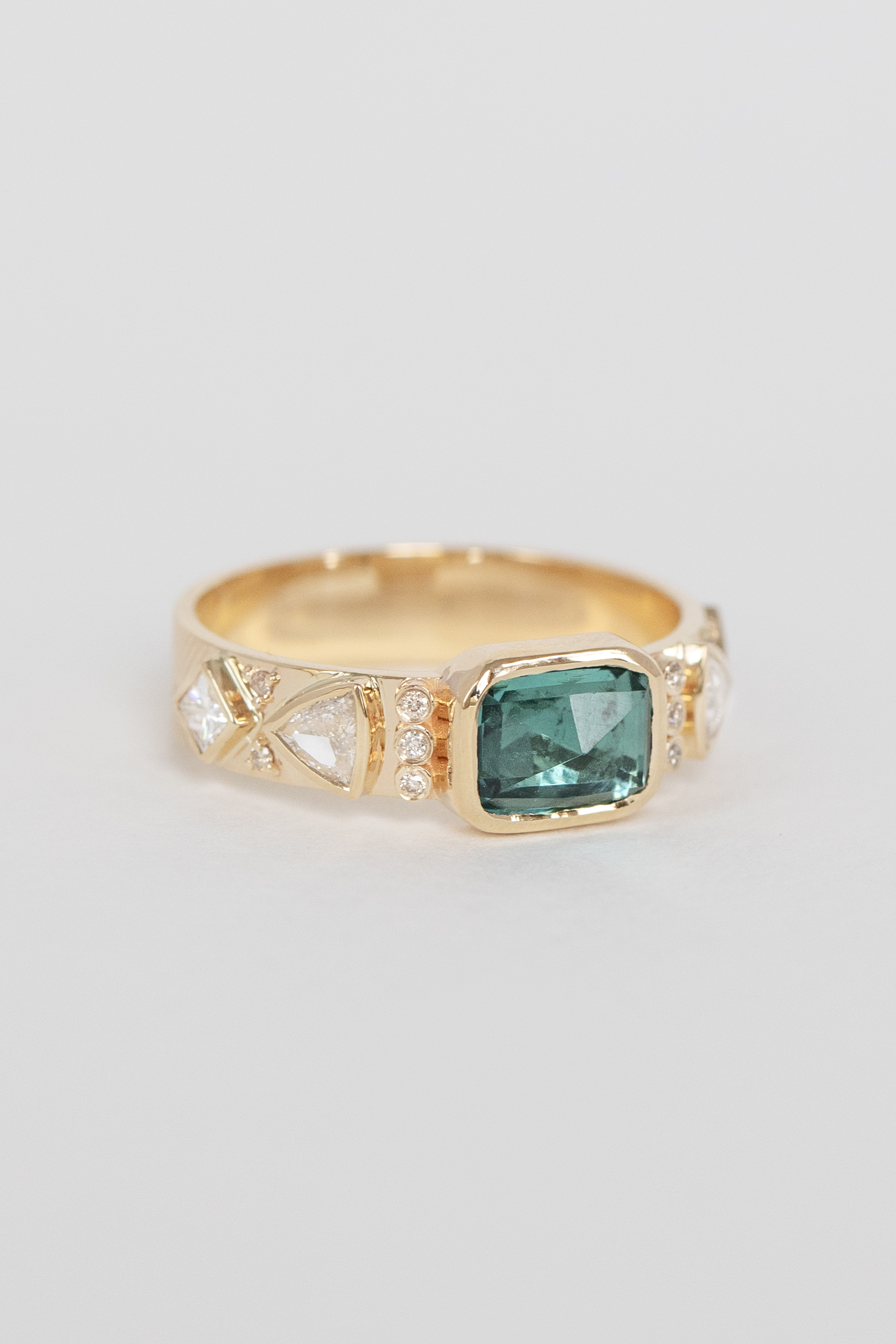 Celine Daoust 14k light yellow gold ring with one turquoise tourmaline surrounded with diamonds details. The stone color is gradient of turquoise and dark blue.
