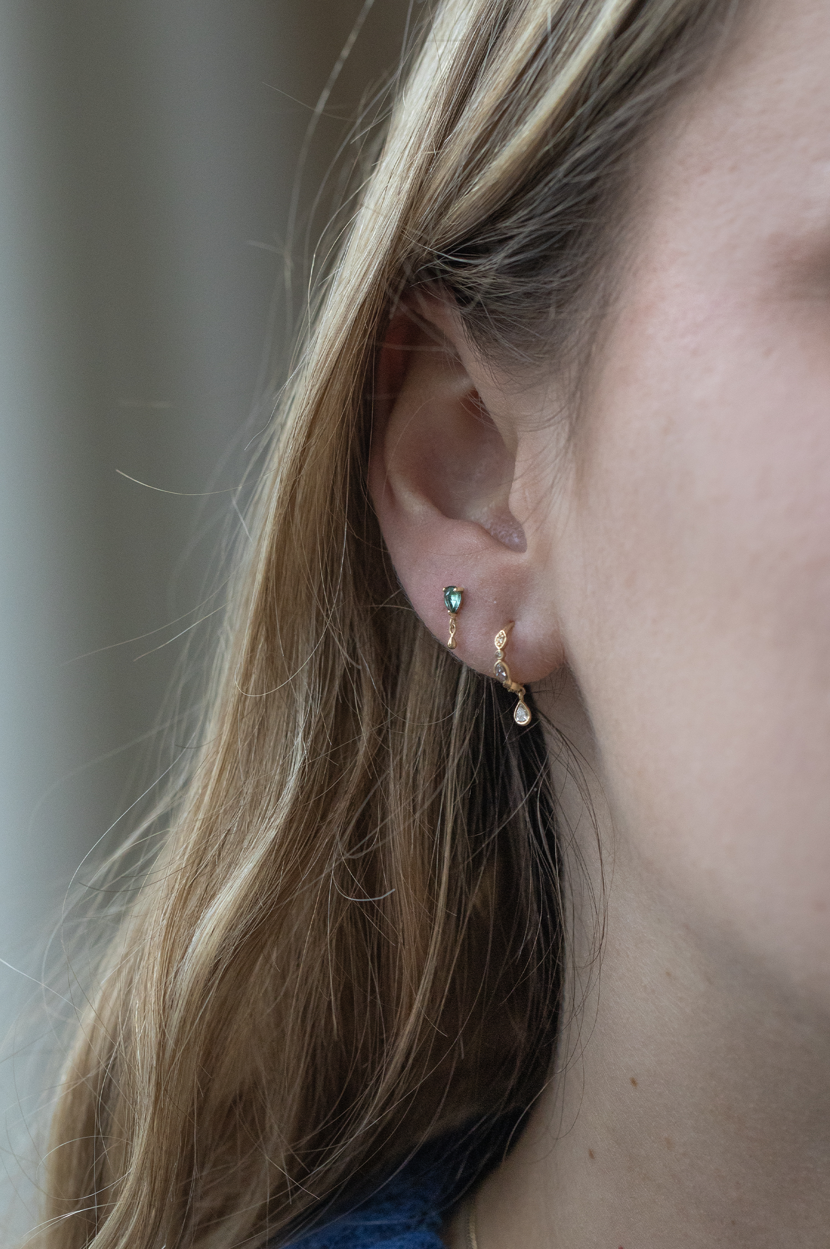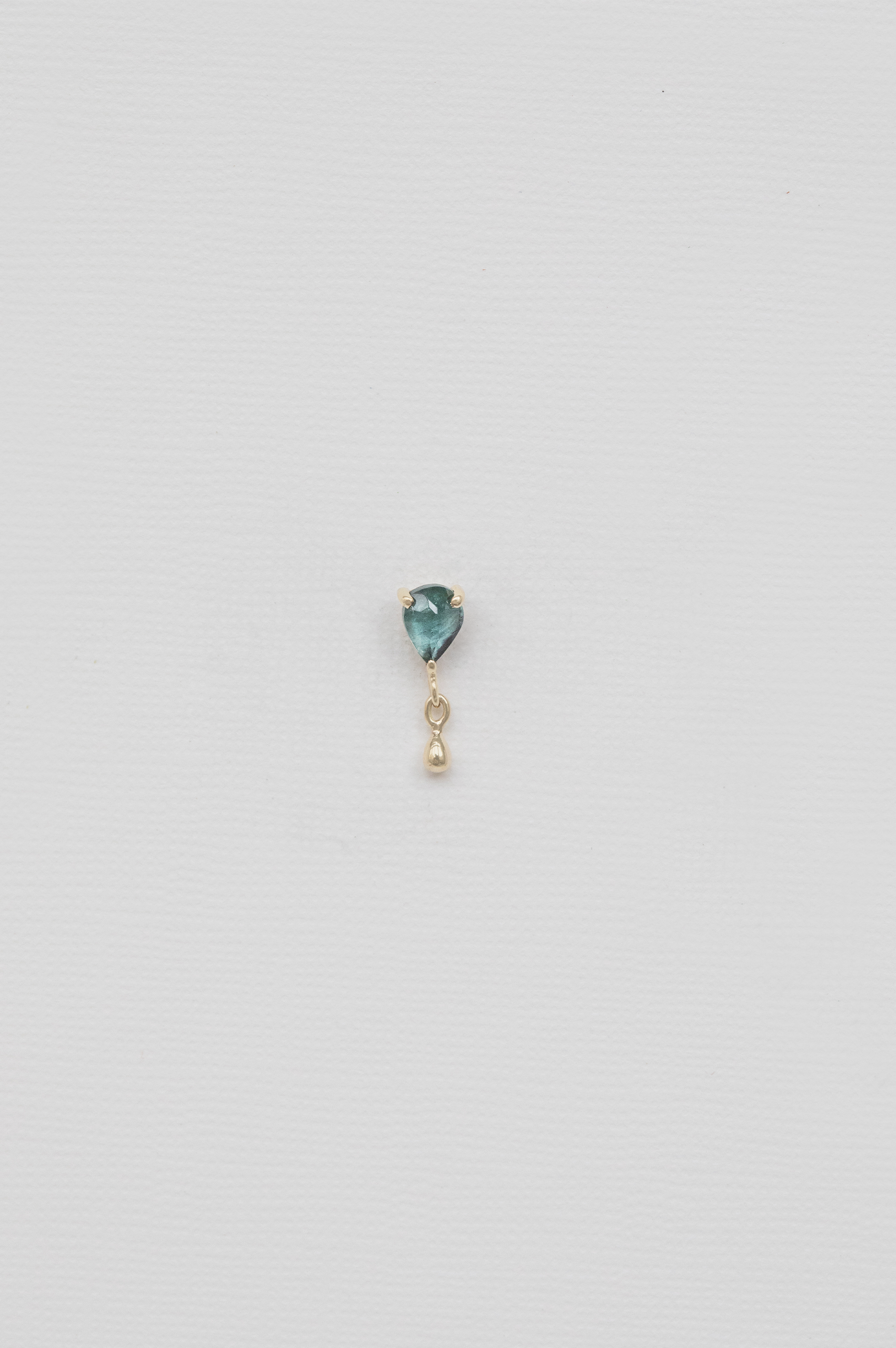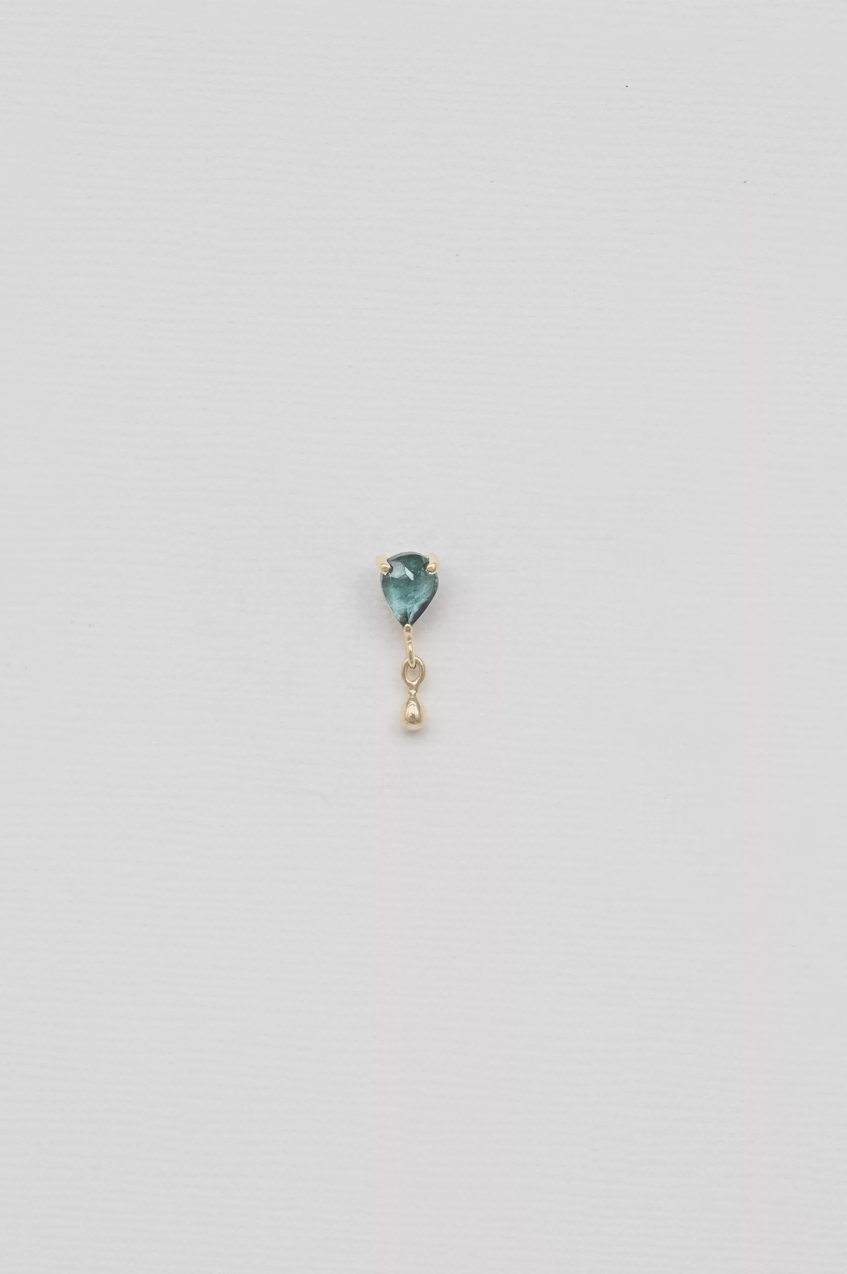Céline Daoust 14k light yellow gold pear and dangling piercing with a one of a kind turquoise tourmaline stone. The stone comes in a gradient of dark turquoise.