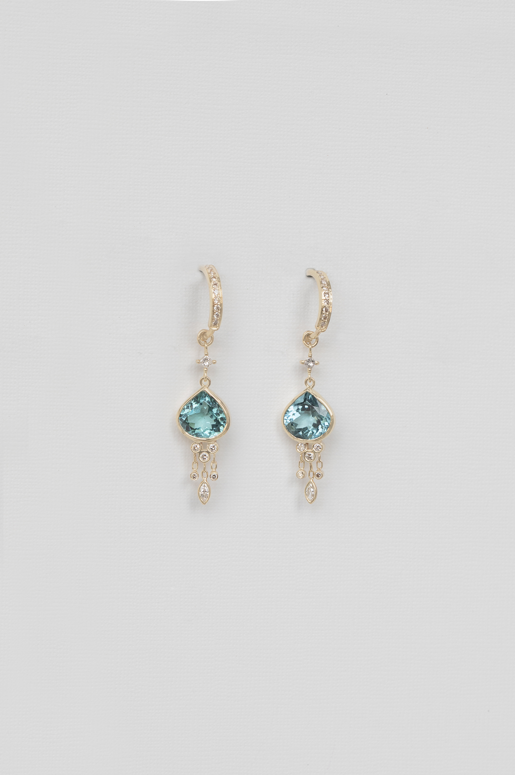 Celine Daoust 14k light yellow gold turquoise tourmaline pear & dangling diamonds earrings. The stones are a gradient of blue and green.