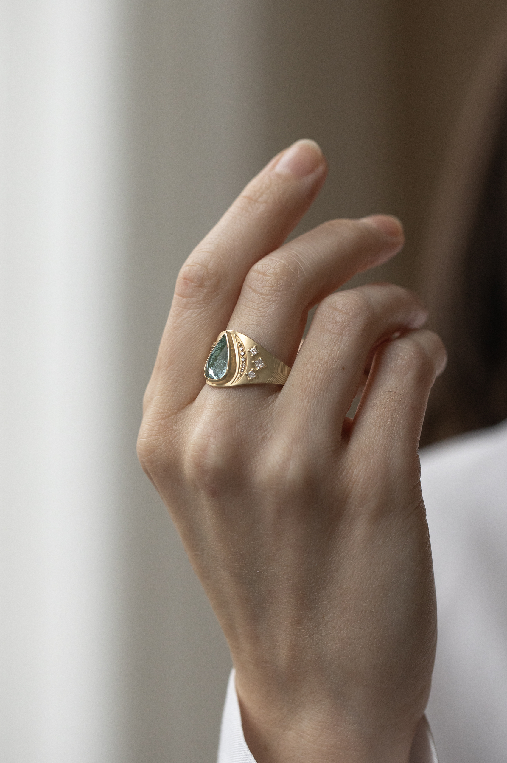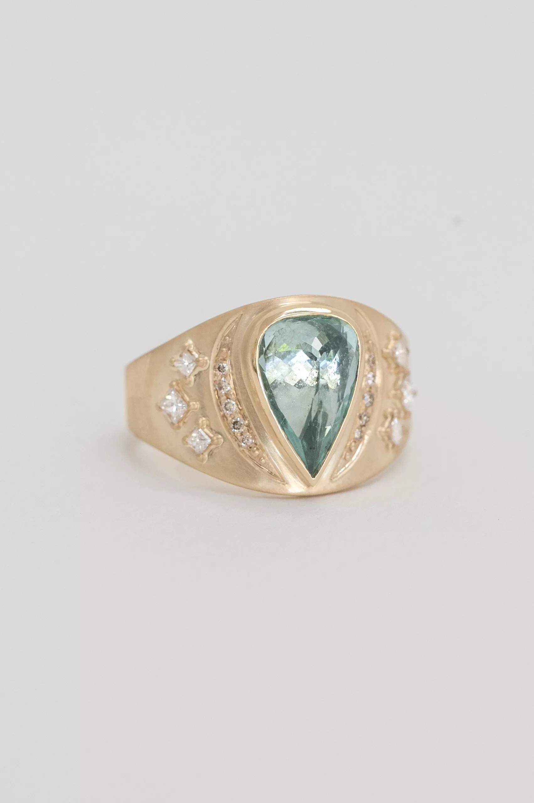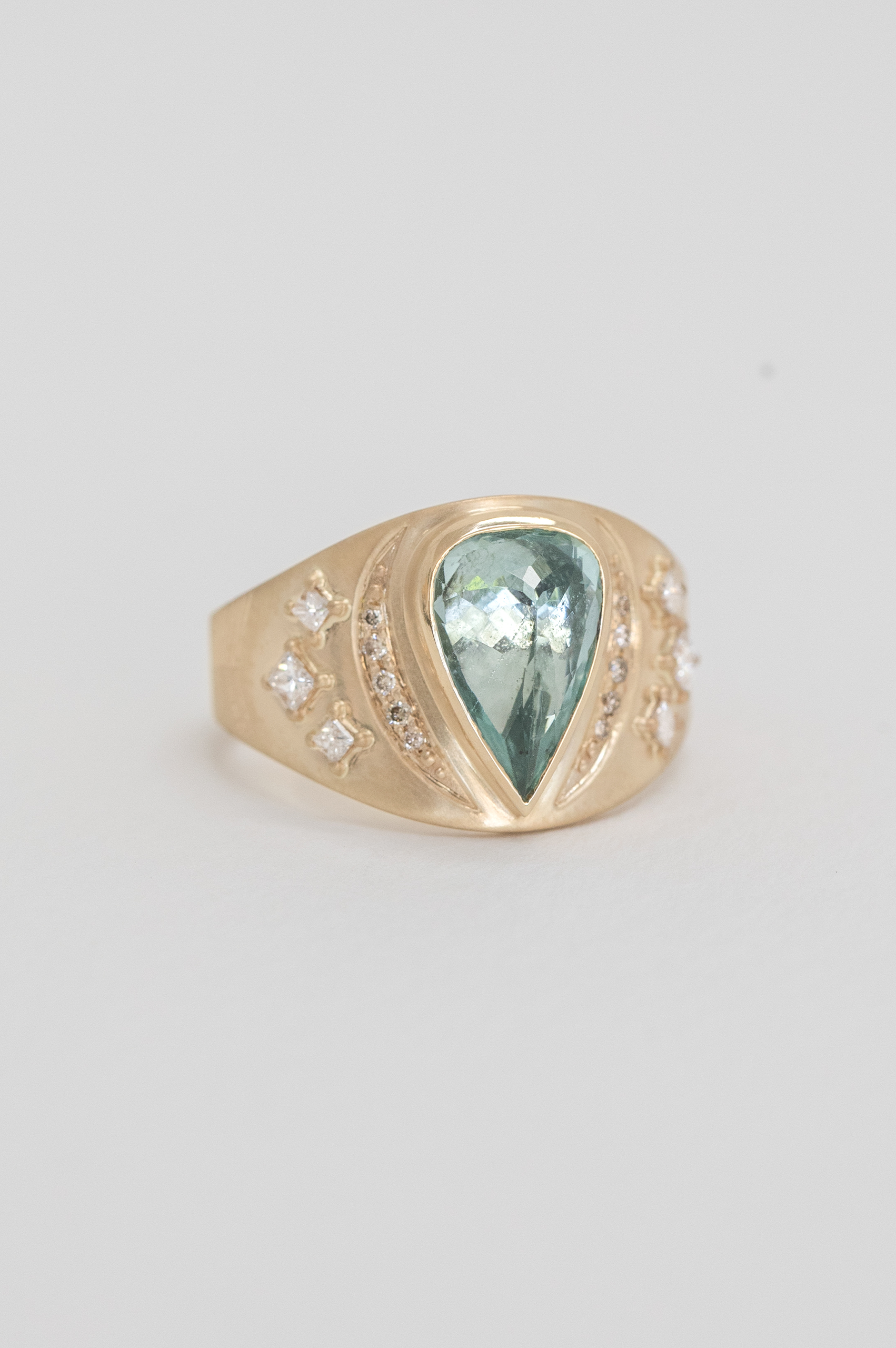 Céline Daoust 14k light yellow gold ring with a pear turquoise tourmaline, moon details and square diamonds. The stone comes in a gradient of light blue ad green.