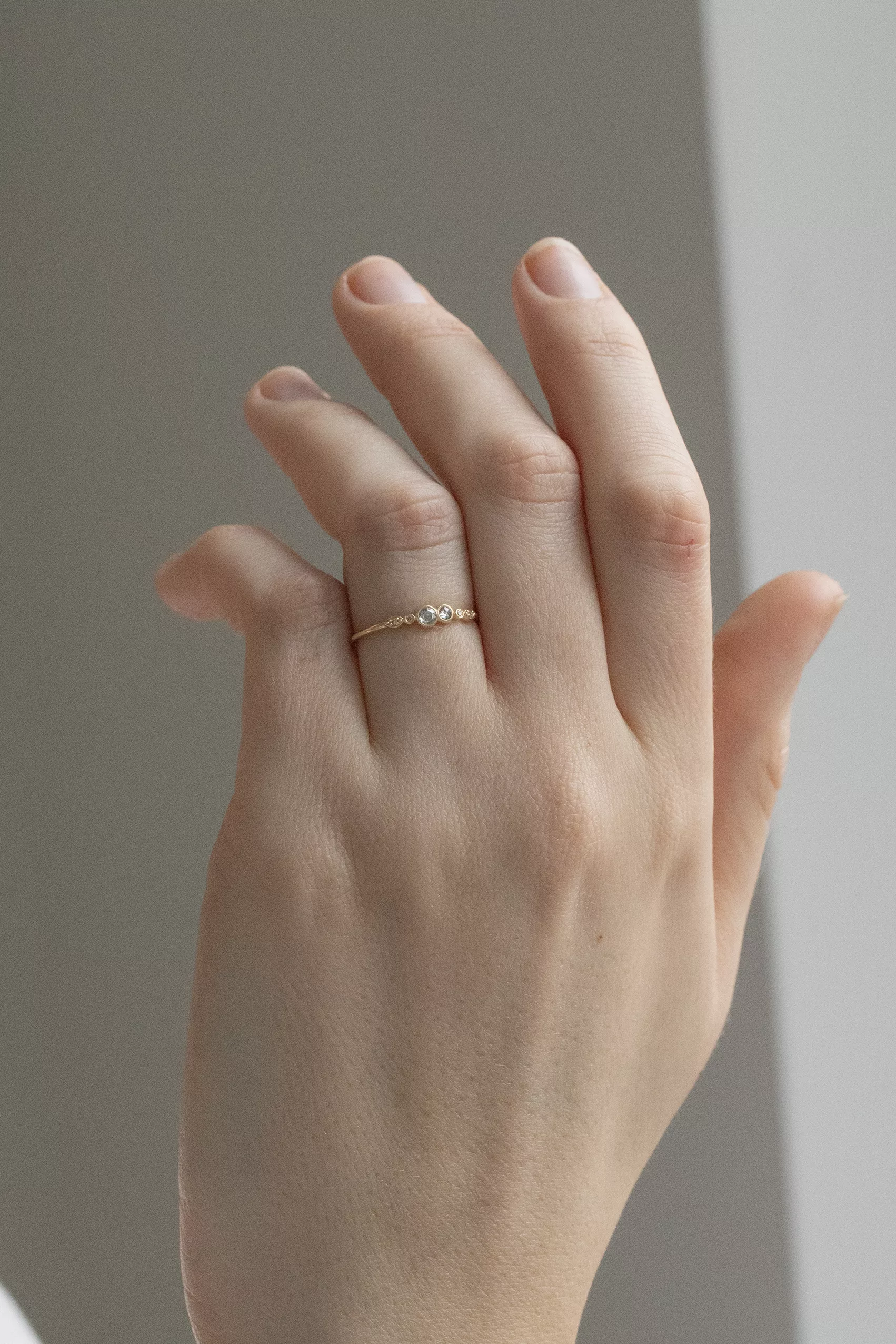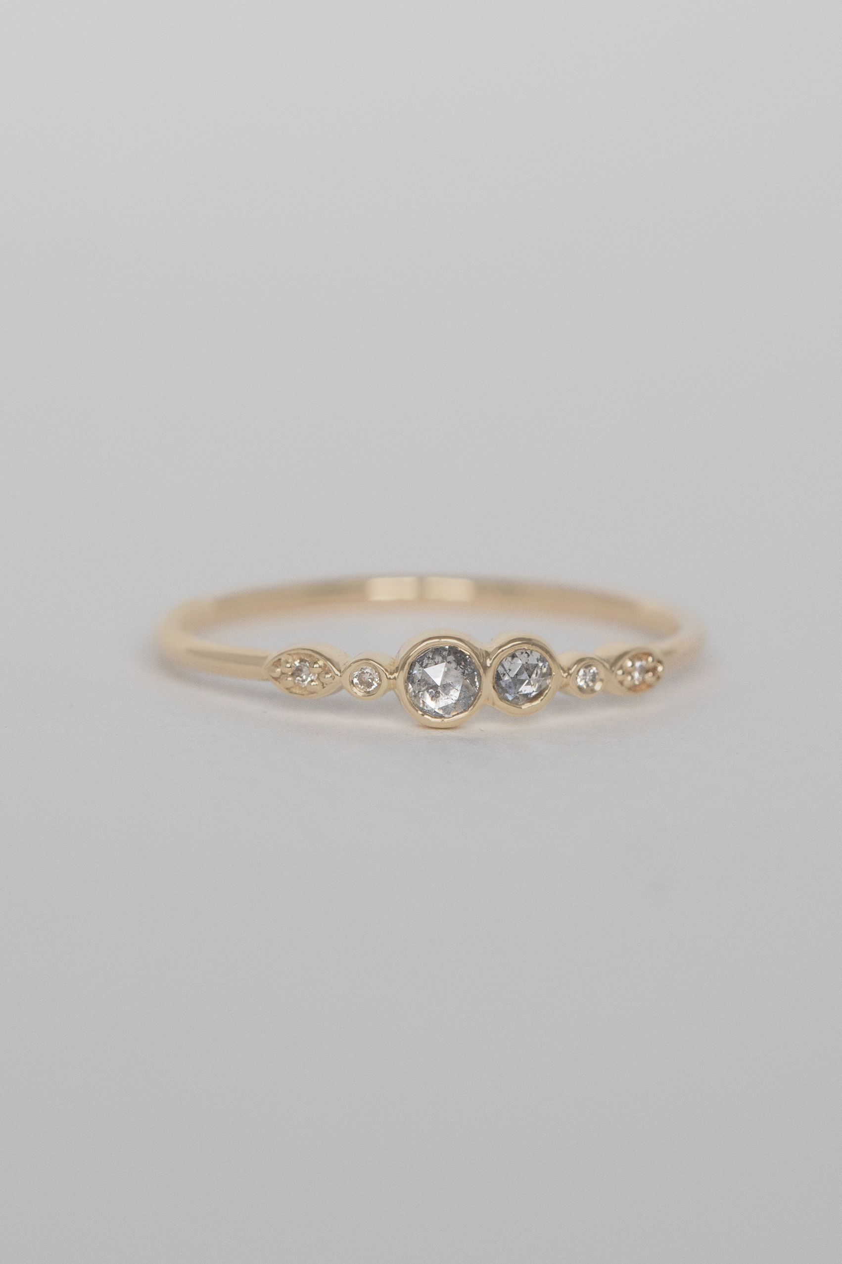 Celine Daoust 14k light yellow gold ring with two grey diamonds and eye diamonds ring. The stones come in a gradient of light and dark grey.