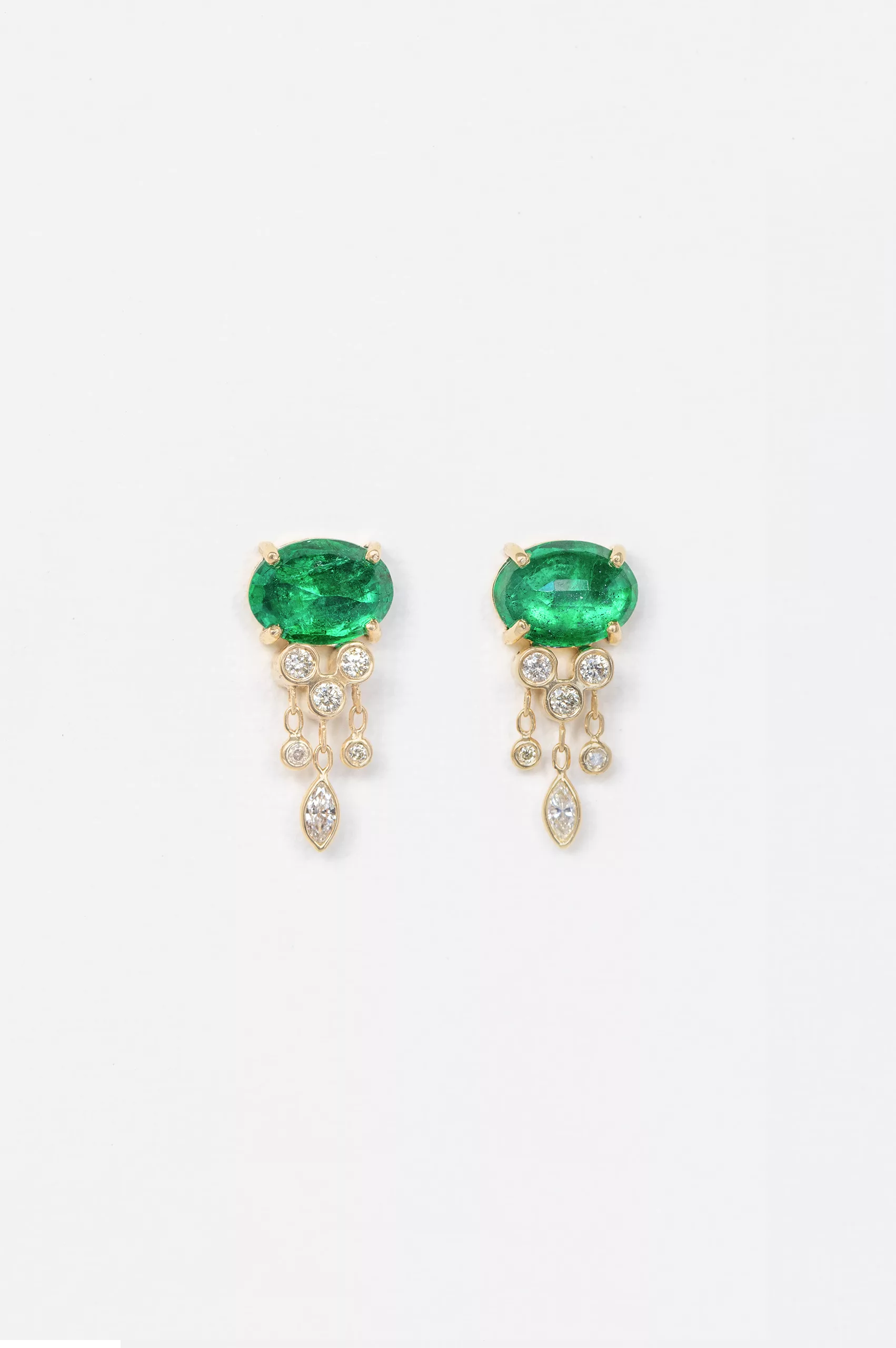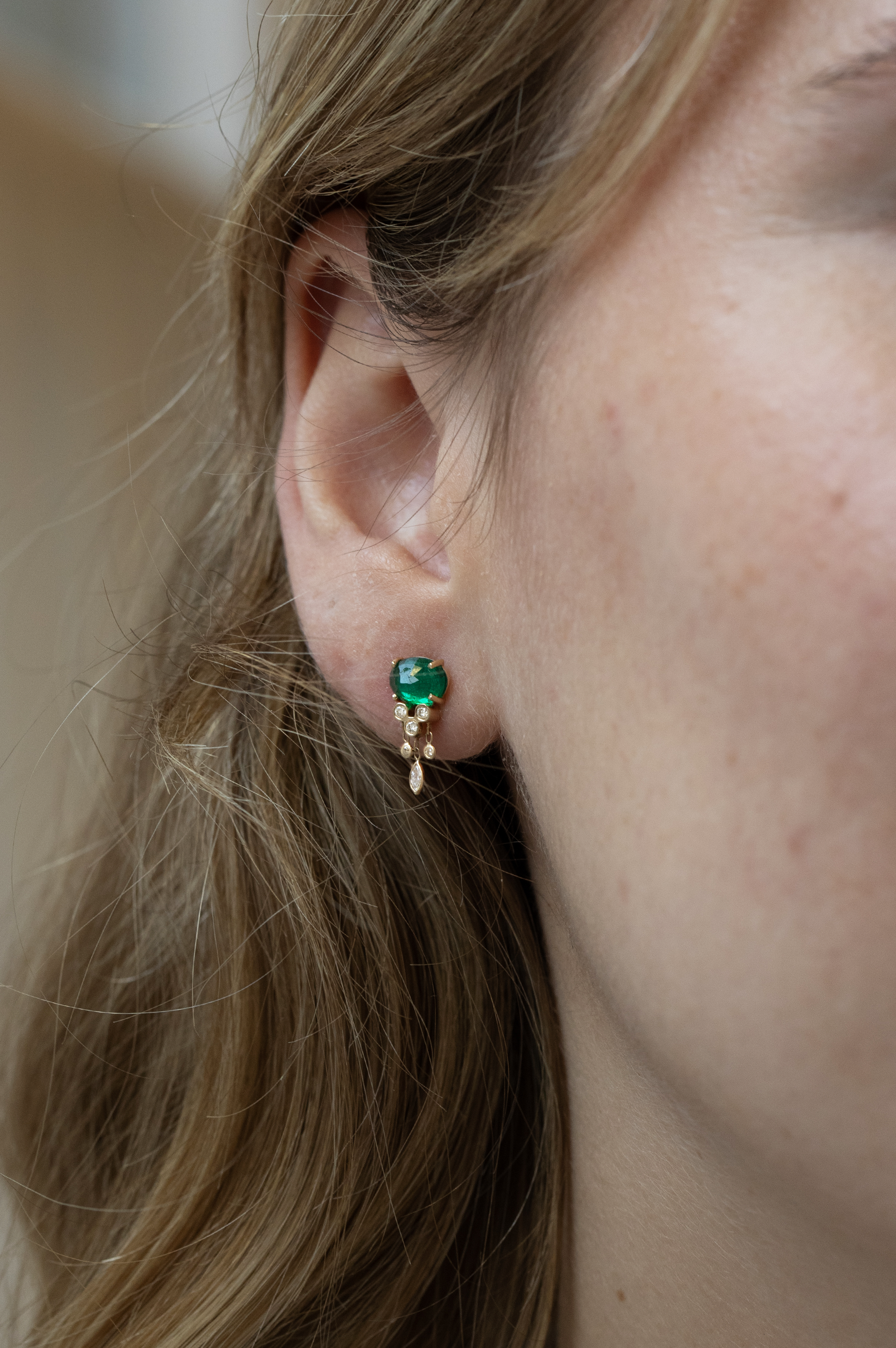 Céline Daoust 14k light yellow gold jellyfish earrings with one light green emerald & dangling diamonds. The stone comes in gradients of vivid green.