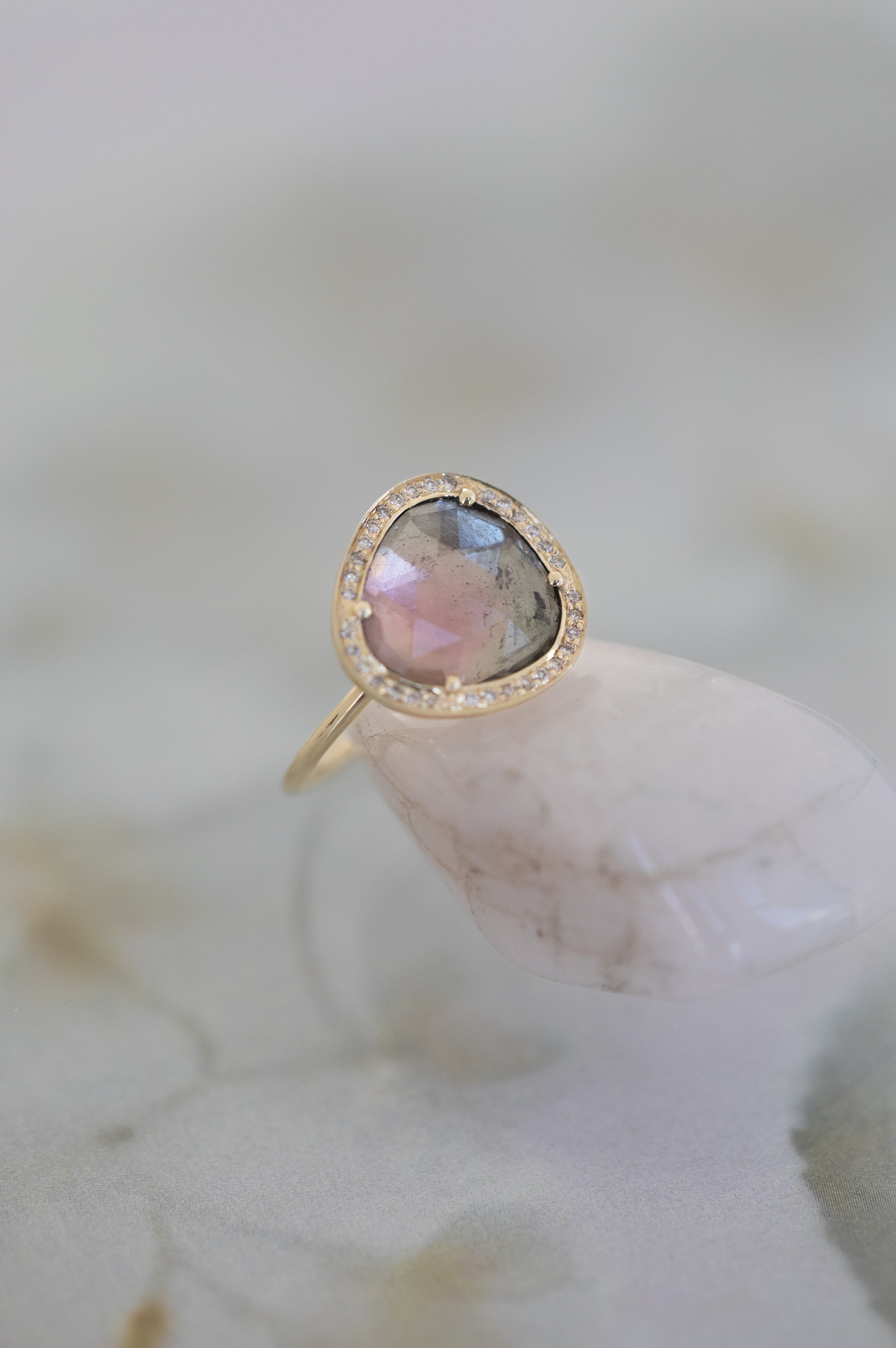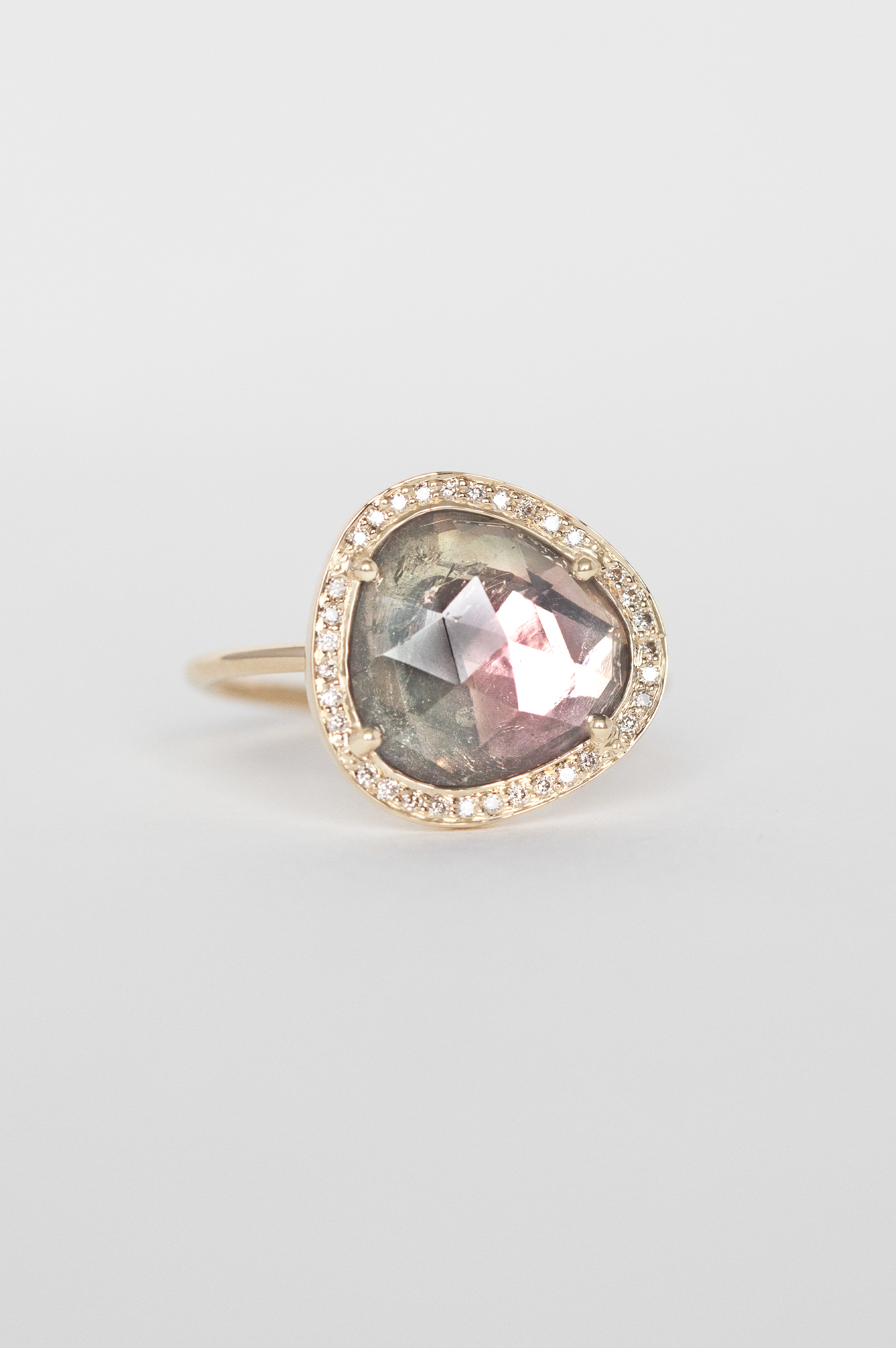 Celine Daoust 14k yellow gold ring with one watermelon tourmaline surrounded with diamonds. The stone is a gradient of light pink and green.