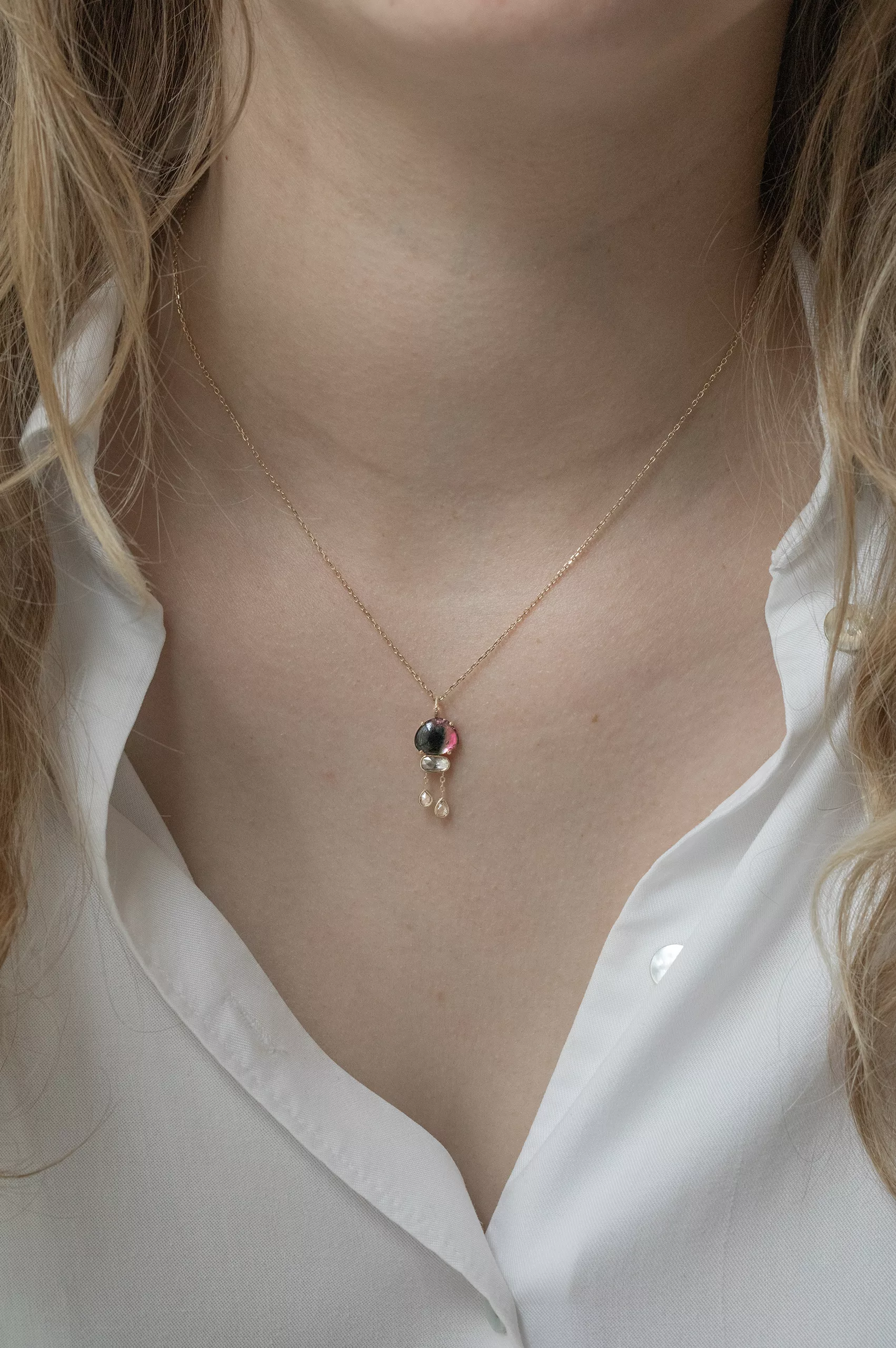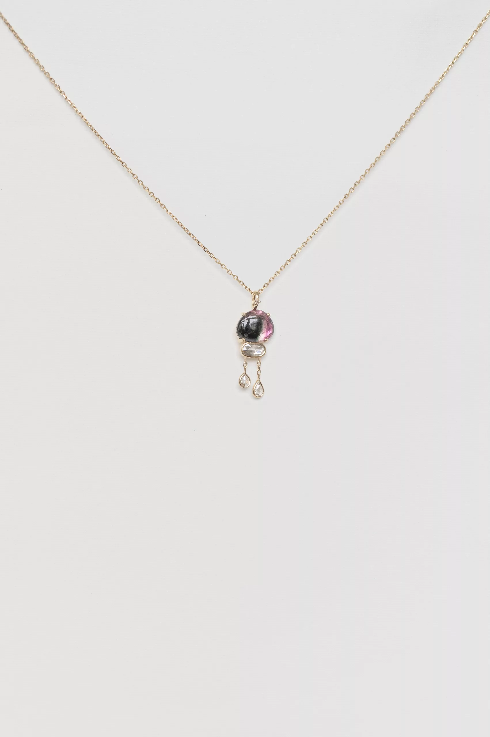 Céline Daoust 14k yellow gold watermelon tourmaline and dangling rose cut diamonds necklace. The stone comes in a gradient of pink with hue of yellow and green.