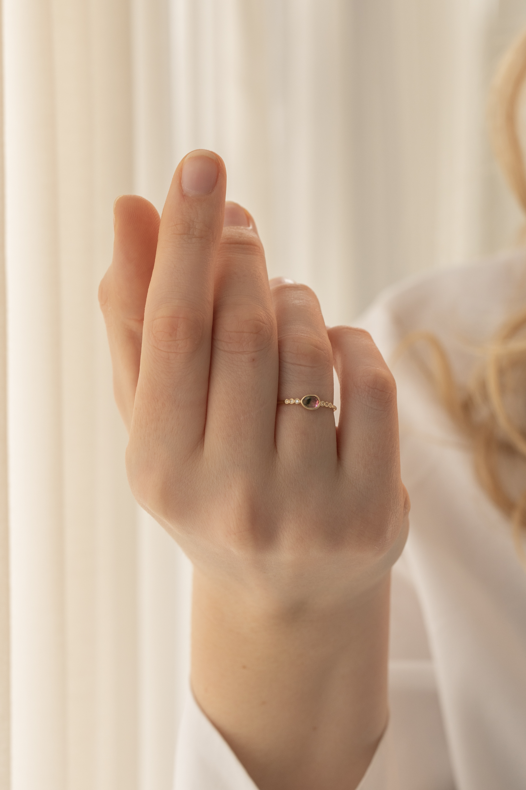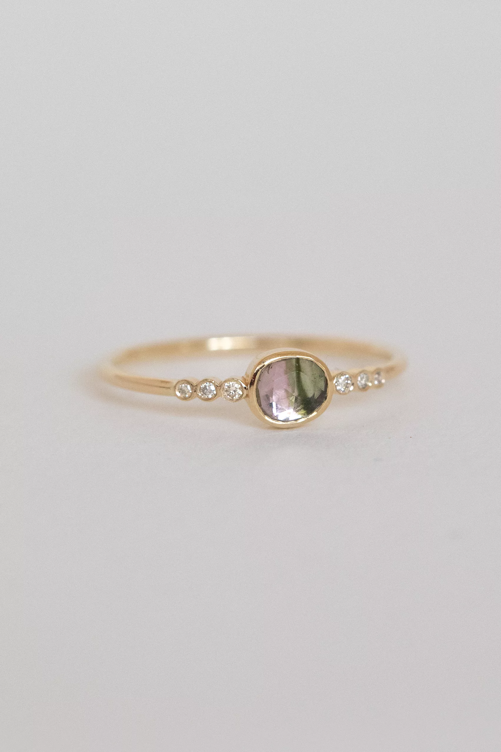 Céline Daoust 14k light yellow gold ring with one central watermelon tourmaline and six diamonds. The stone comes in a gradient of green and pink.
