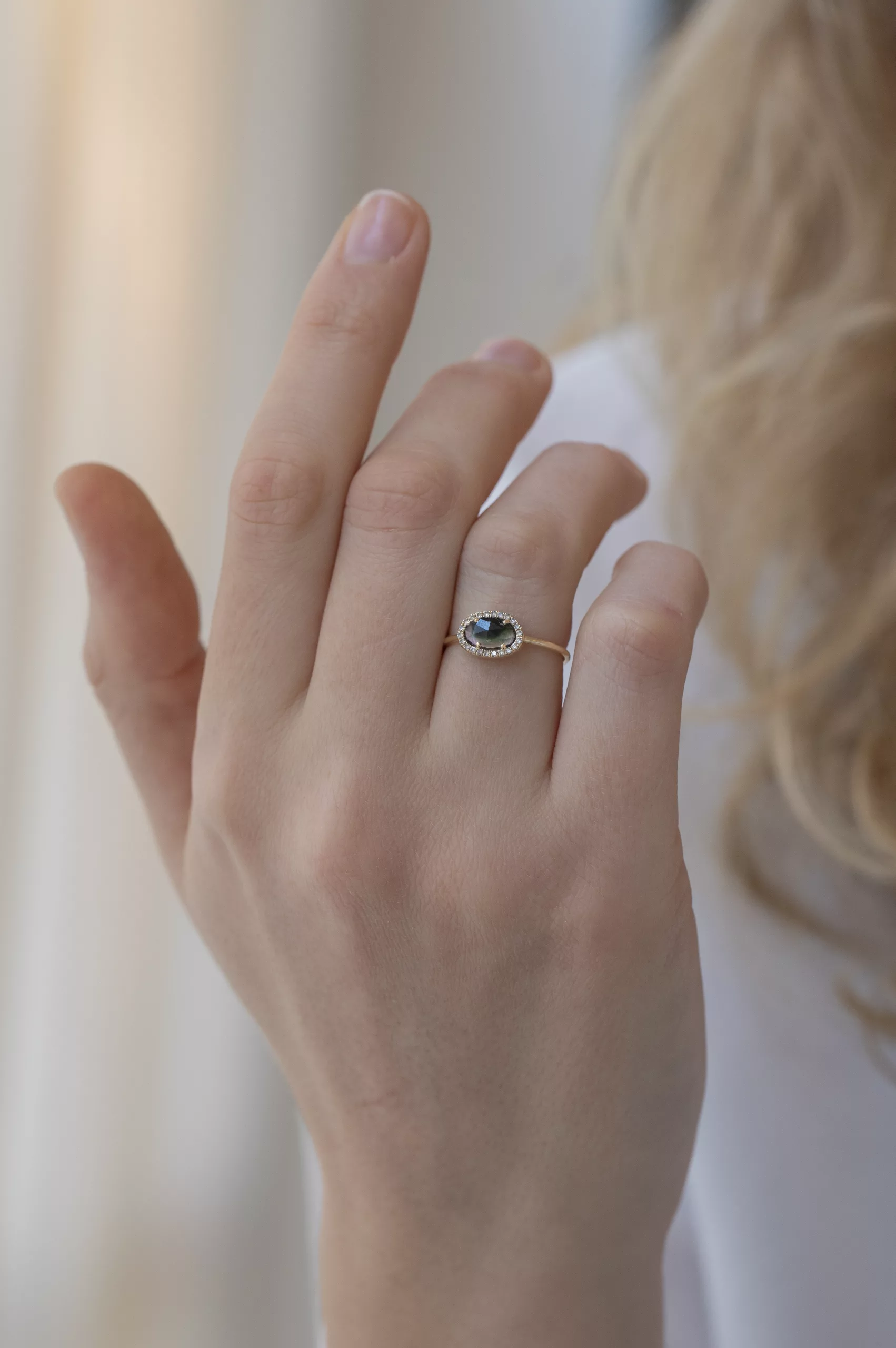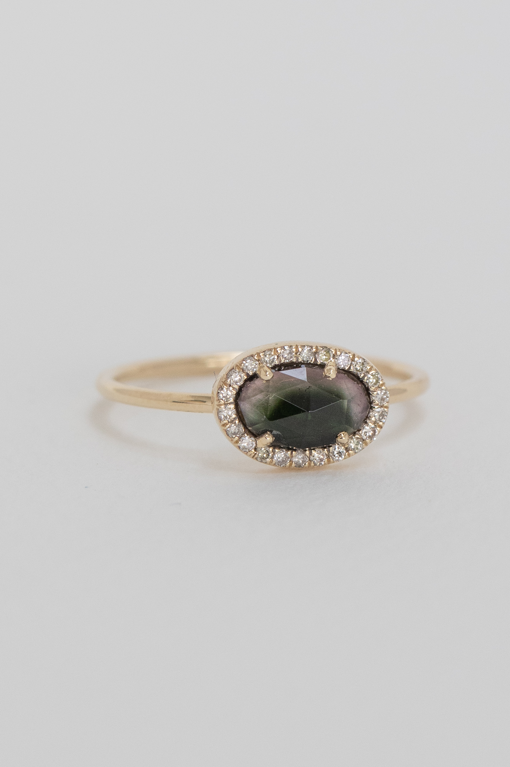 Celine Daoust 14k light yellow gold stella ring with a tourmaline surrounded by diamonds. The stone comes in a gradient of pink and green.