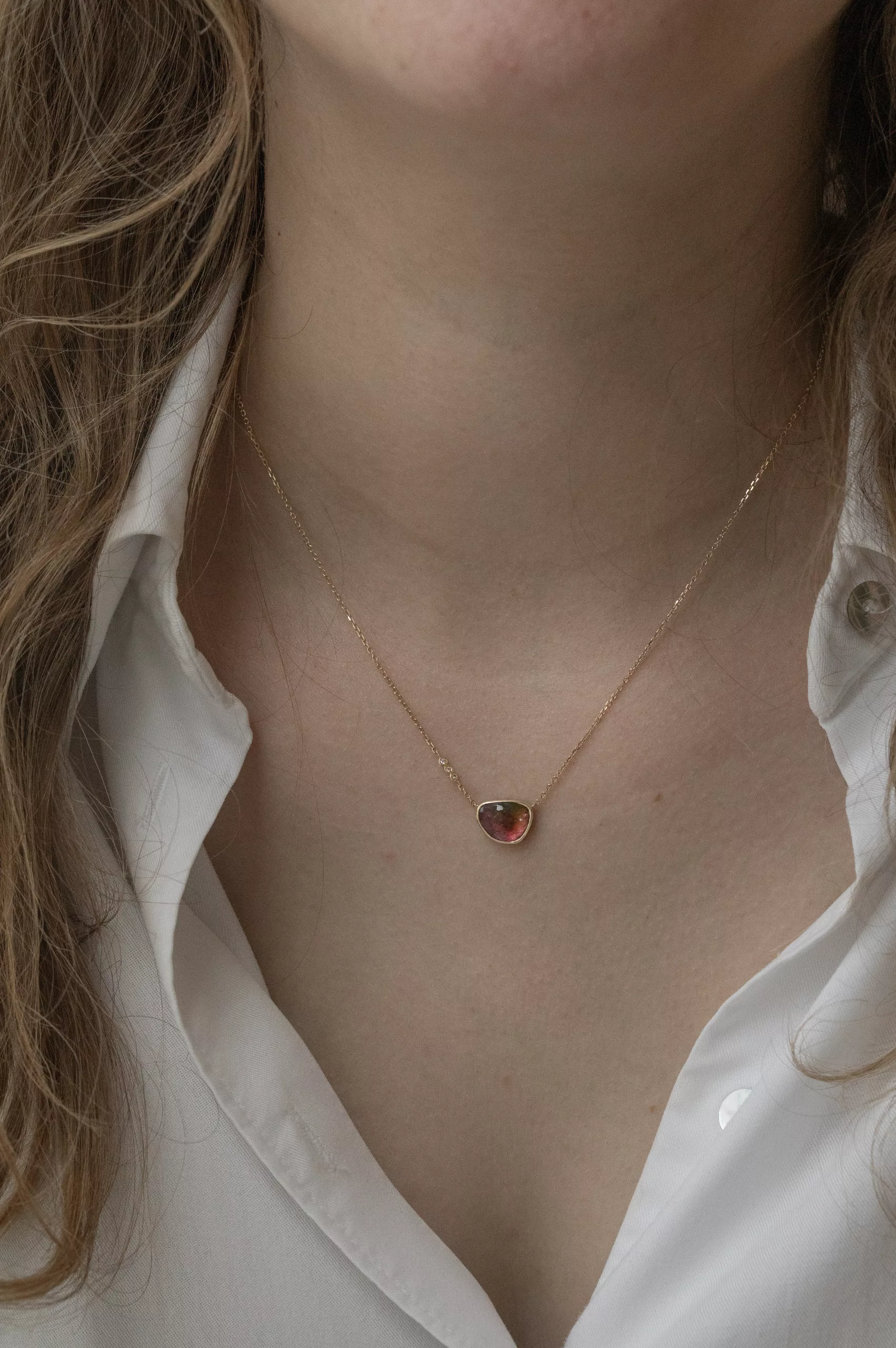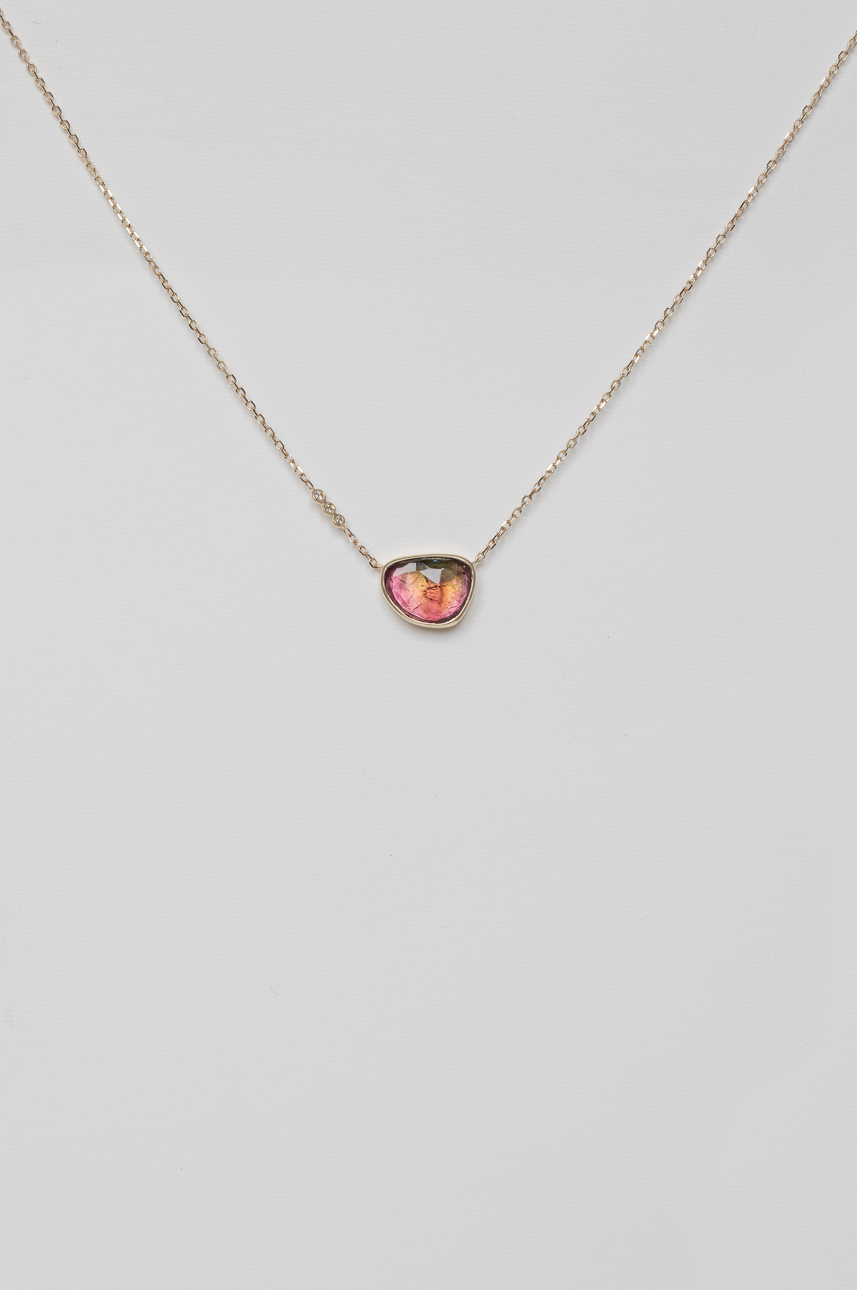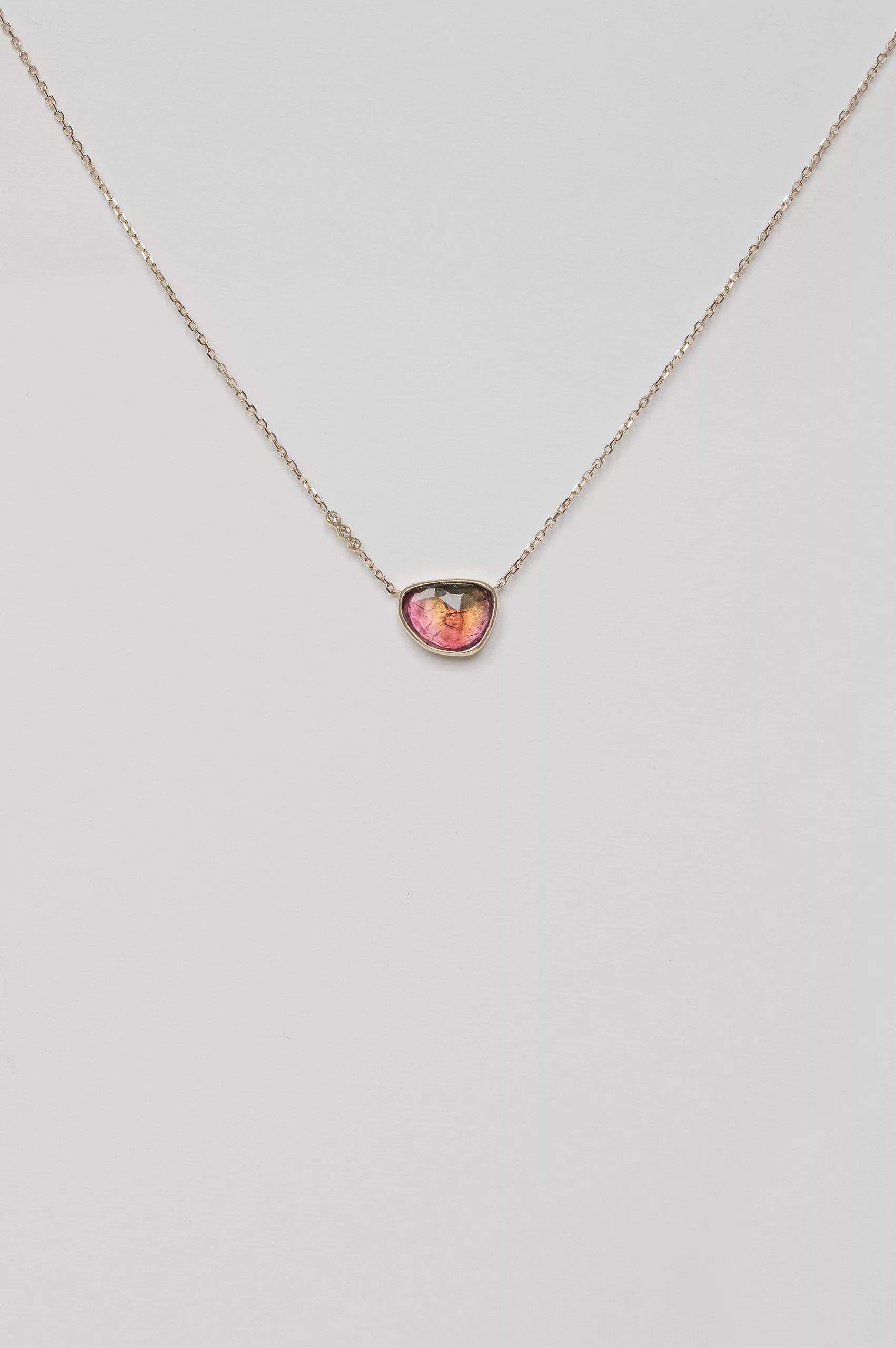 Céline Daoust 14k light yellow gold chain necklace with a pendant set with one watermelon tourmaline and three diamonds. The stone comes in a gradient of light pink and blue hues.