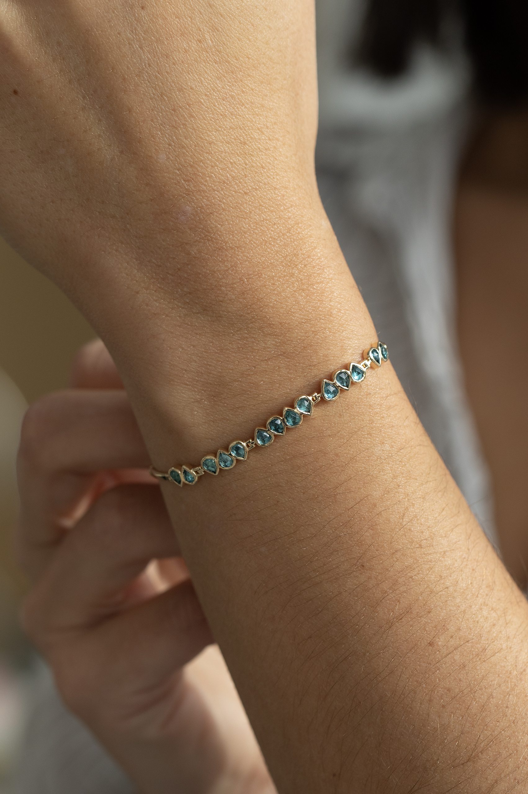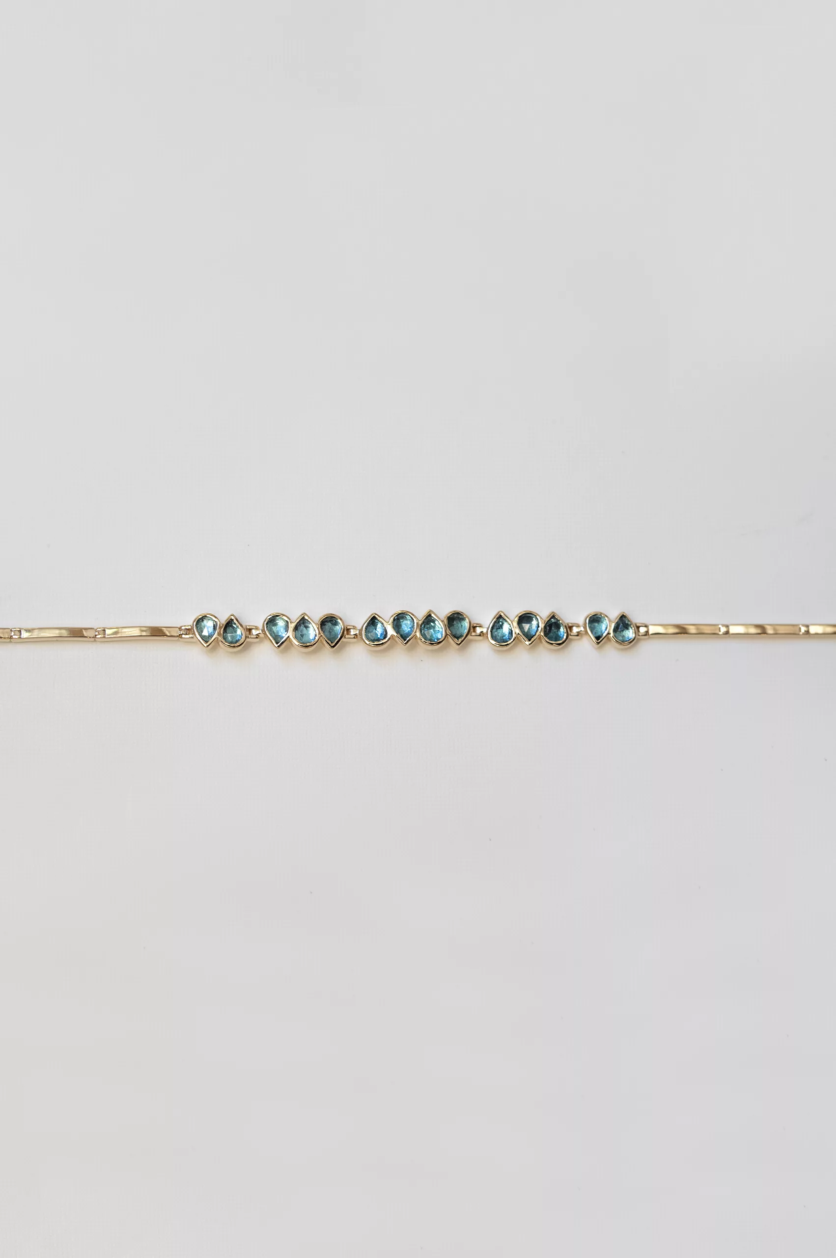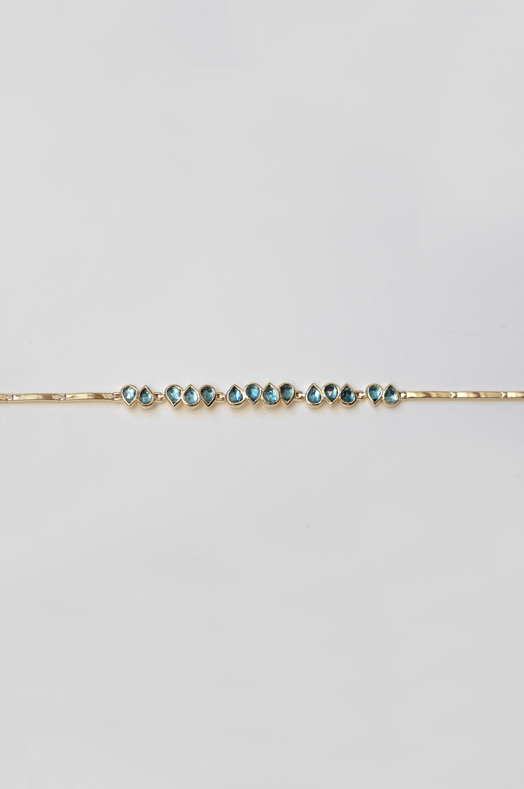 Celine Daoust 14k light yellow gold articulated bracelet with turquoise tourmalines. The stones come in a gradient of blue and green.